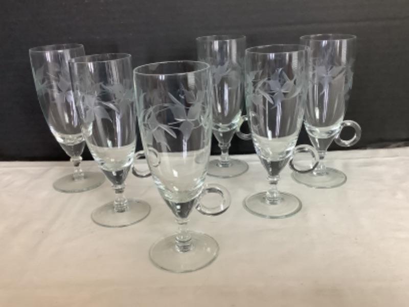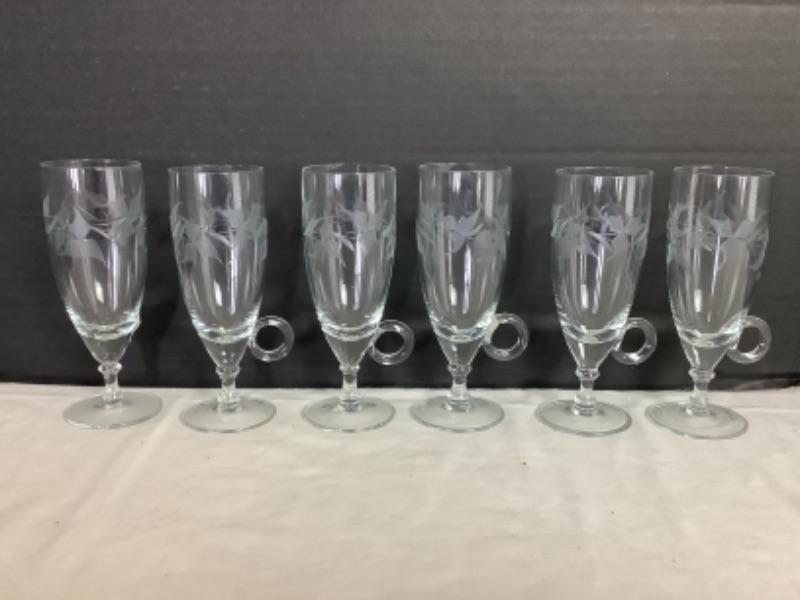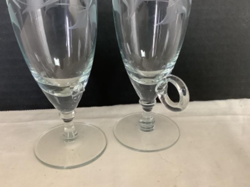 Glasses are 6-1/4” tall. One is missing its finger loop and one has been glued (see photos)