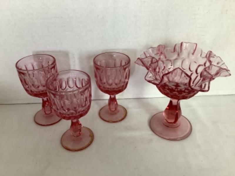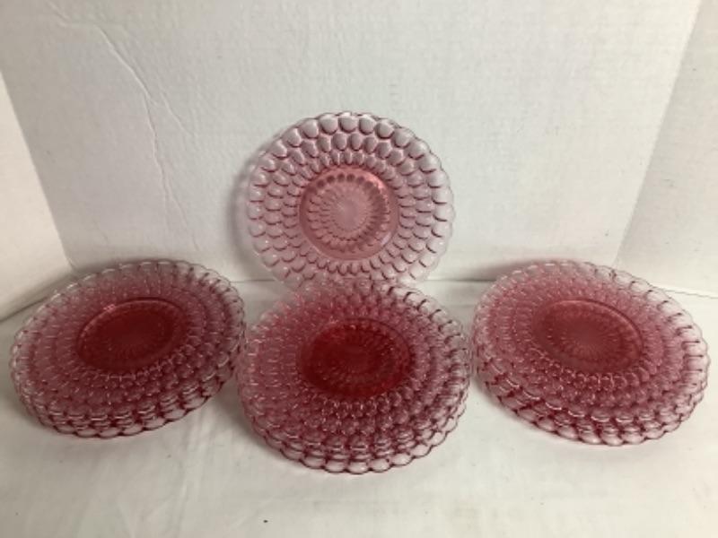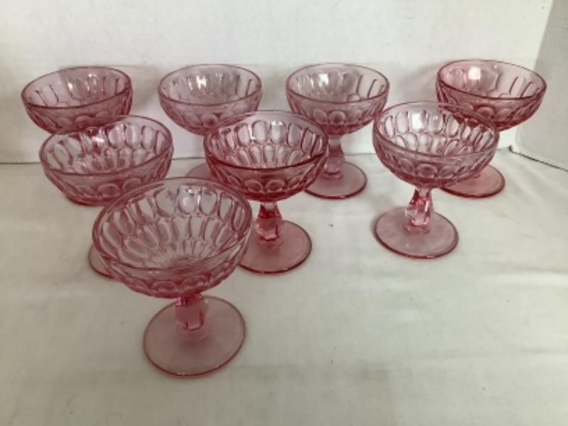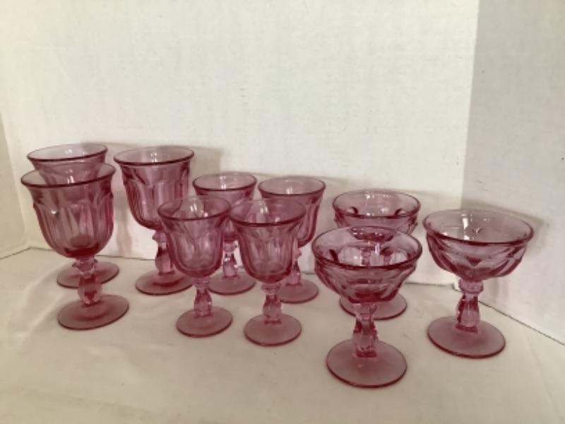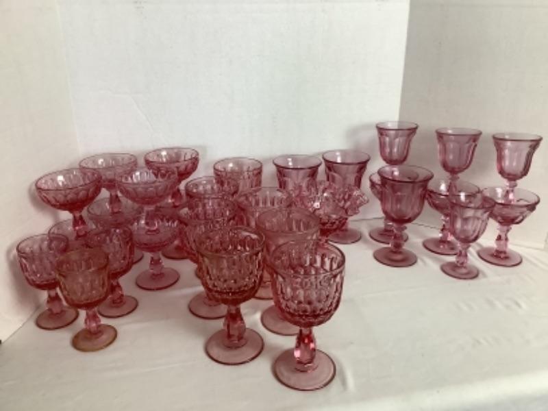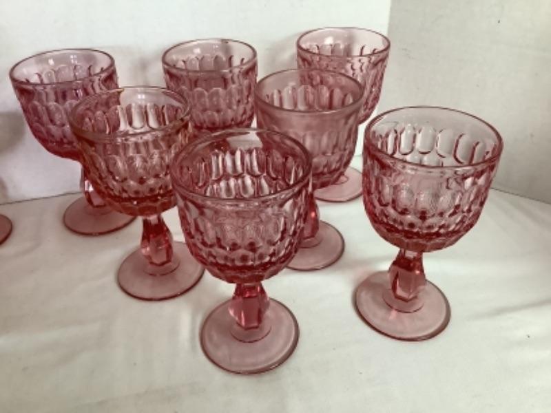 39 pieces total of Pink pressed glass. All in good condition, no chips or cracks. 10 salad/dessert plates measuring 8-1/2” and 29 pieces of stemware