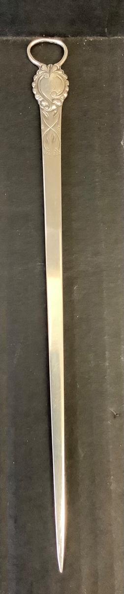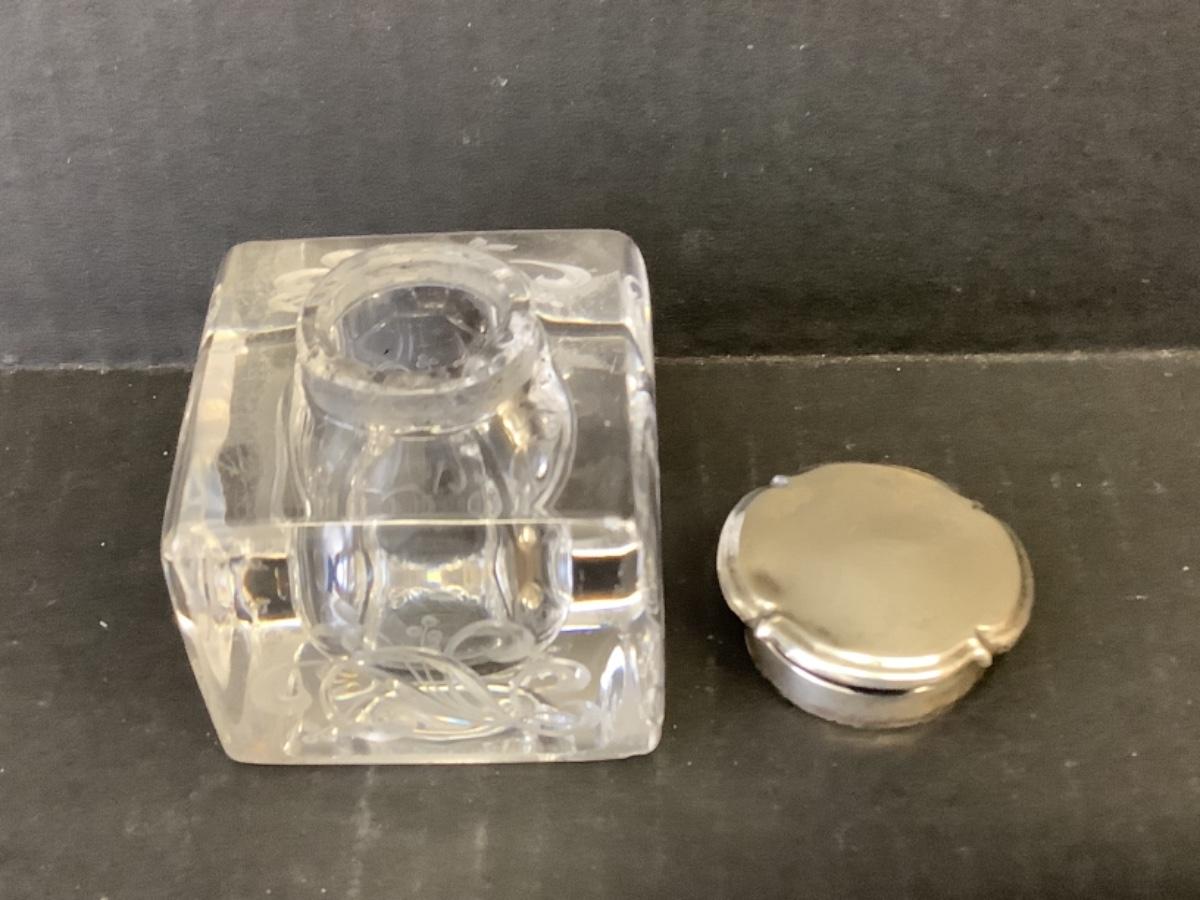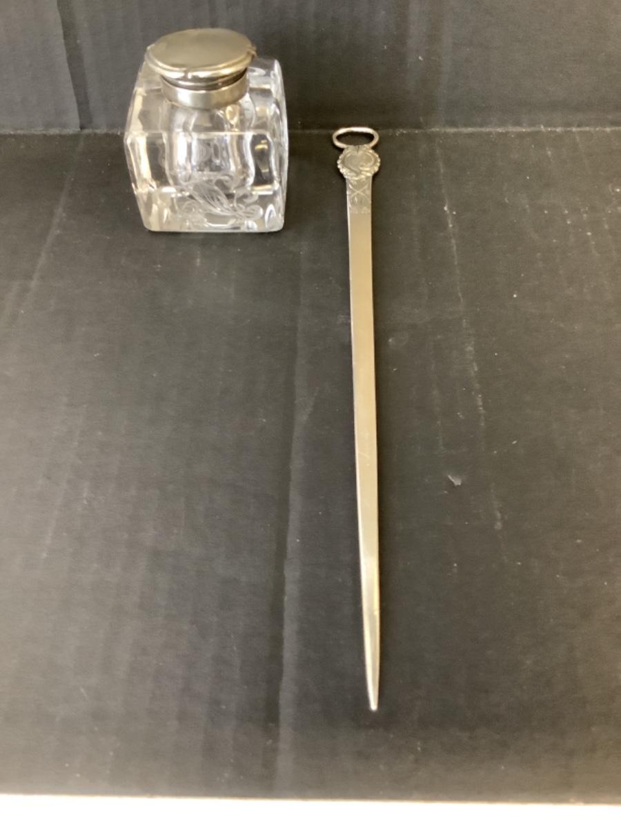 Antique sterling silver etched glass inkwell measures 2-1/2” x 2-1/2” x 2-1/2”, top is not attached to bottle, Letter Opener measures 11” long