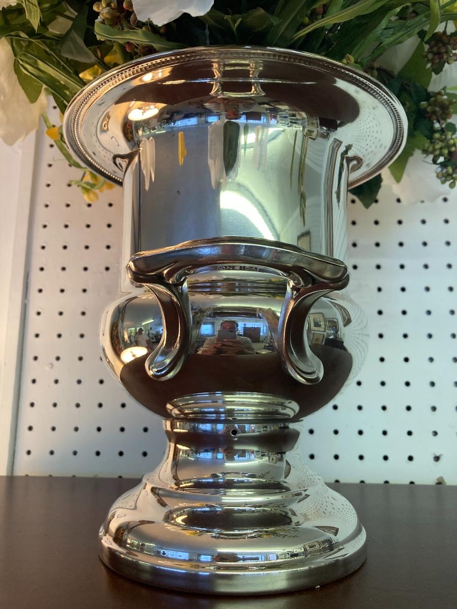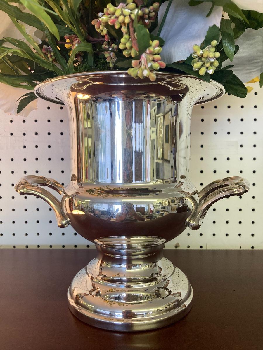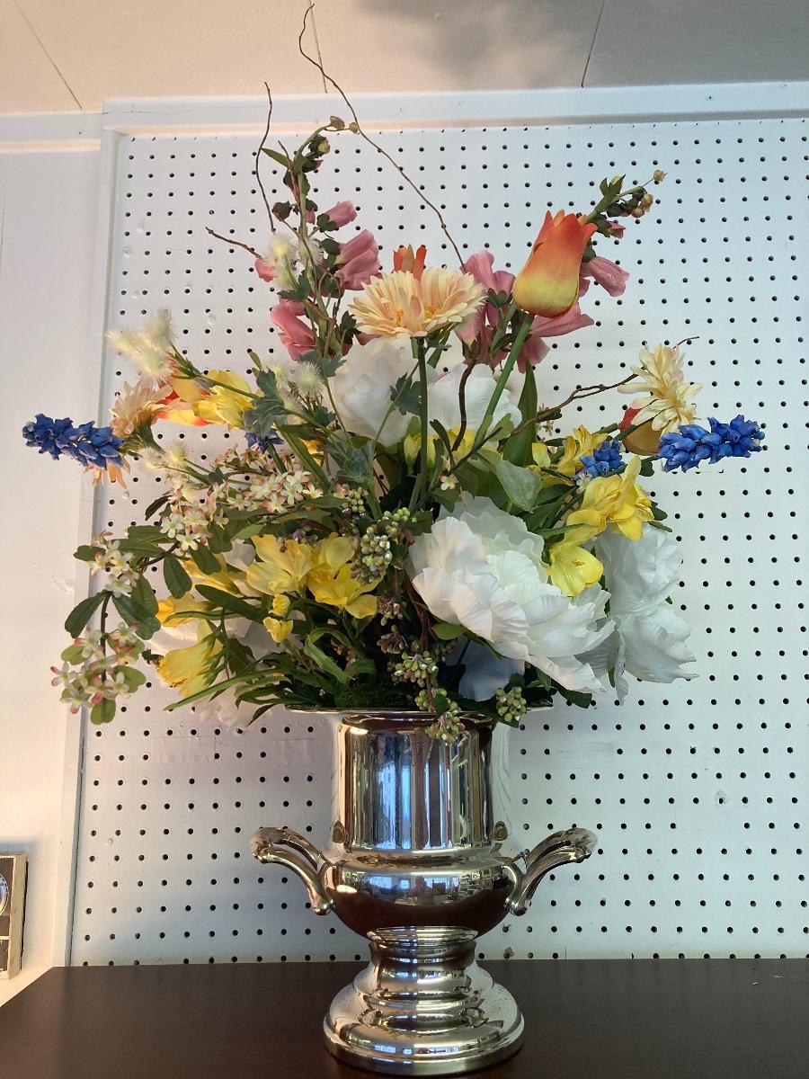 C2259 Silver Plate Trophy Cup Style Vase with Faux Flowers