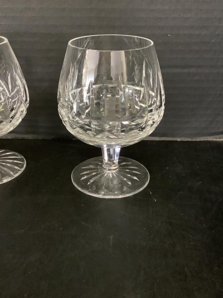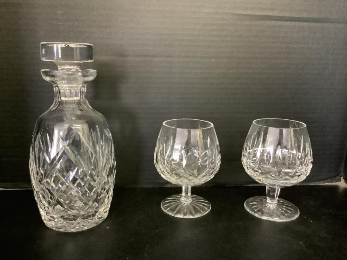 Beautiful Waterford spirits decanter with flat top measuring 9” high with 2 brandy snifters 1- Kylemore, 1- Lismore