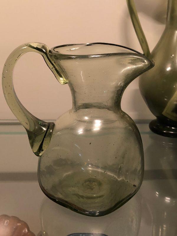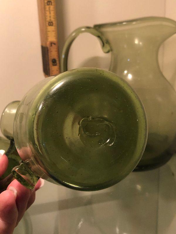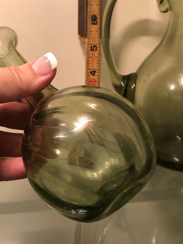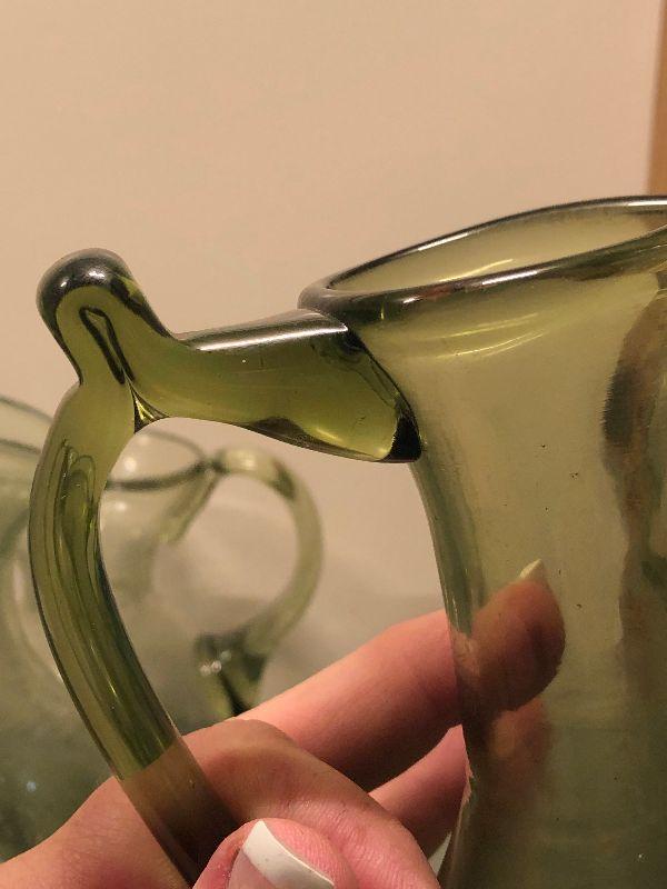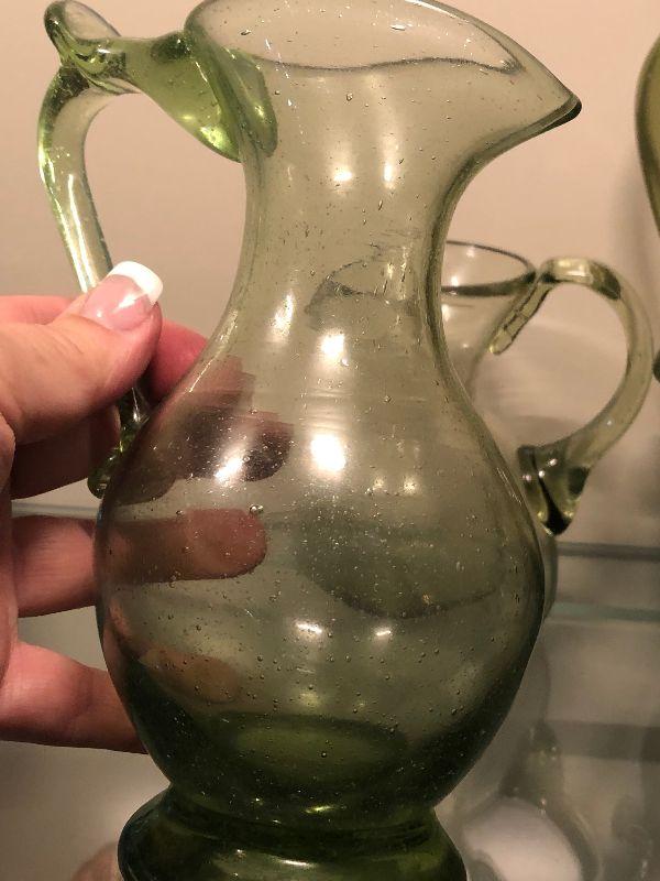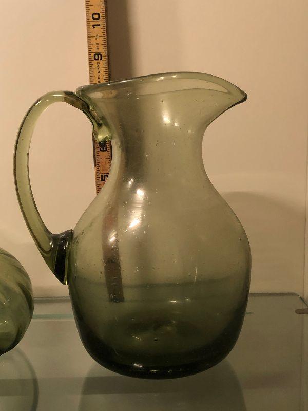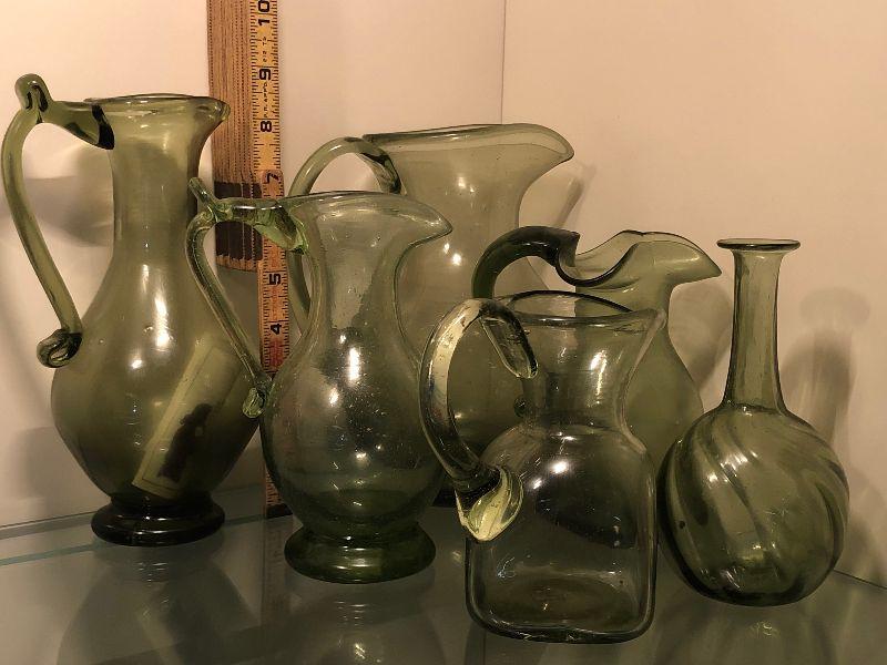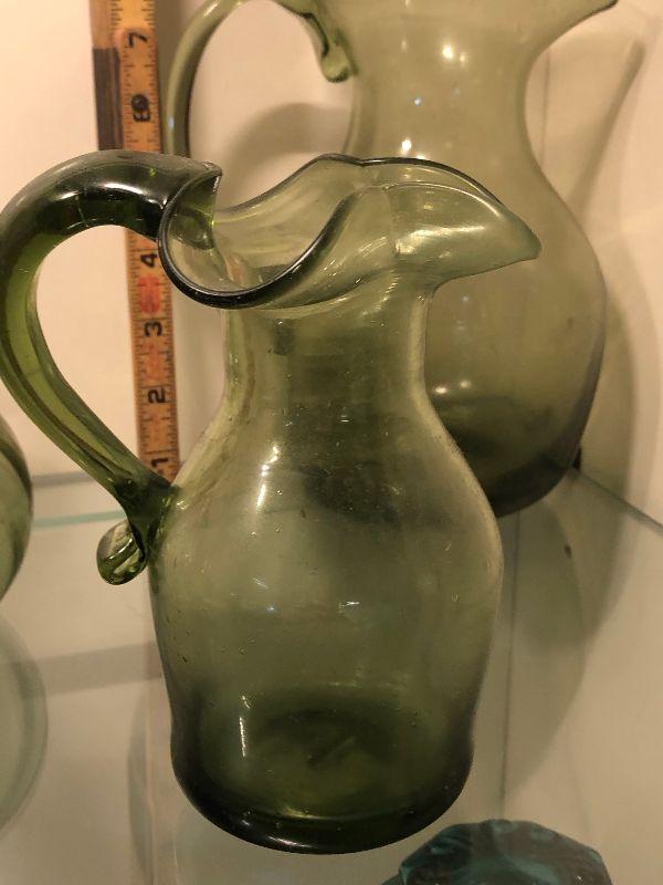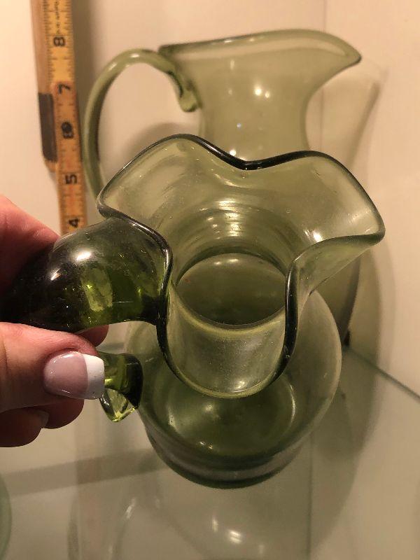 Five pitchers and a vase of green glassware. No chips. Bring box to move.