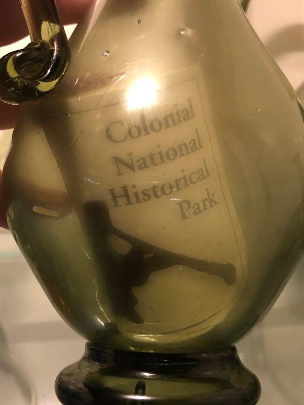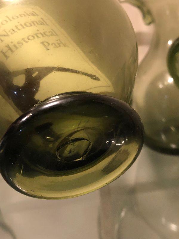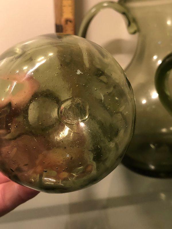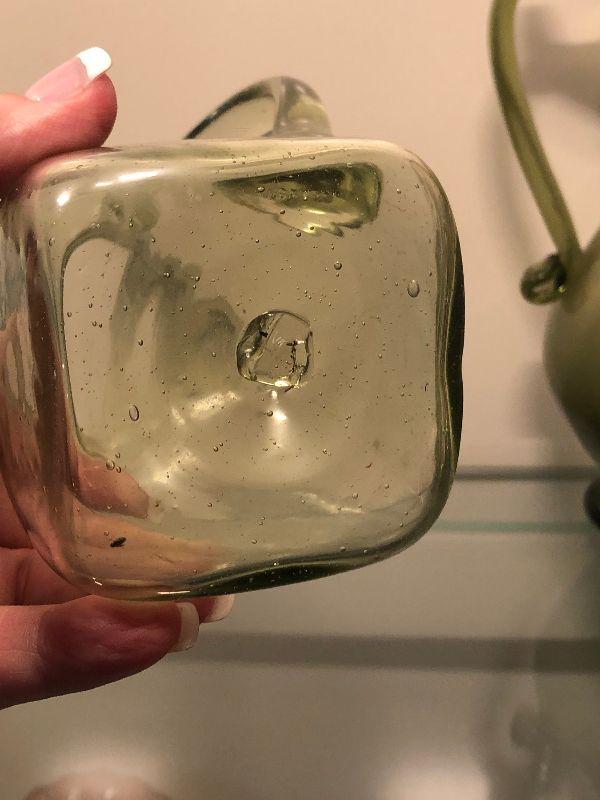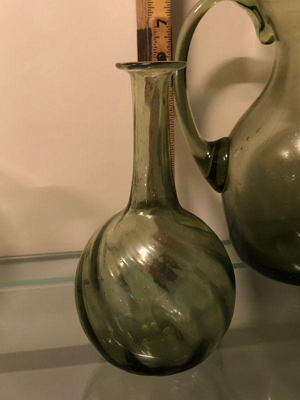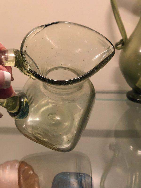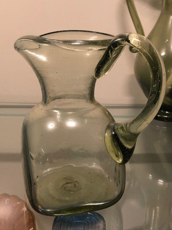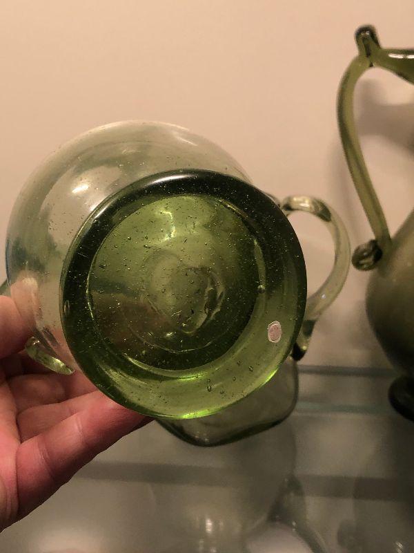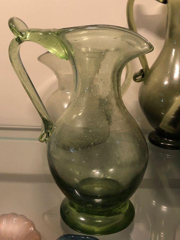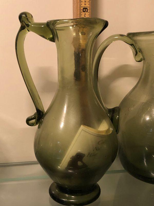 Five pitchers and a vase of green glassware. No chips. Bring box to move.