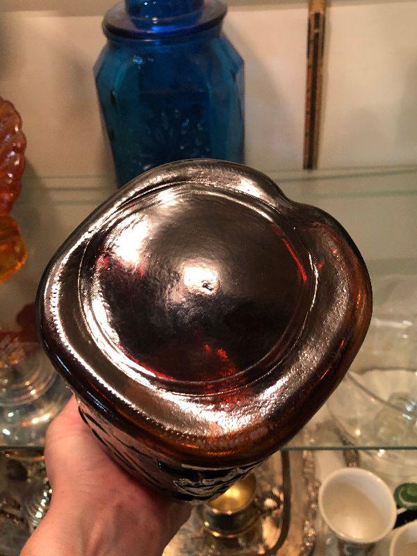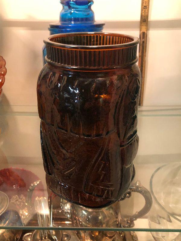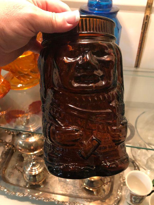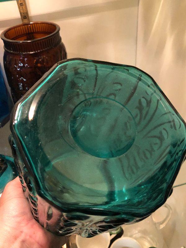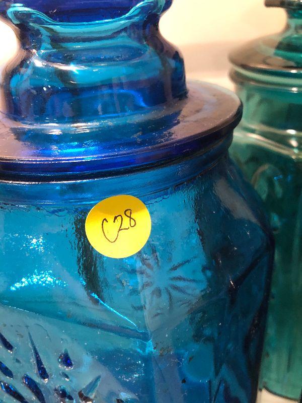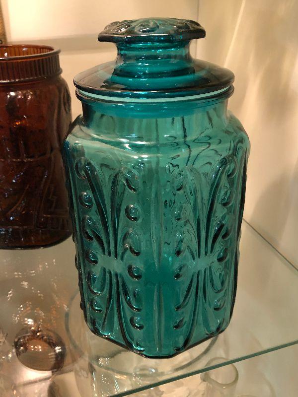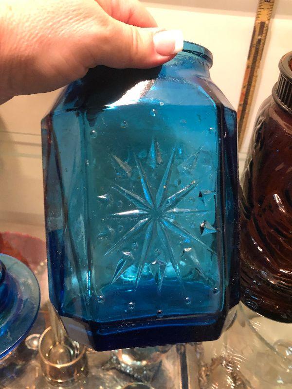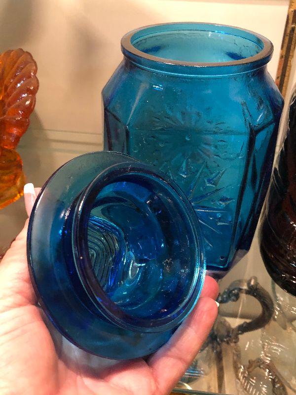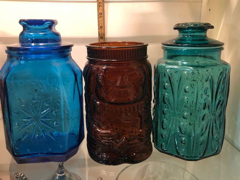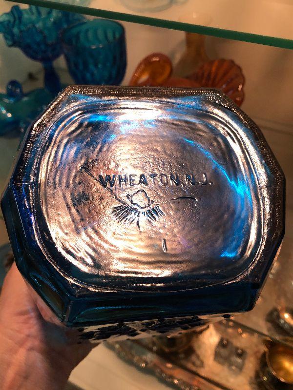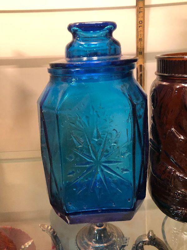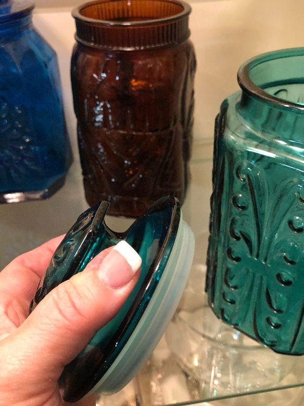 Blue glass jar with lid from Wheaton Glass, NJ, a dark amber jar with no lid, and a green, glass jar with lid.