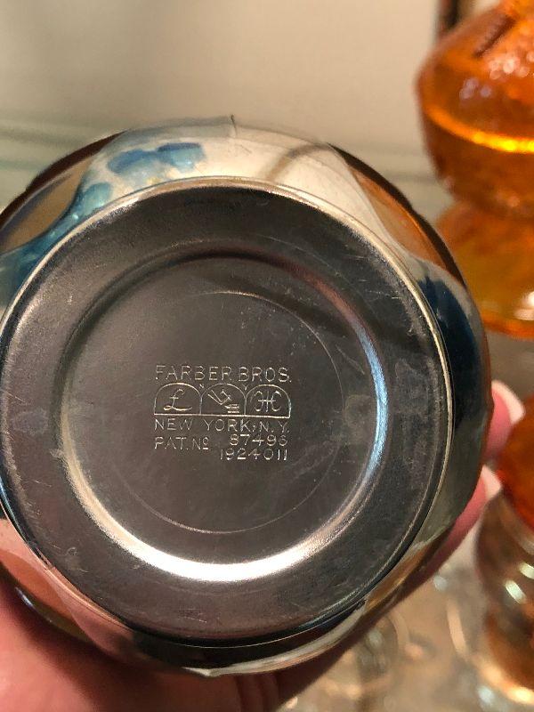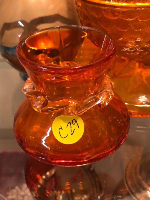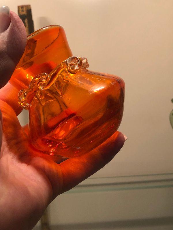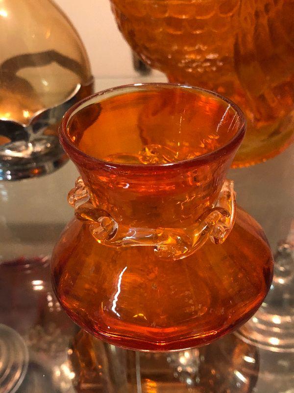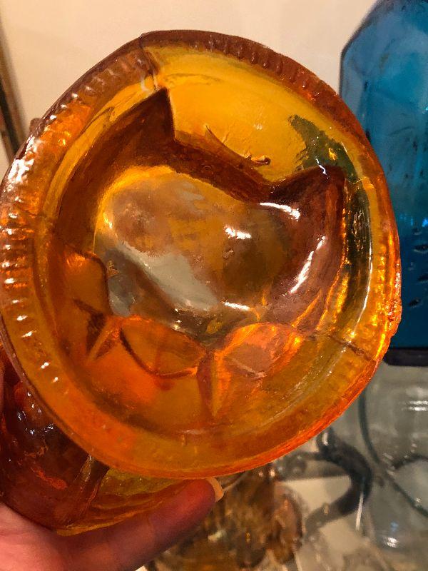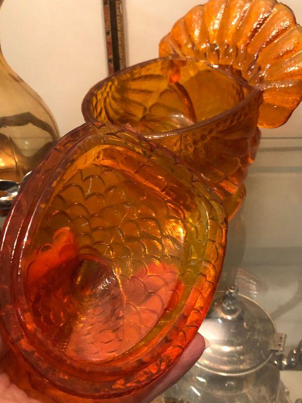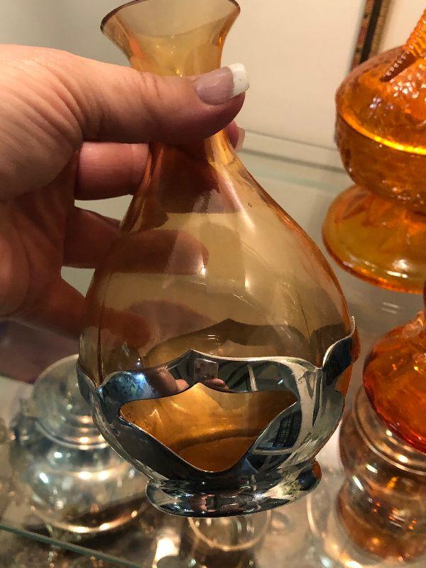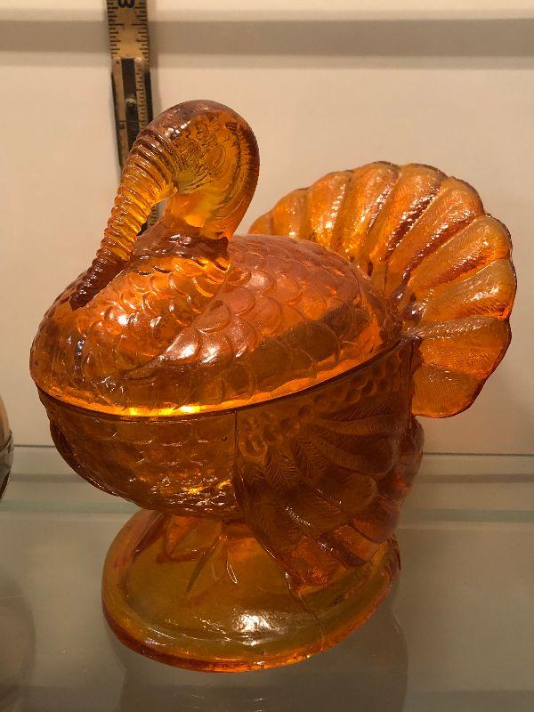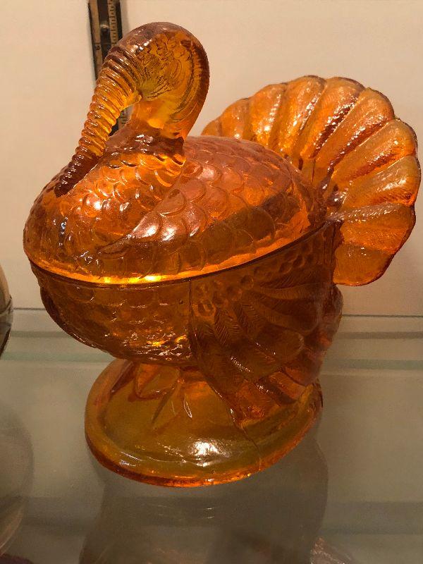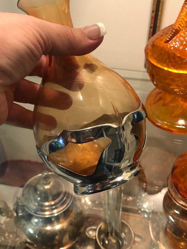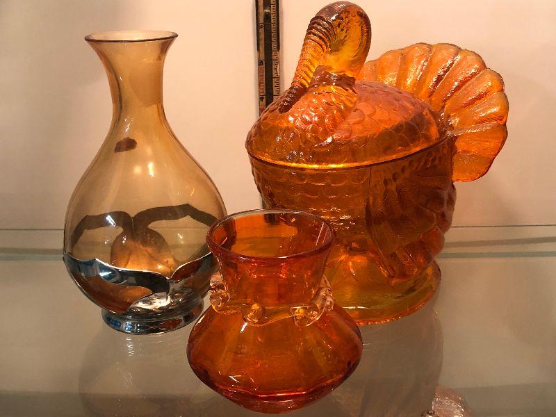 A vintage, amber glass turkey candy dish, a vase with glass ruffle, and a Farber Bros. Krome Kraft vase. Bring container to move.
