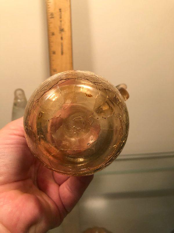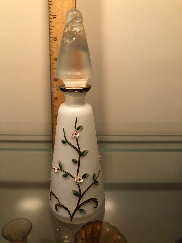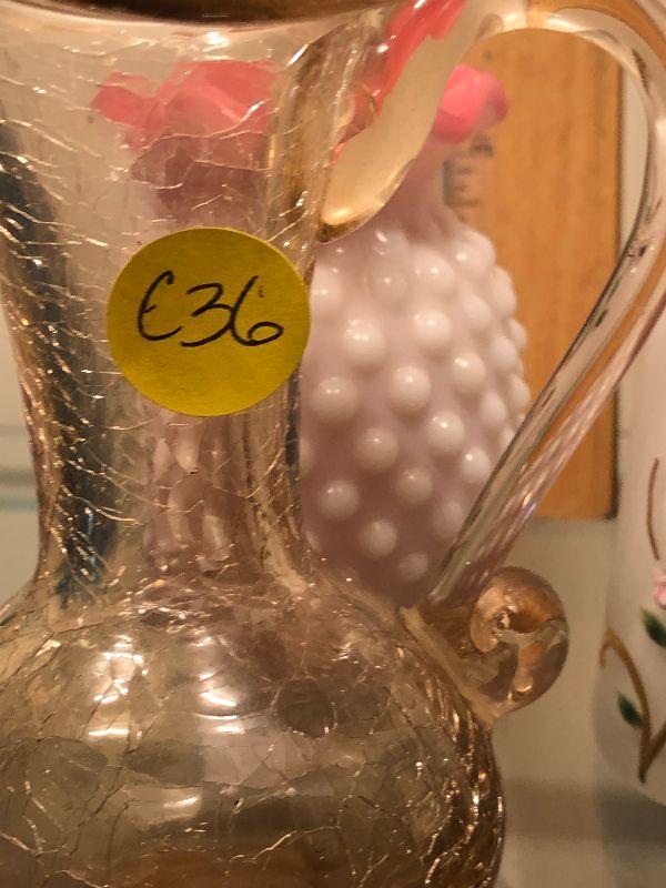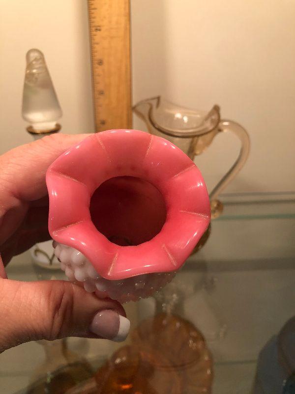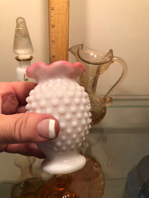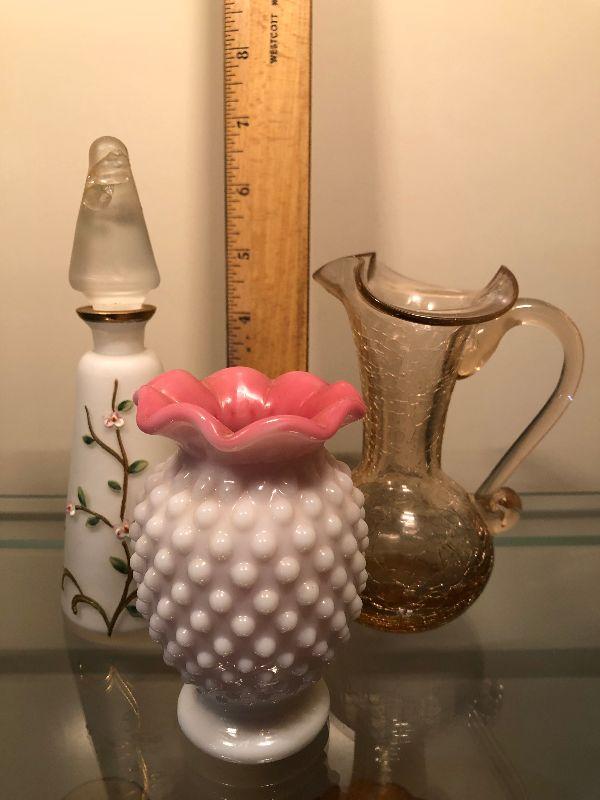 Vintage Irice perfume bottle, see picture for condition. Also, a hobnail vase with pink interior, and a crackle glass vase.