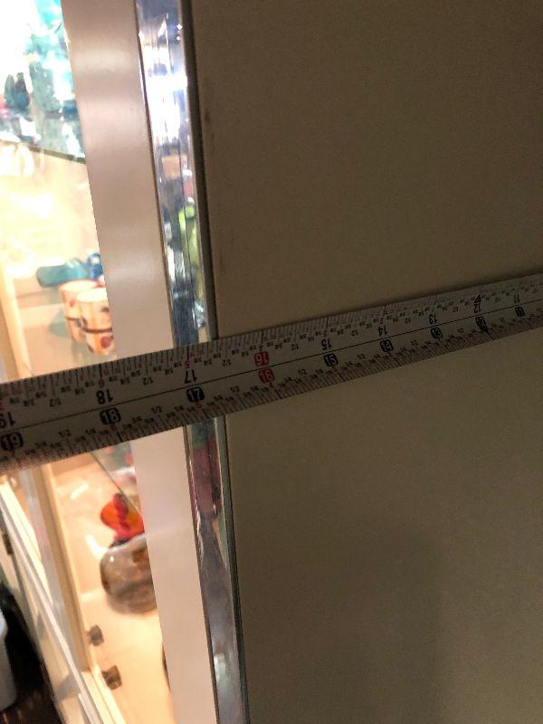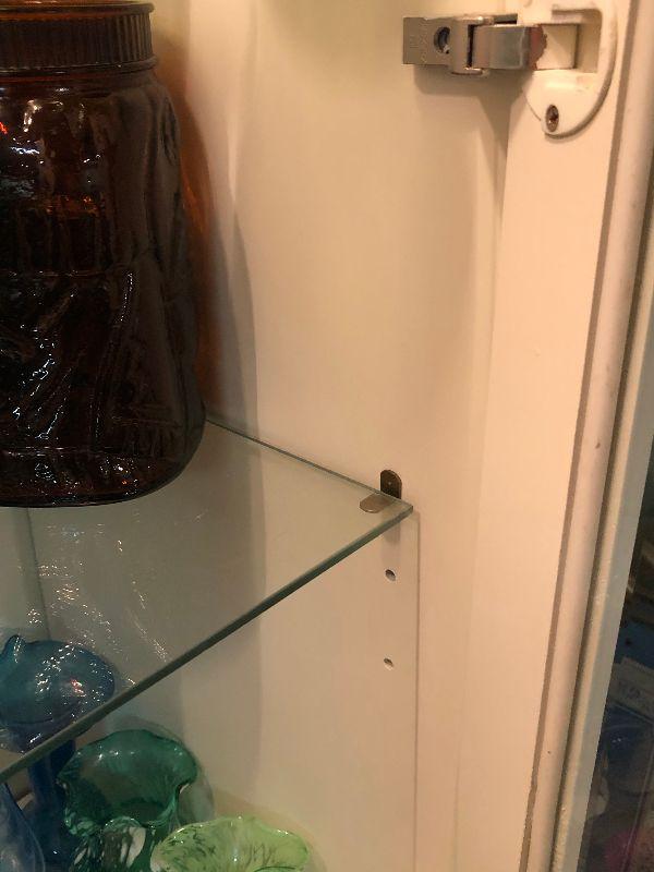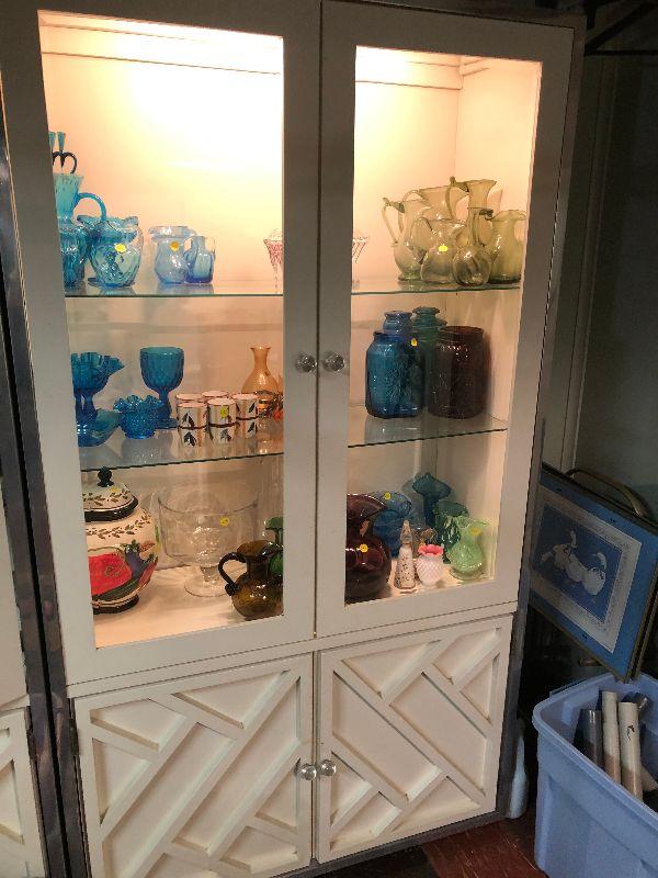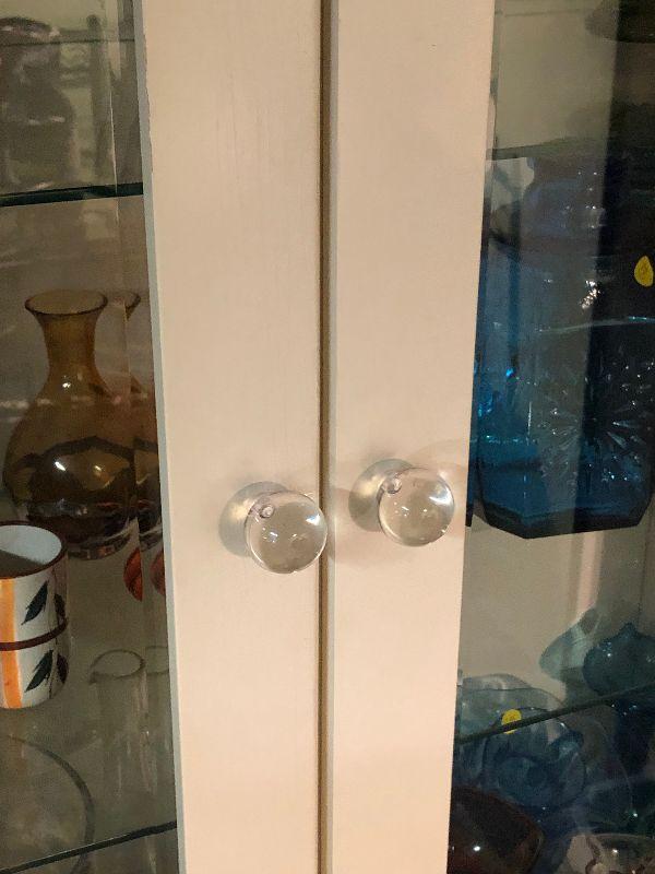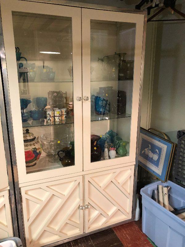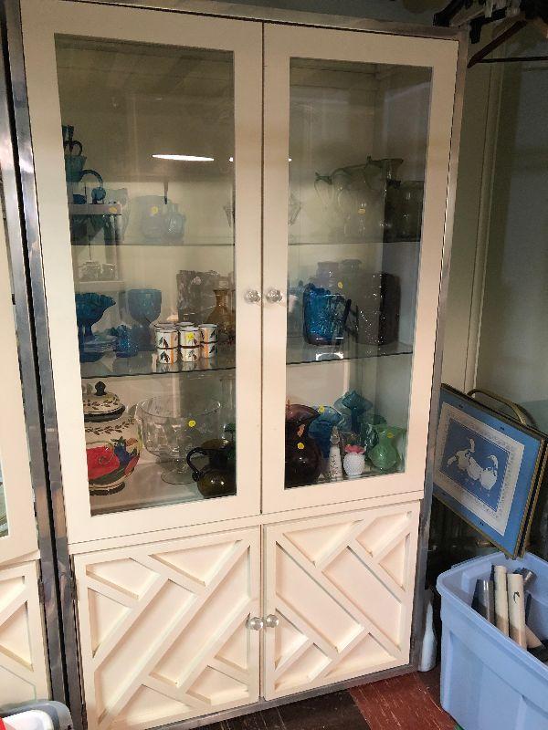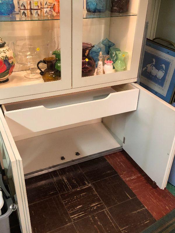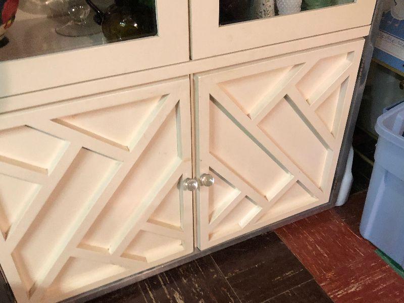 Wood cabinet with glass doors and glass shelves. Bottom is cabinet space for storage. Bring help to move.