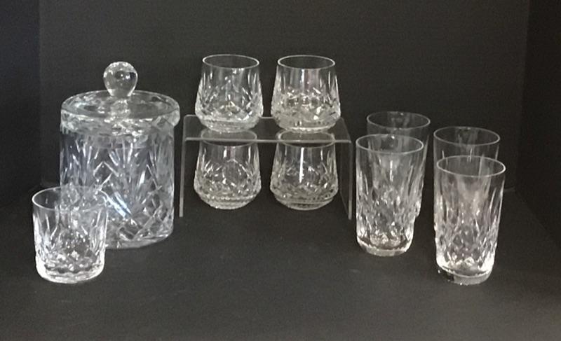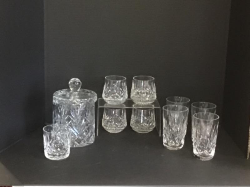 4 roly poly , 4 tall drinking glasses , one old fashioned, biscuit jar (not Waterford)