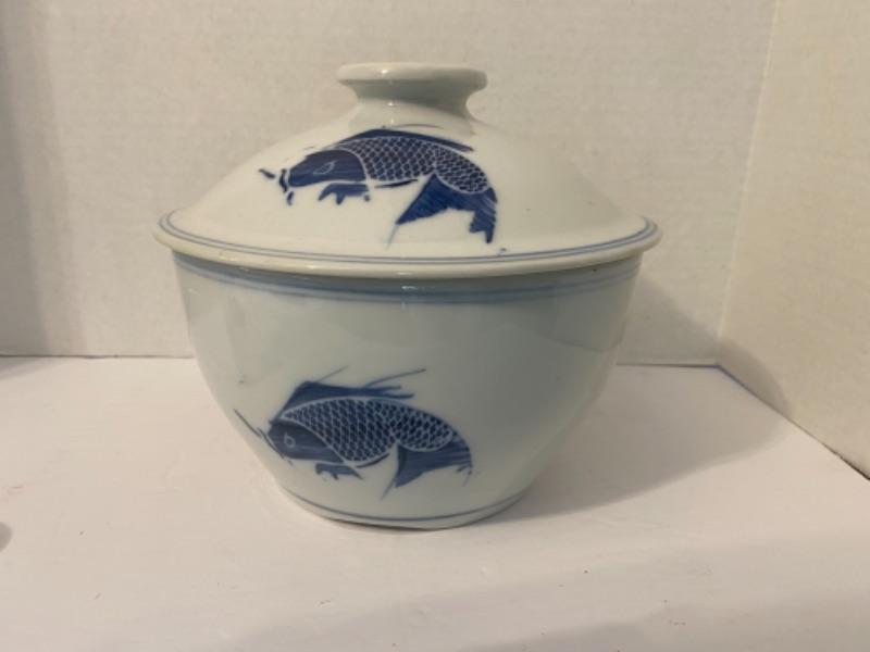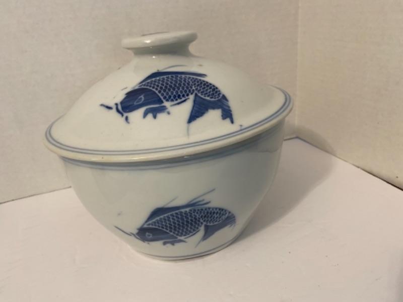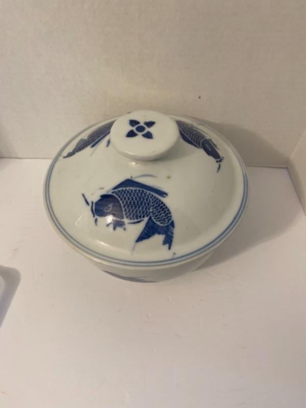 B- 508 Large Blue and White Fish Covered Porcelain Dish
