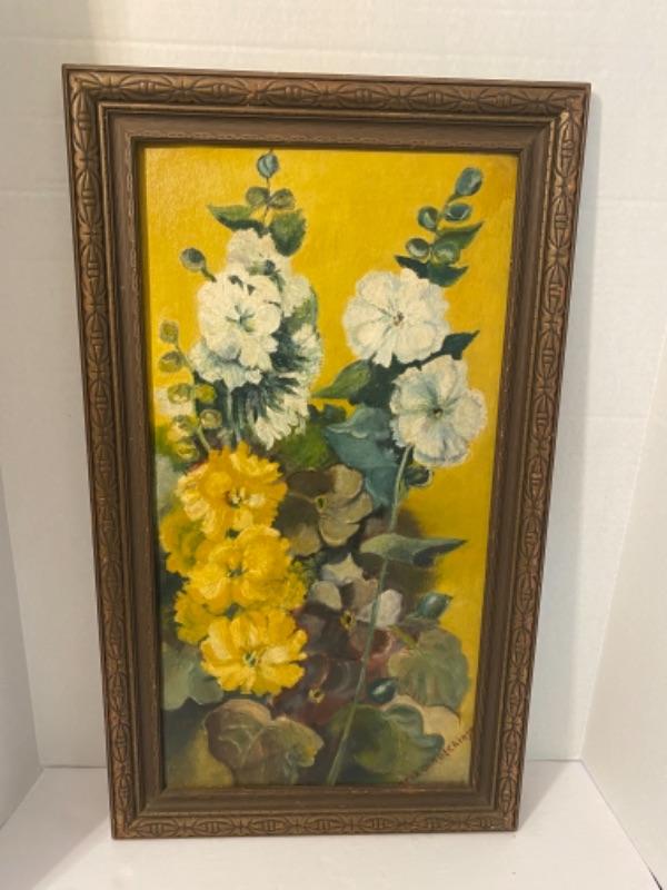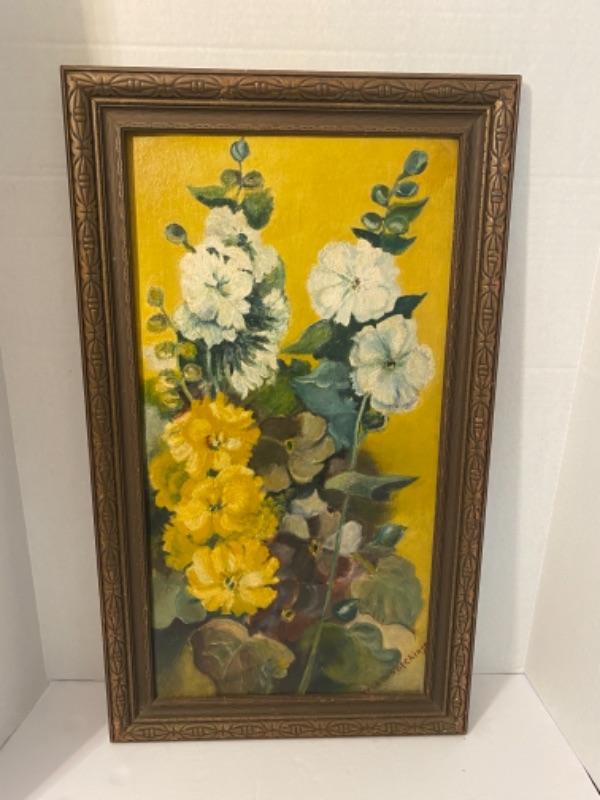 Vintage Oil on Canvas of Hollyhocks signed Myra G. Hutchings