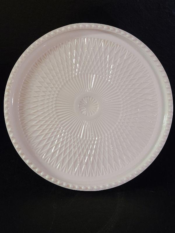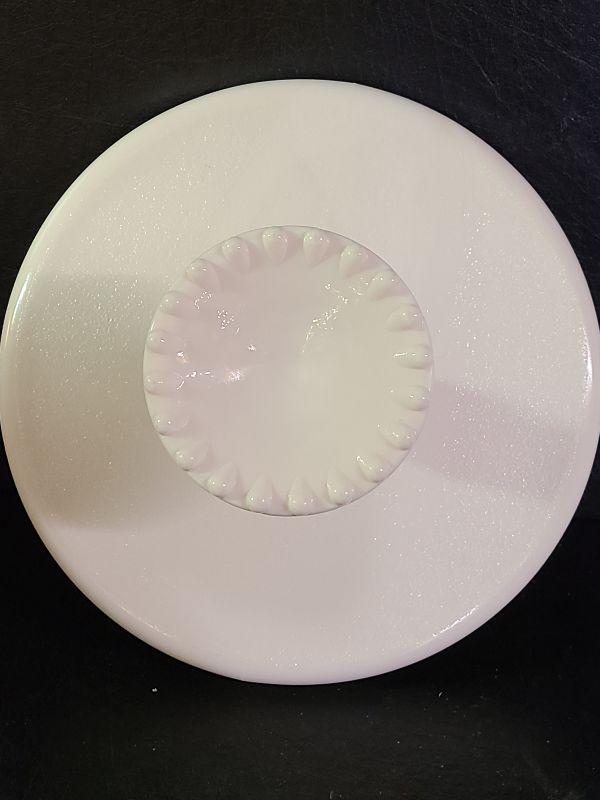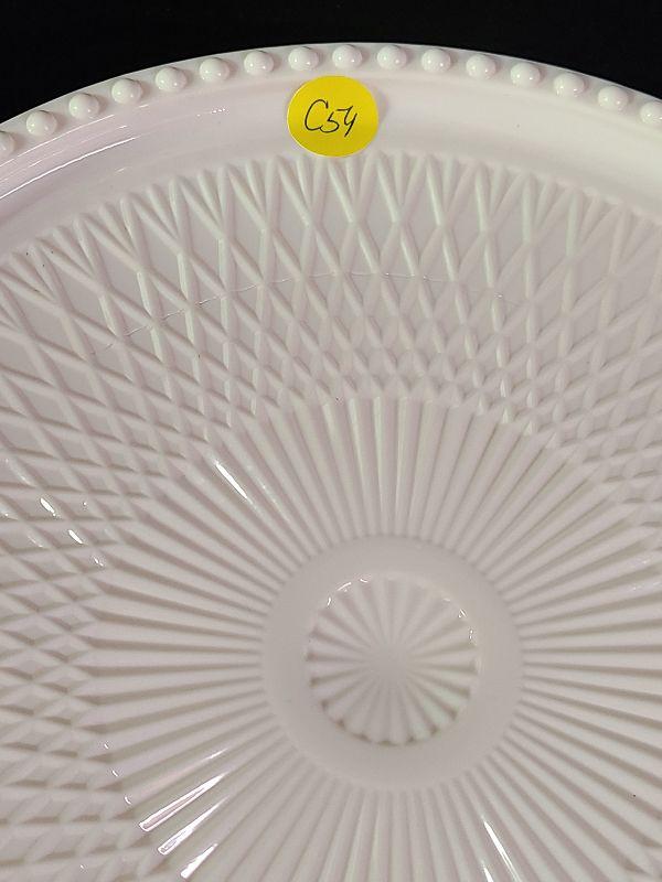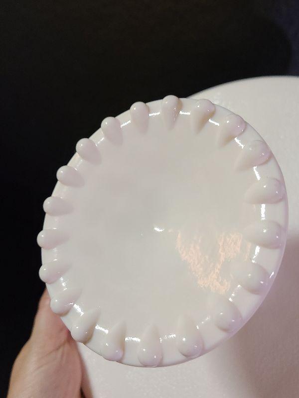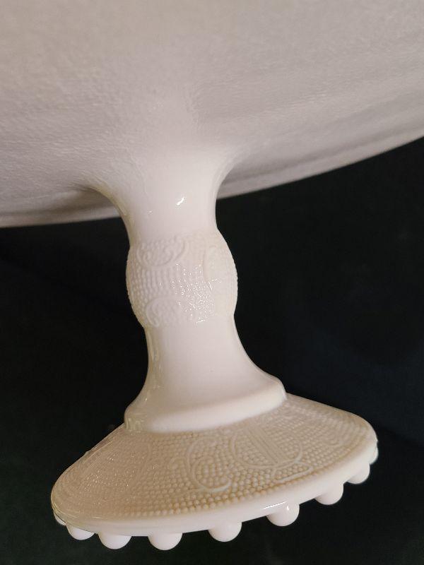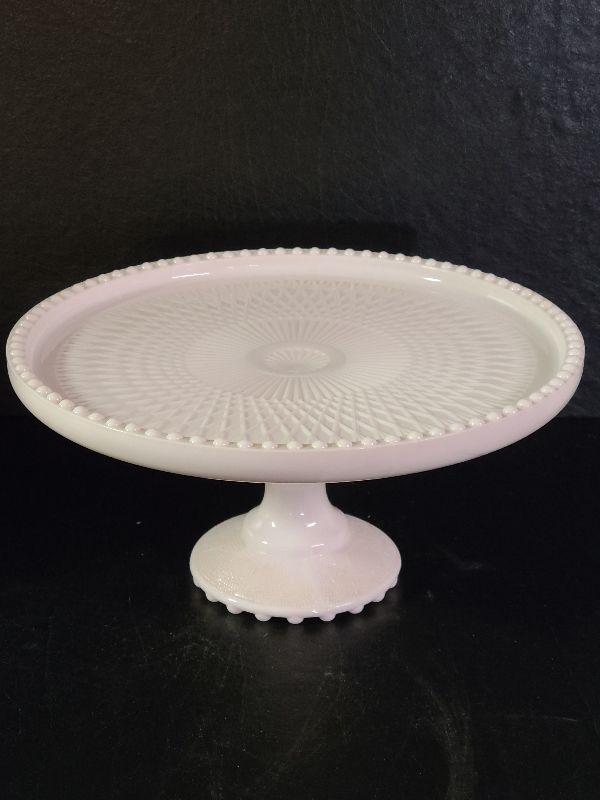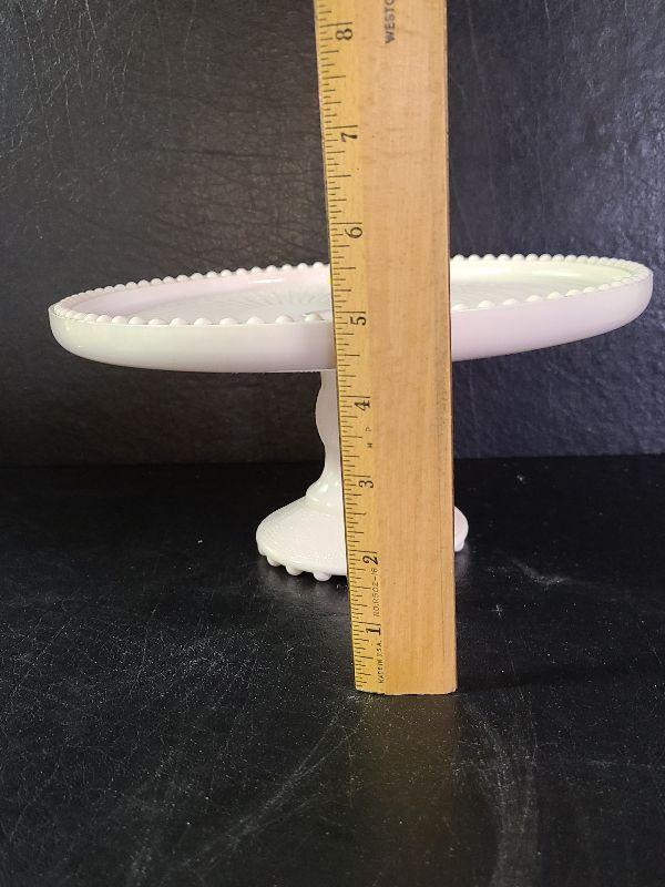 This cake stand is different than most milk glass cake stands you see! Beaded edge top and bottom! Please see pics for the sizing and amazing condition on the unique item!