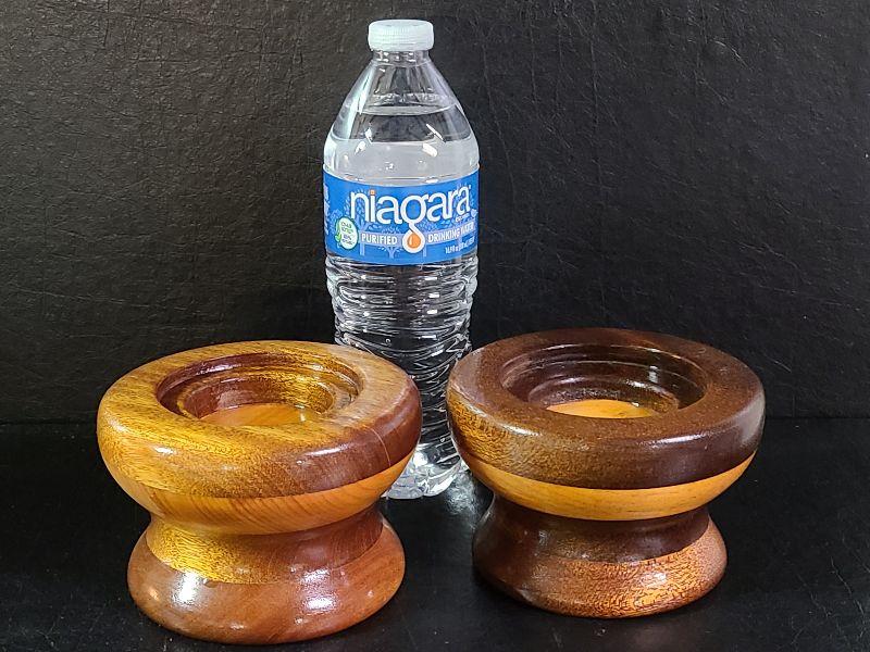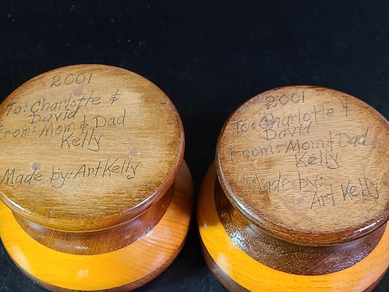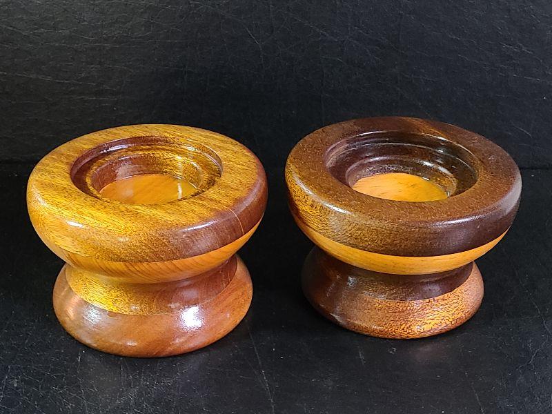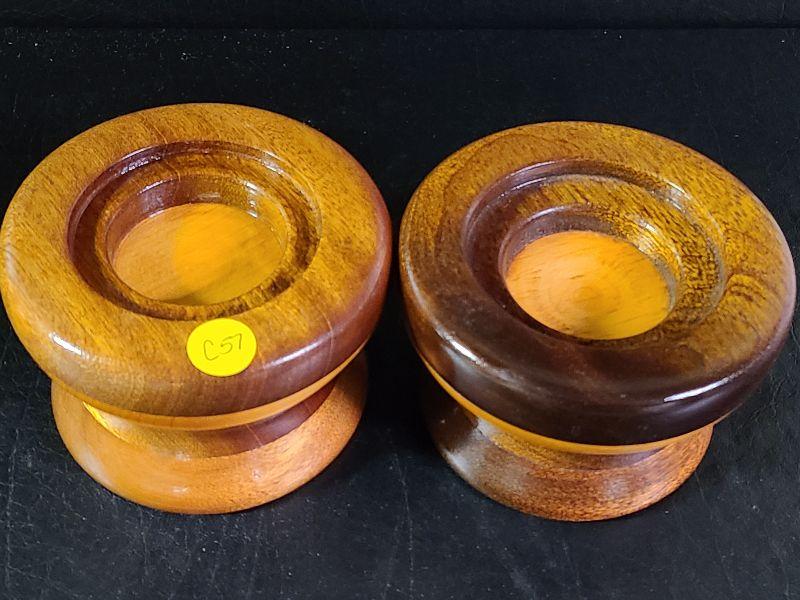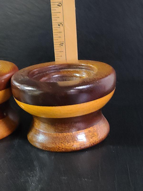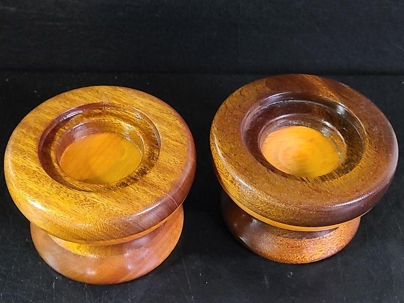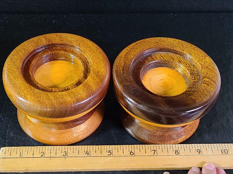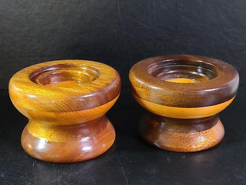These are handmade turned wood candle holders! You can actually use to hold anything! Signed on bottom, but for fresh look you can sand off. Please see pics for sizing and condition