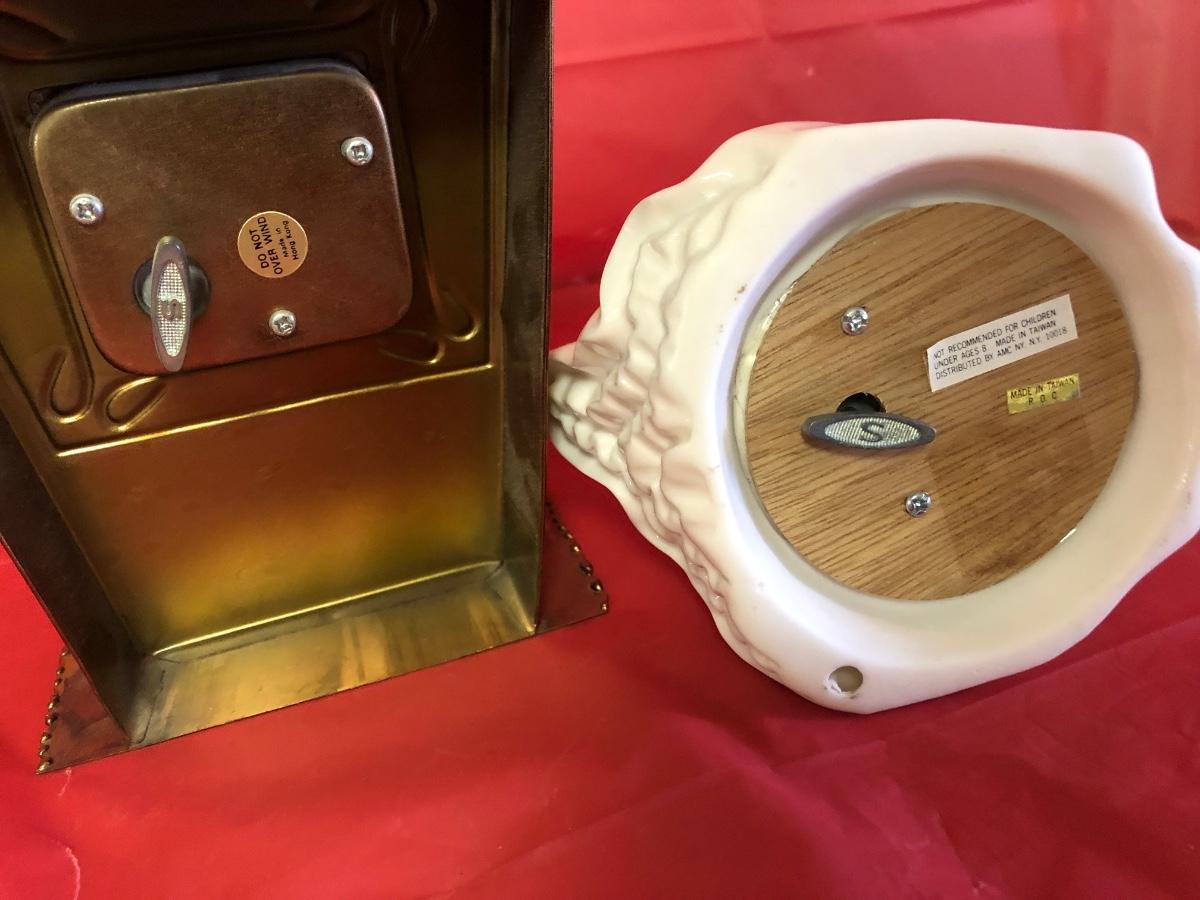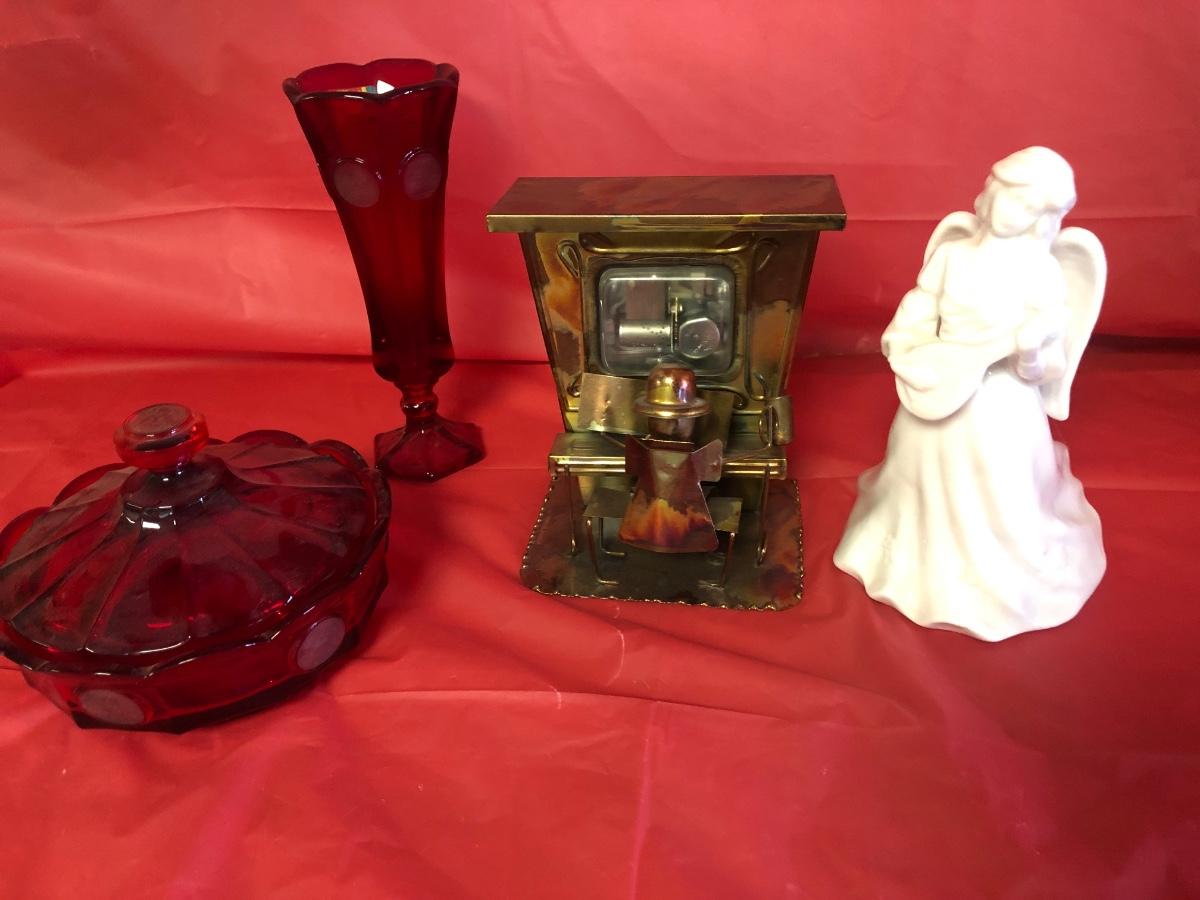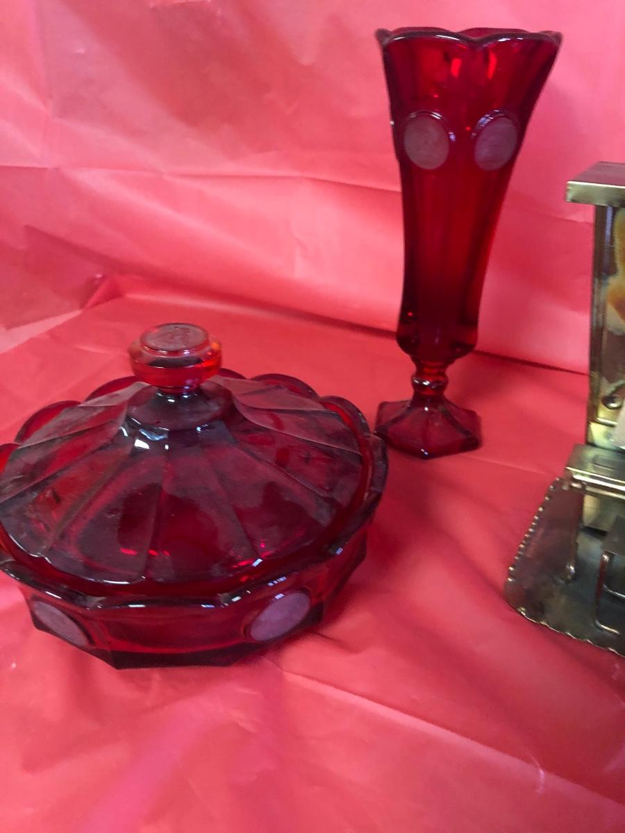 C60- Fostoria Red Candy Dish, Vase & 2 Music Boxes