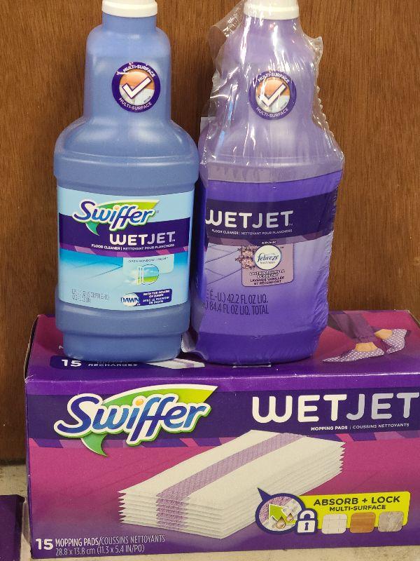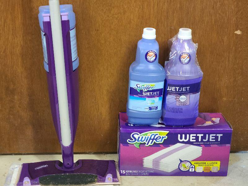 Swiffer wet jet mop, detergent and wet jet disposable mop covers. Please see all pictures for exact contents of the lot, condition of the items, and if measurements if taken. Thank you for looking and have fun bidding.