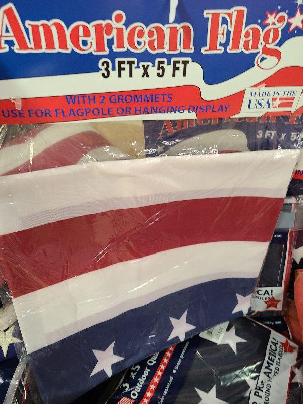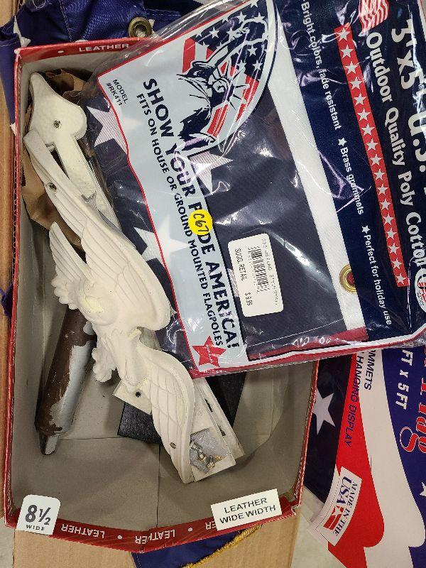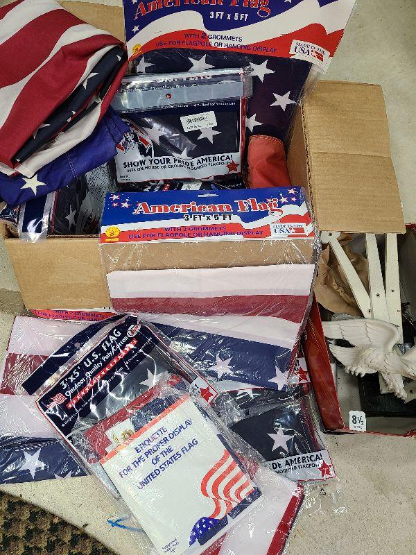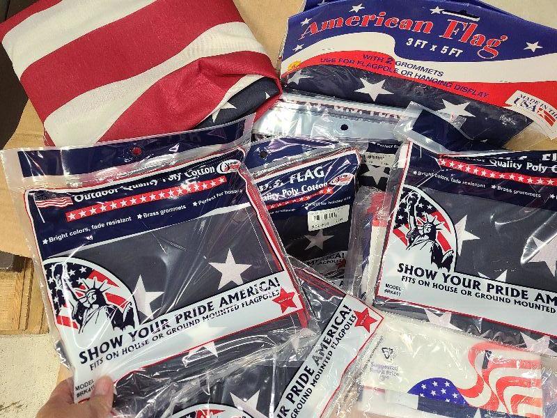 Box of American flags, All new in packaging. Please see all pictures for exact contents of the lot, condition of the items, and if measurements if taken. Thank you for looking and have fun bidding.