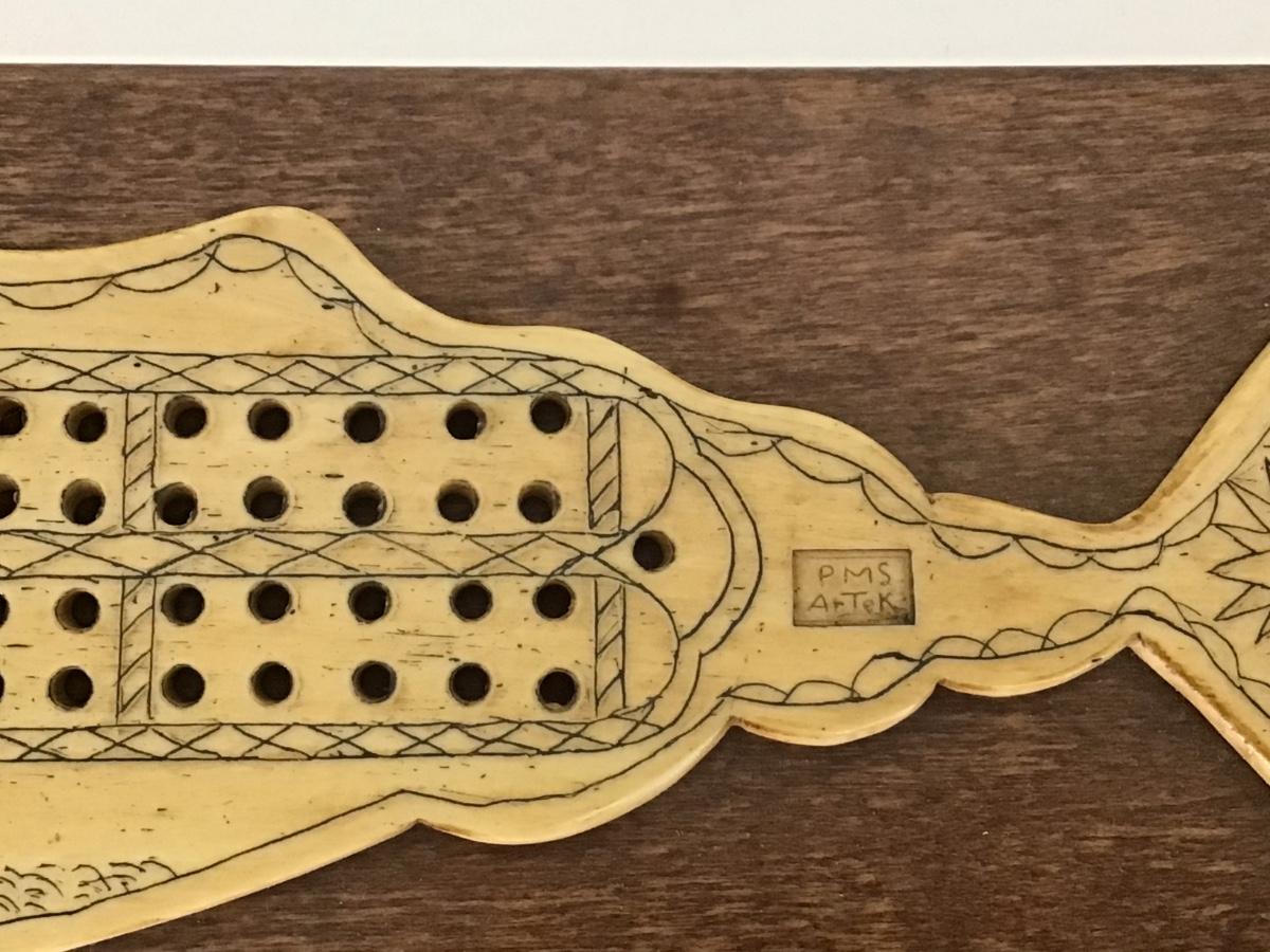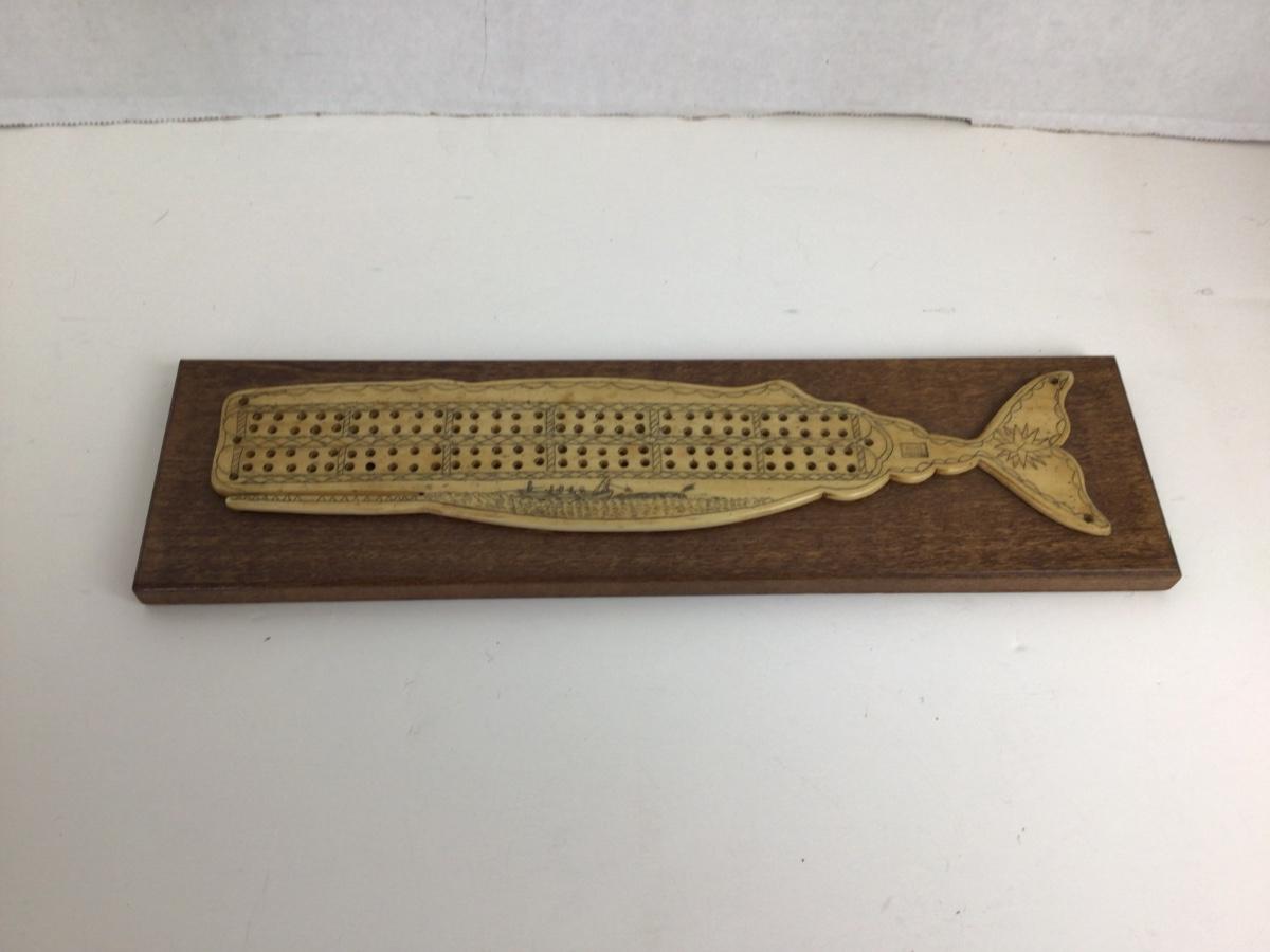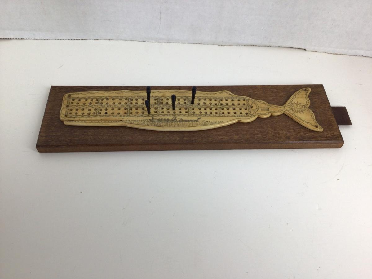 Reproduction whale board scrimshaw has a total of 5 pegs