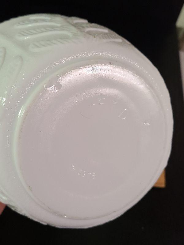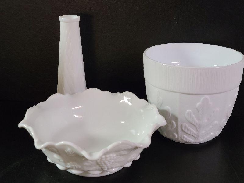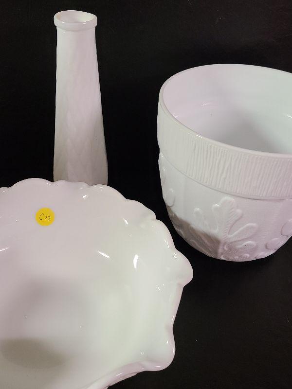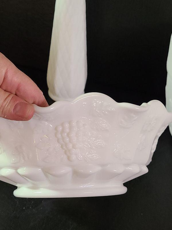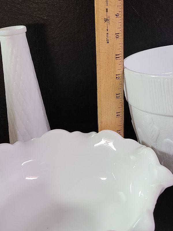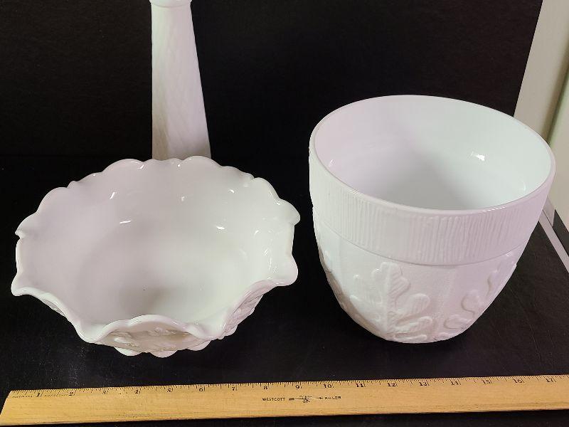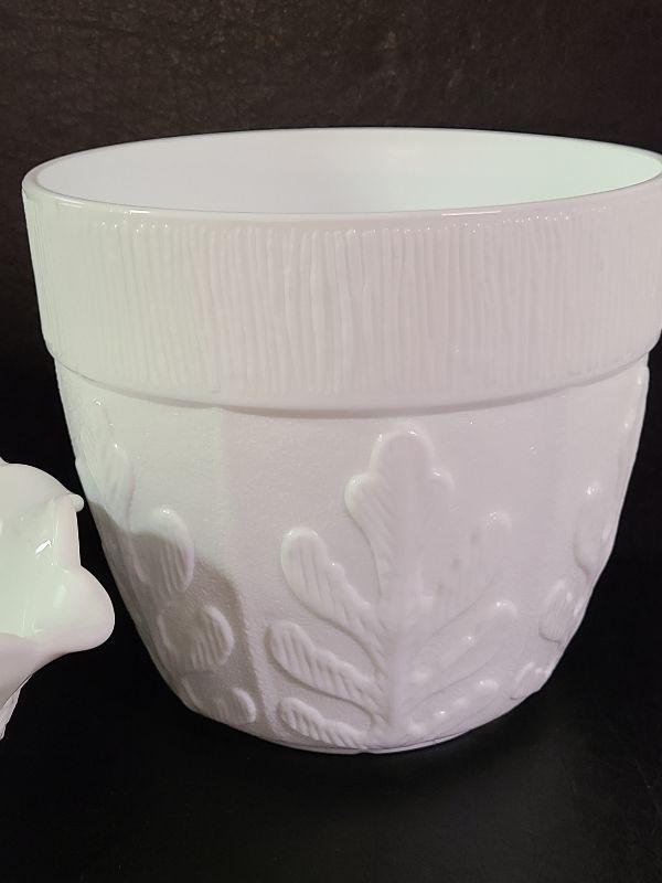 This is a fun lot of milk glass, the cool planter with leaves is from FTD 1976! Please see pics for sizing and condition