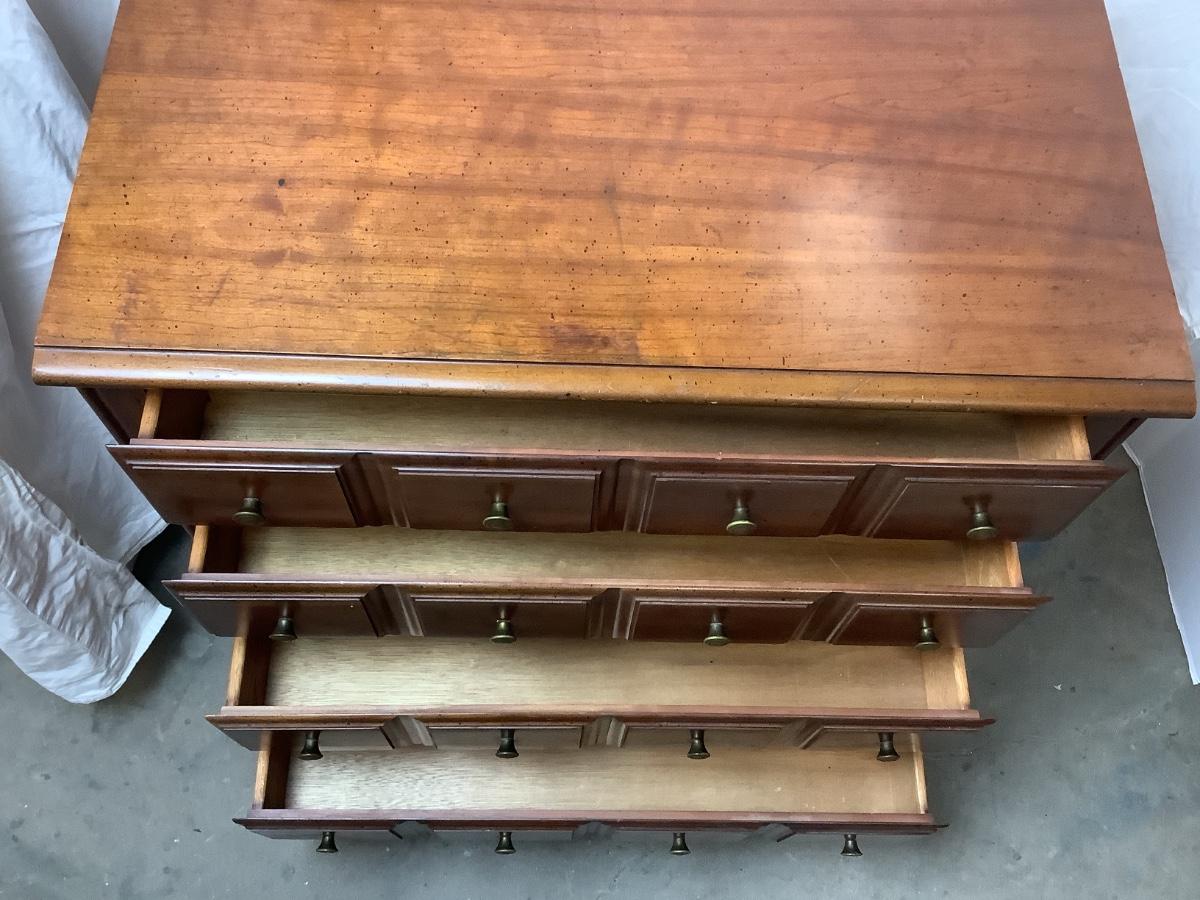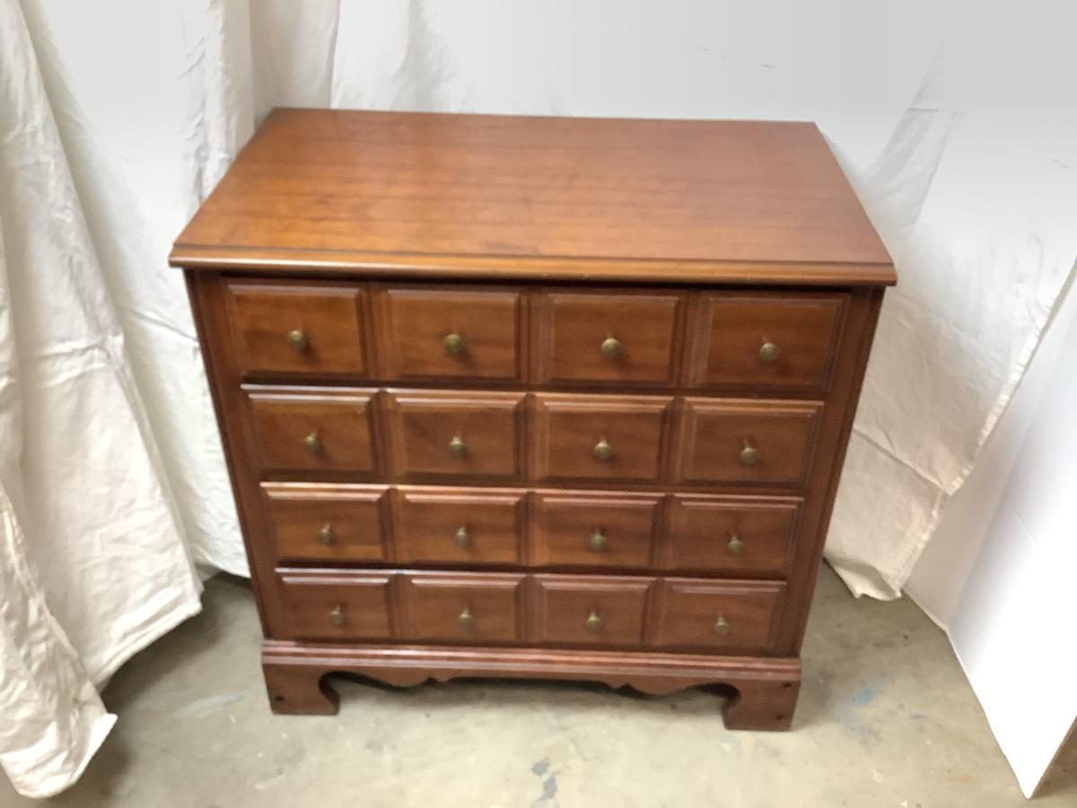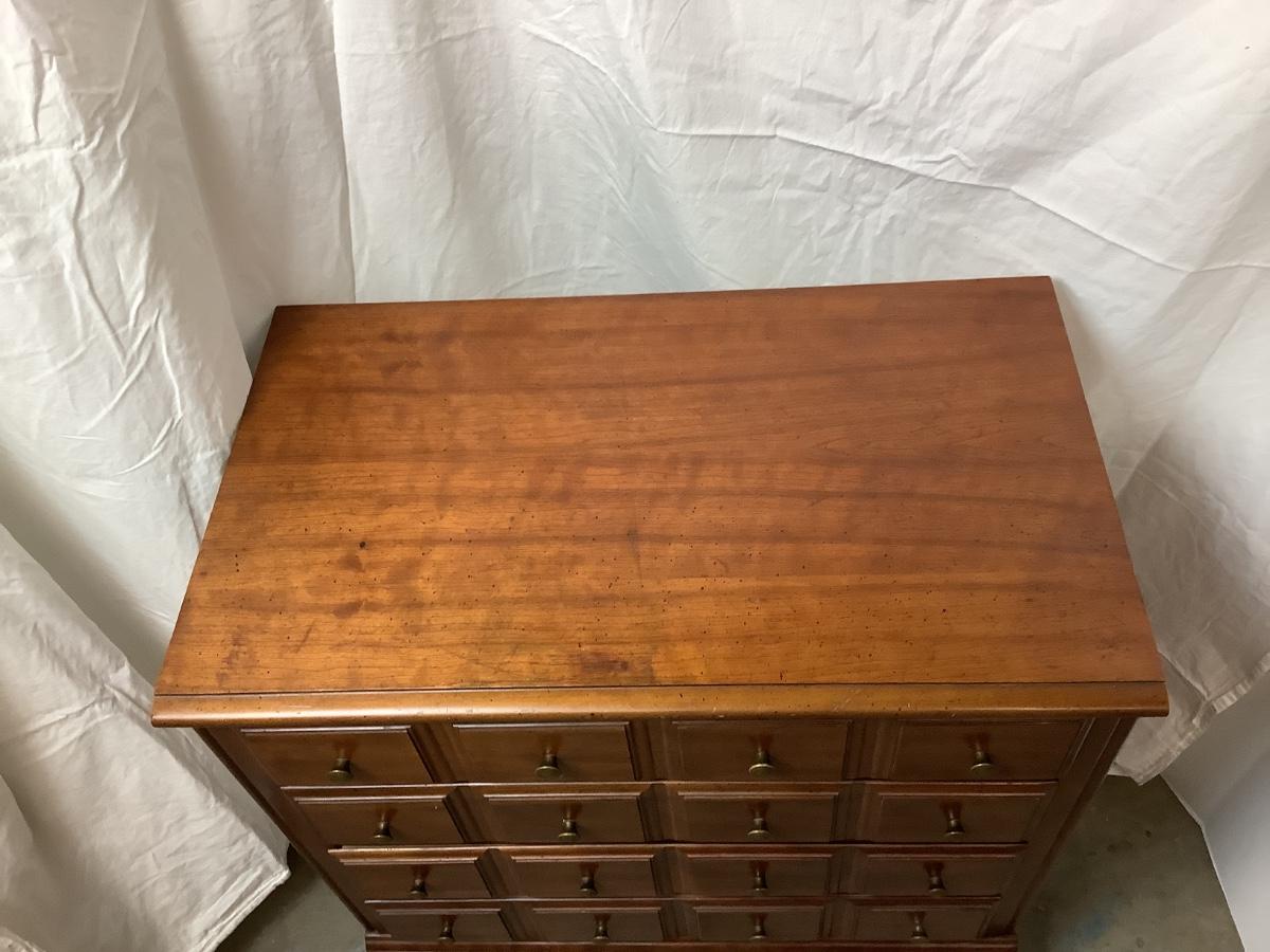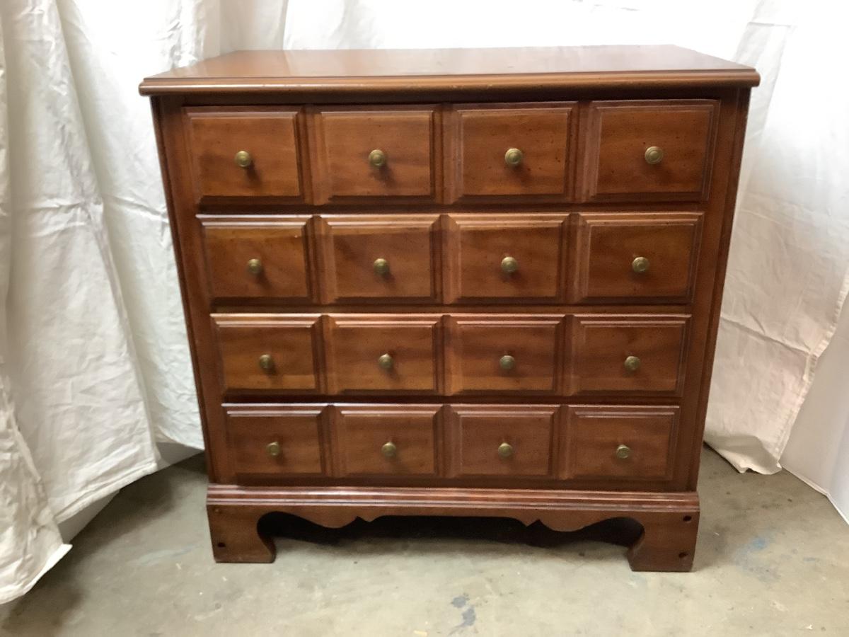 Appearance is multiple small drawers but is actually 4 single drawer with a pecan wood finish
