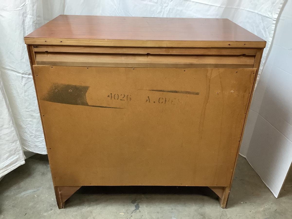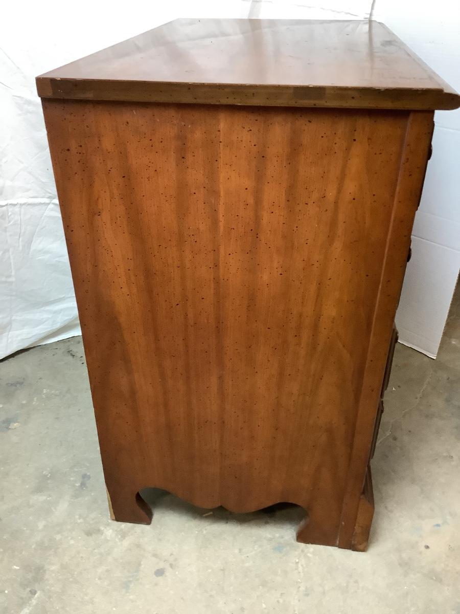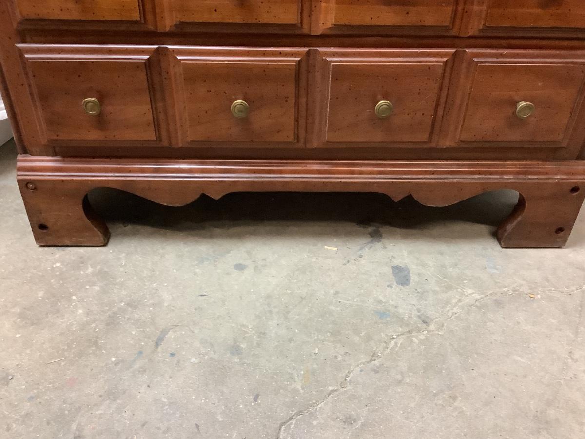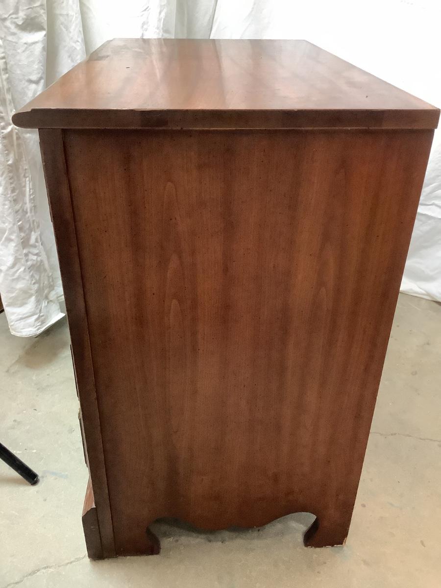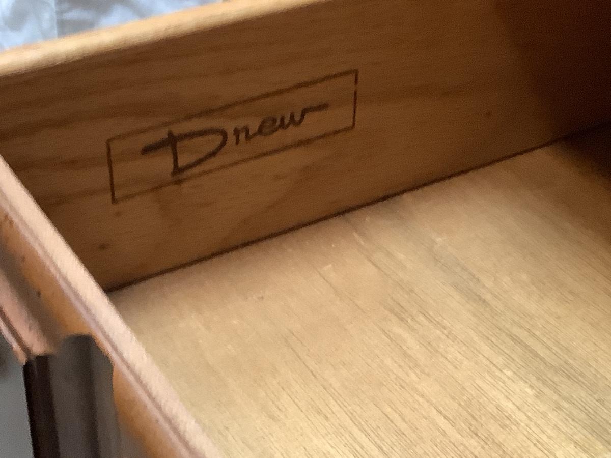 Appearance is multiple small drawers but is actually 4 single drawer with a pecan wood finish