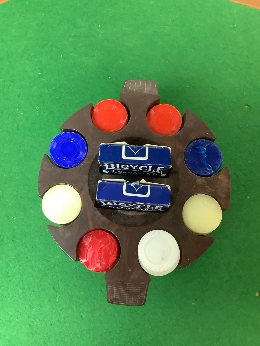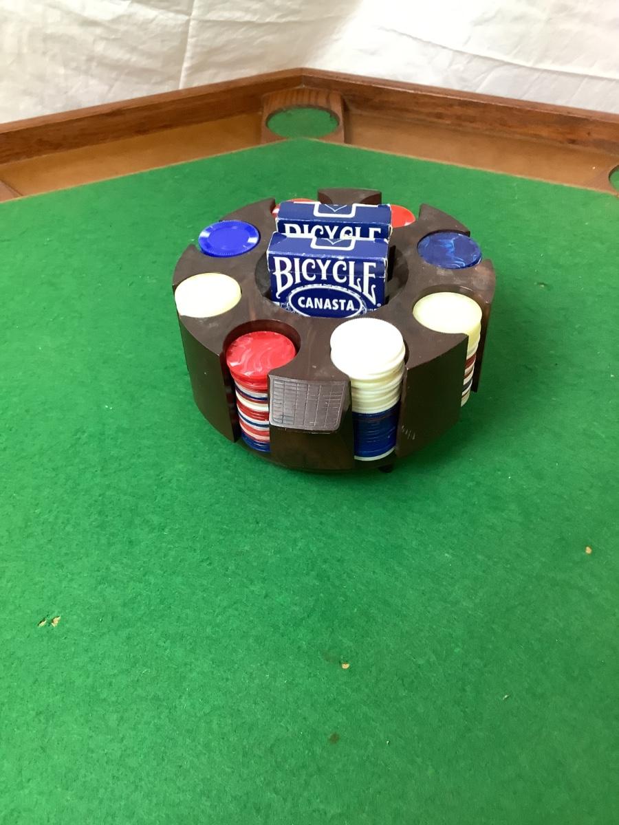 Table comes with cover and also with chips, holder and 2 decks of playing cards. Legs fold for easy storage