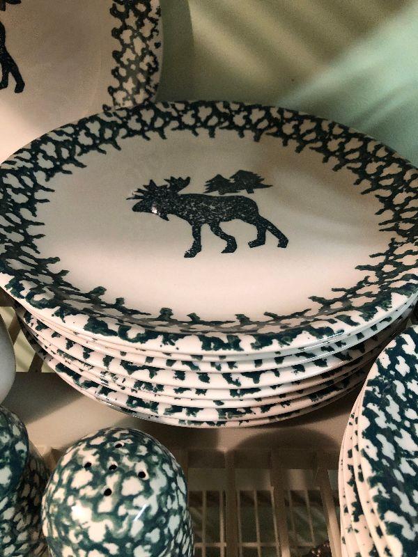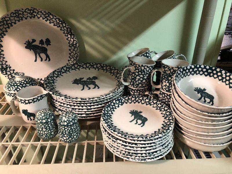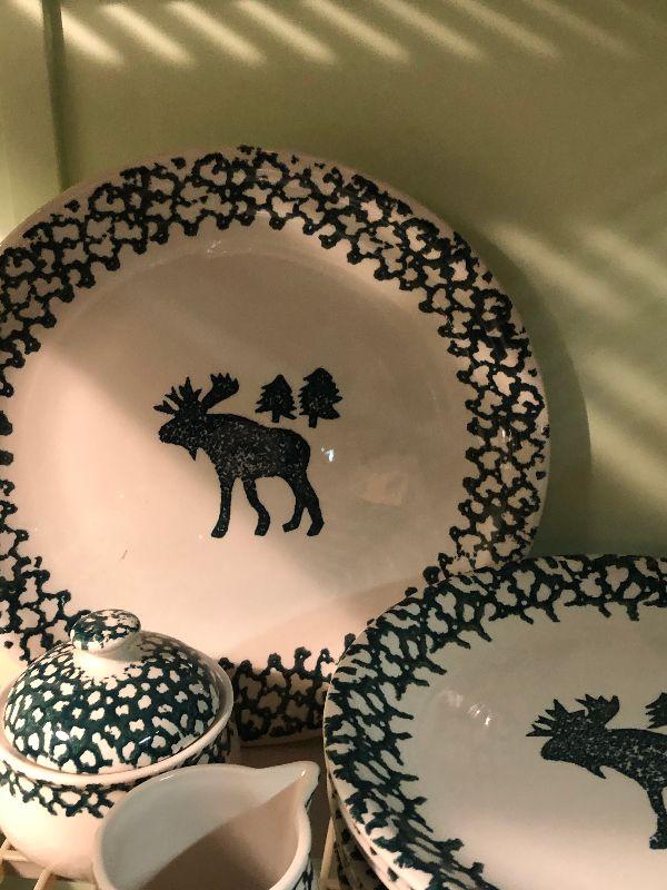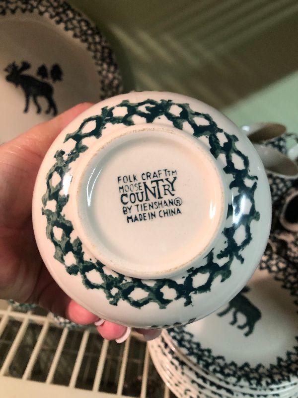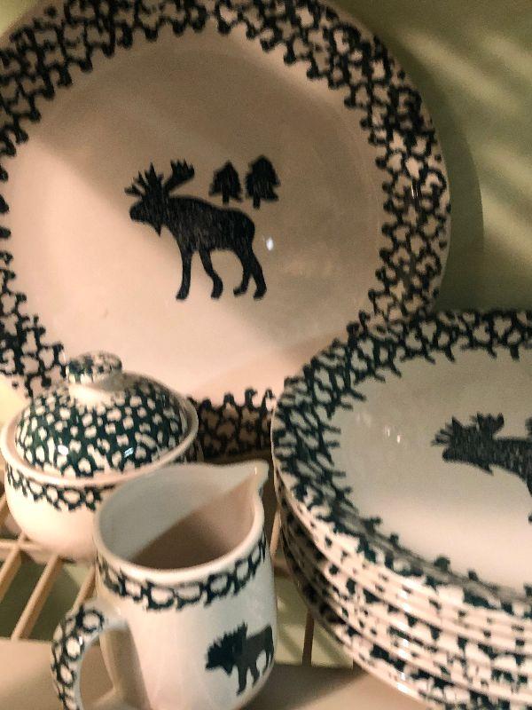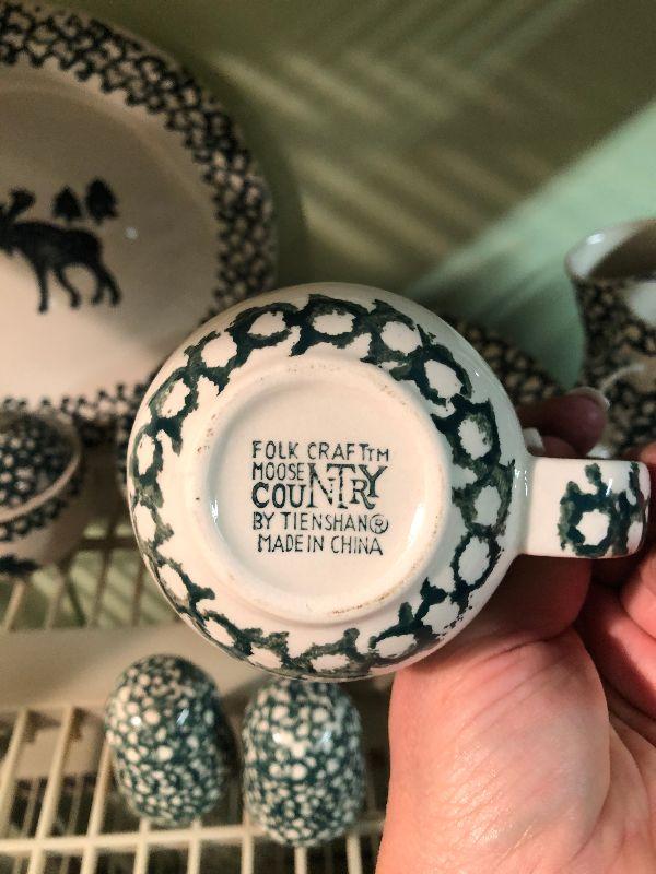 Folk Craft Moose Country by Tienshan. Service for eight, with serving platter, sugar and creamer, and salt and pepper shakers. Bring box to move.