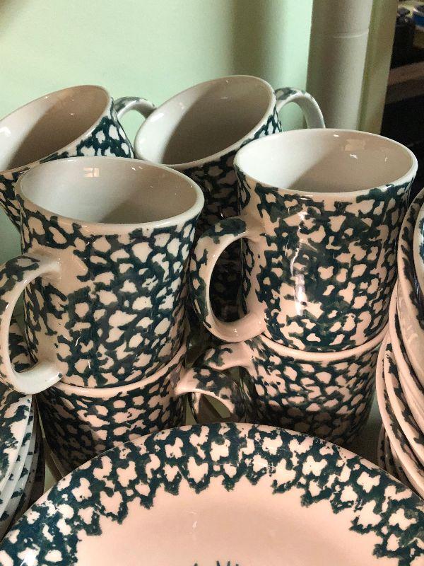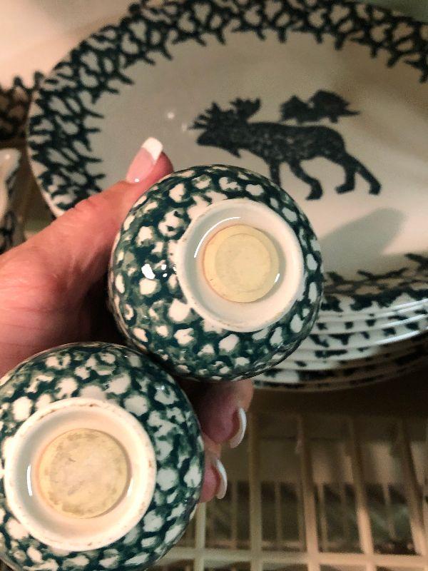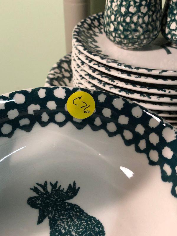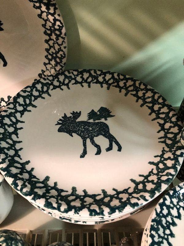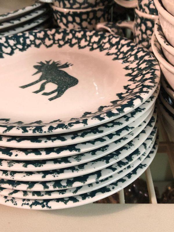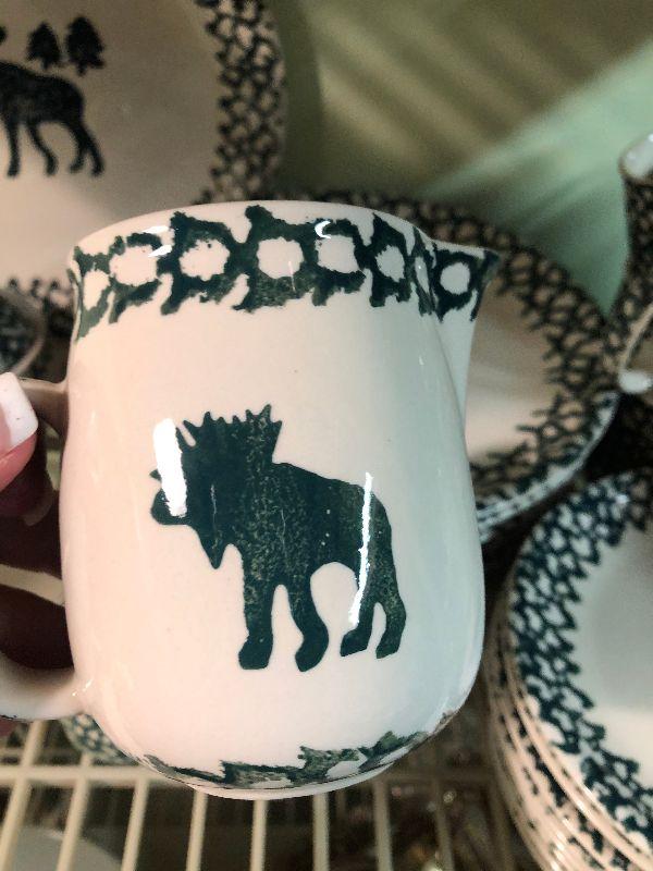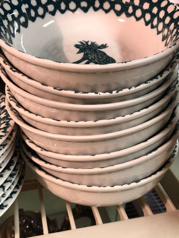 Folk Craft Moose Country by Tienshan. Service for eight, with serving platter, sugar and creamer, and salt and pepper shakers. Bring box to move.