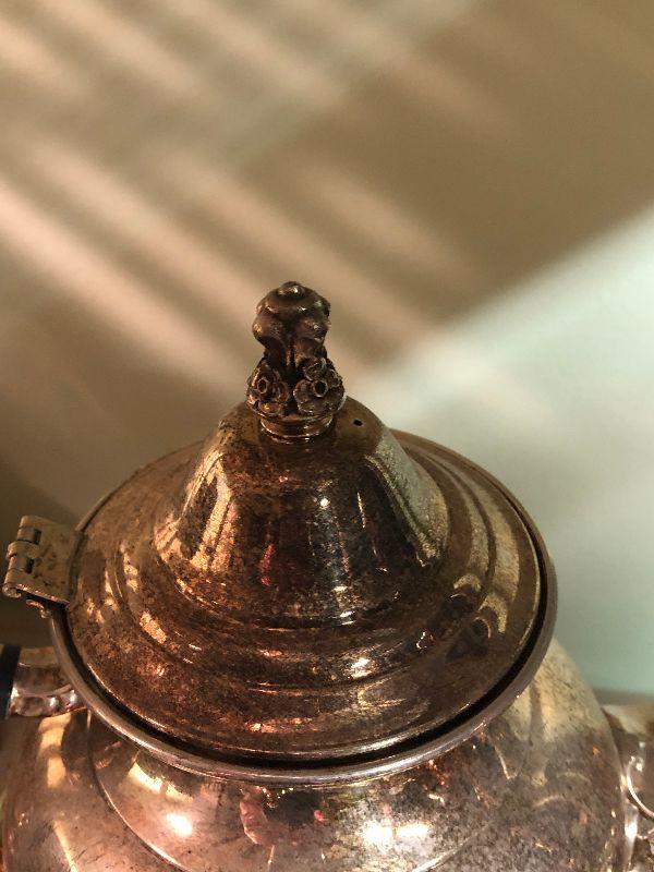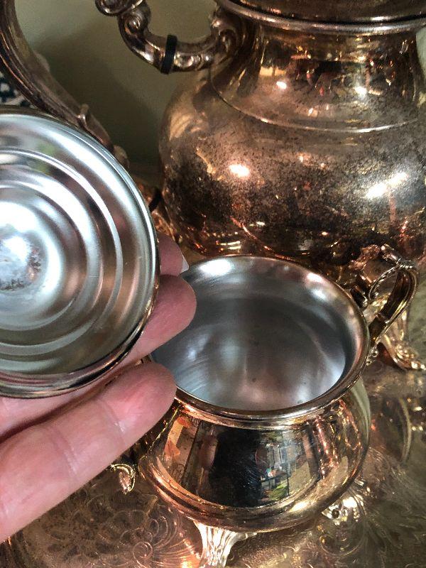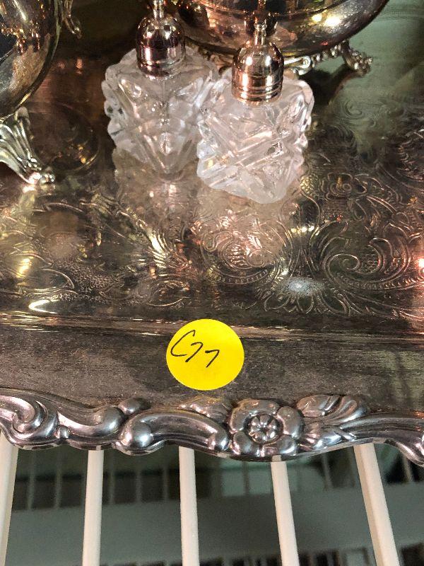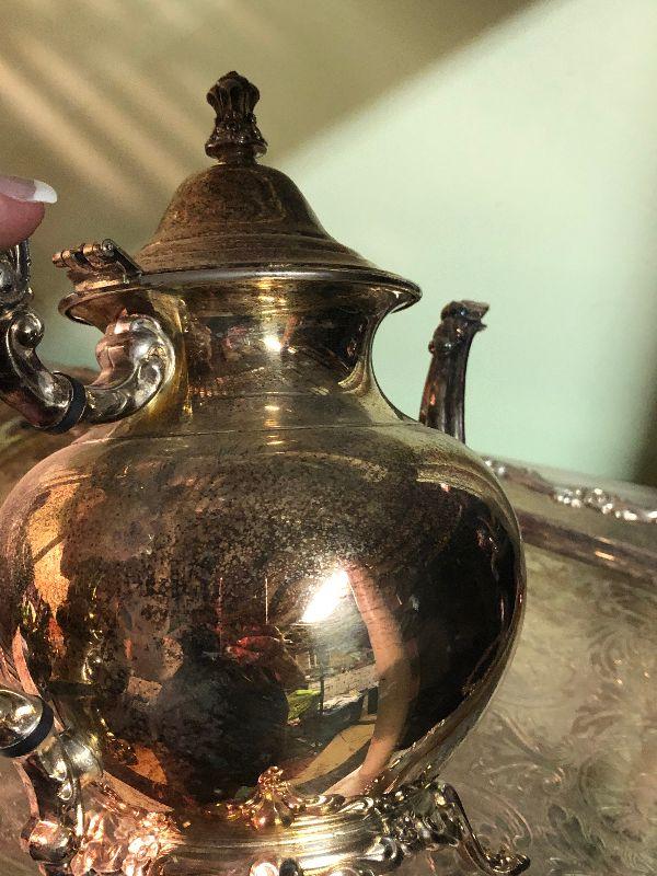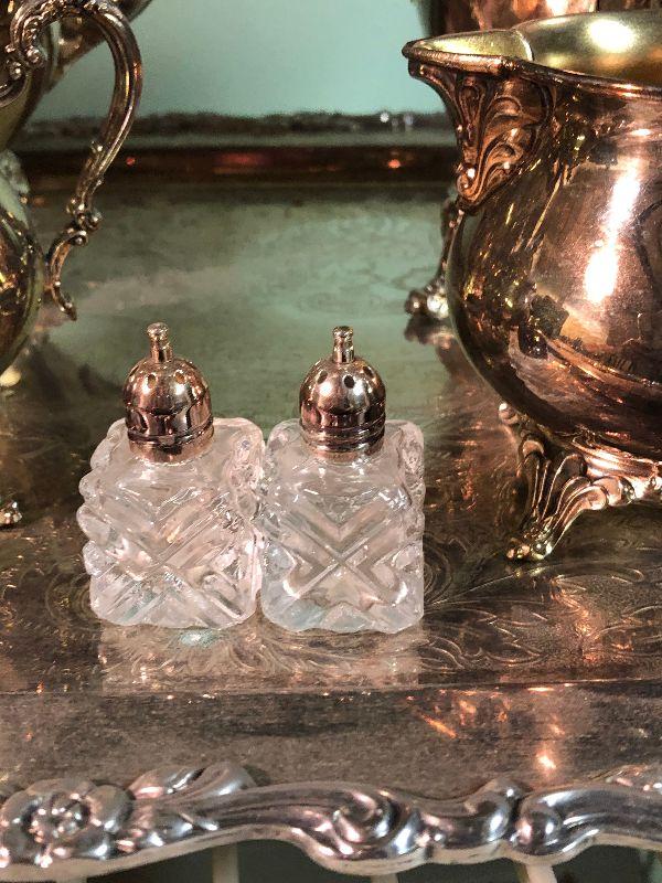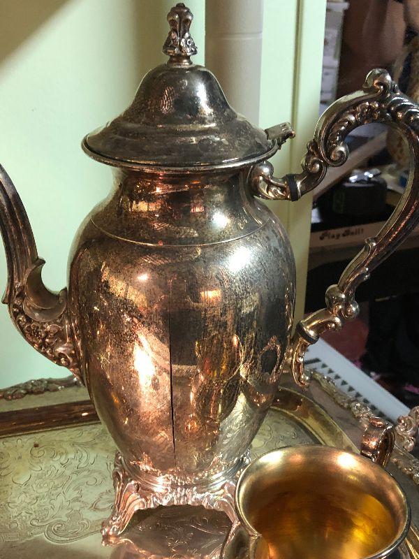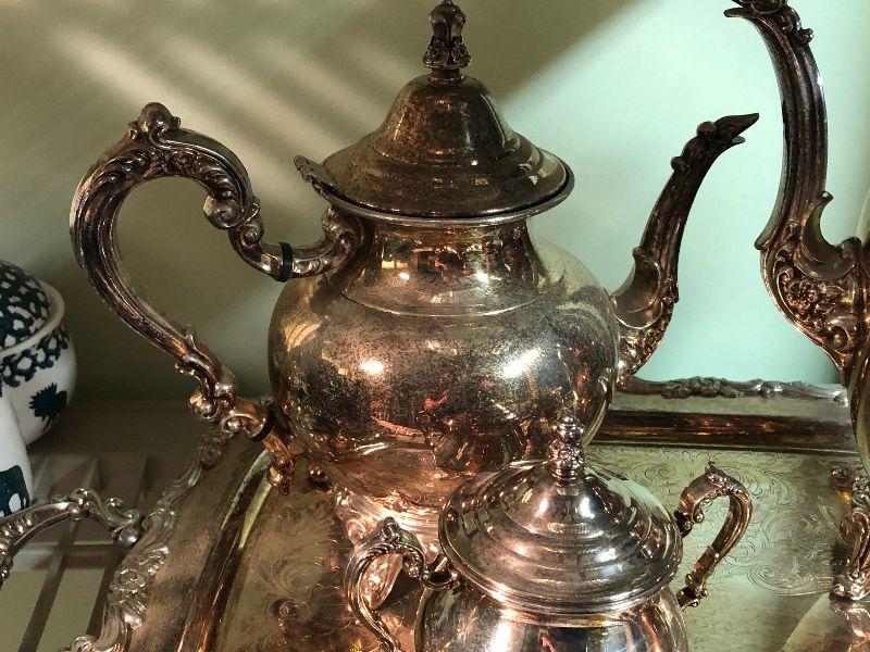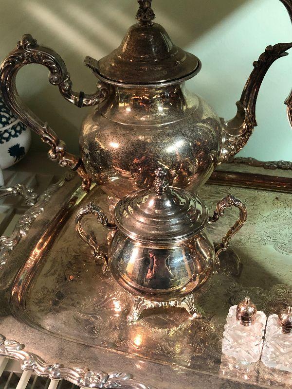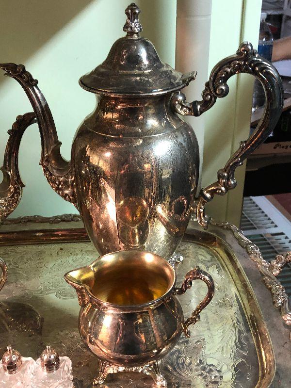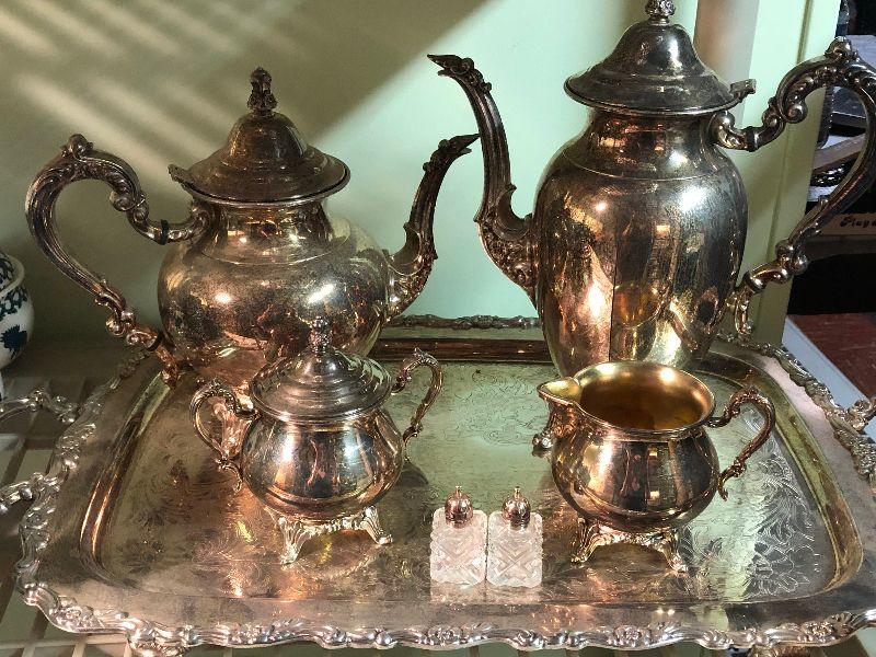 Coffee and tea pots, sugar and creamer, salt and pepper shakers, and a tray to display on.