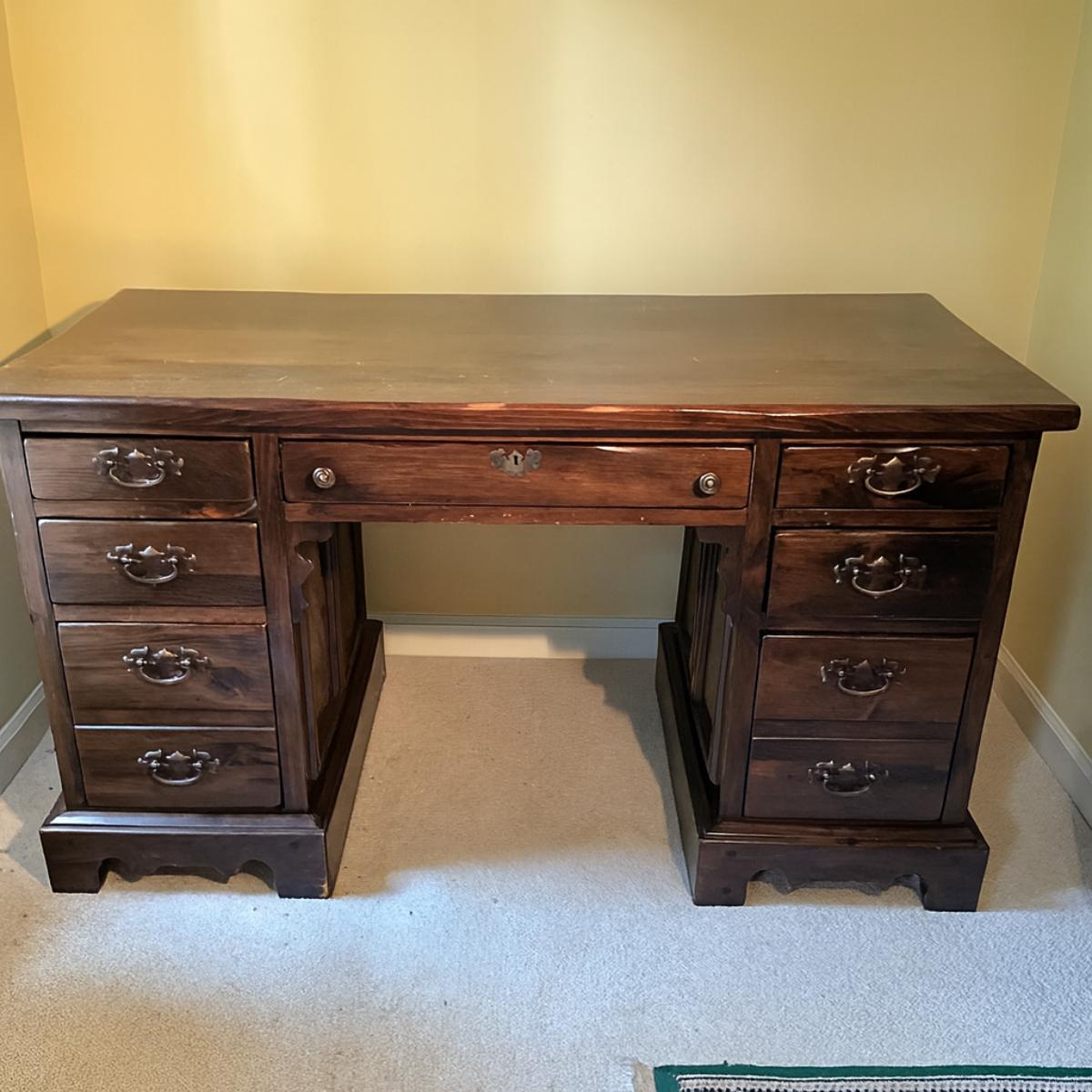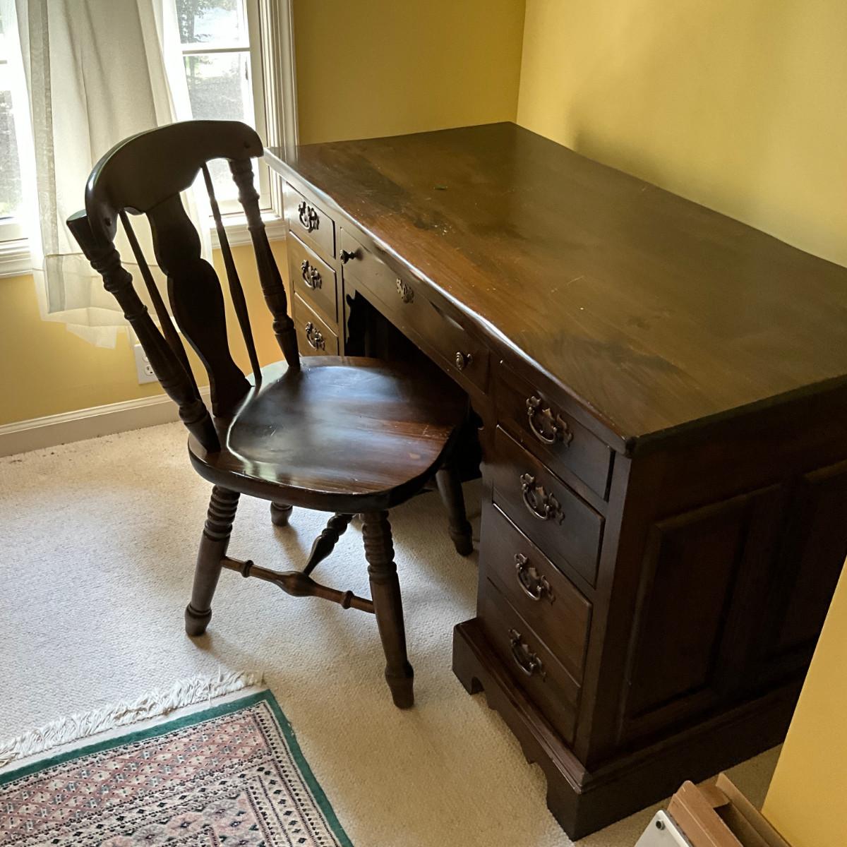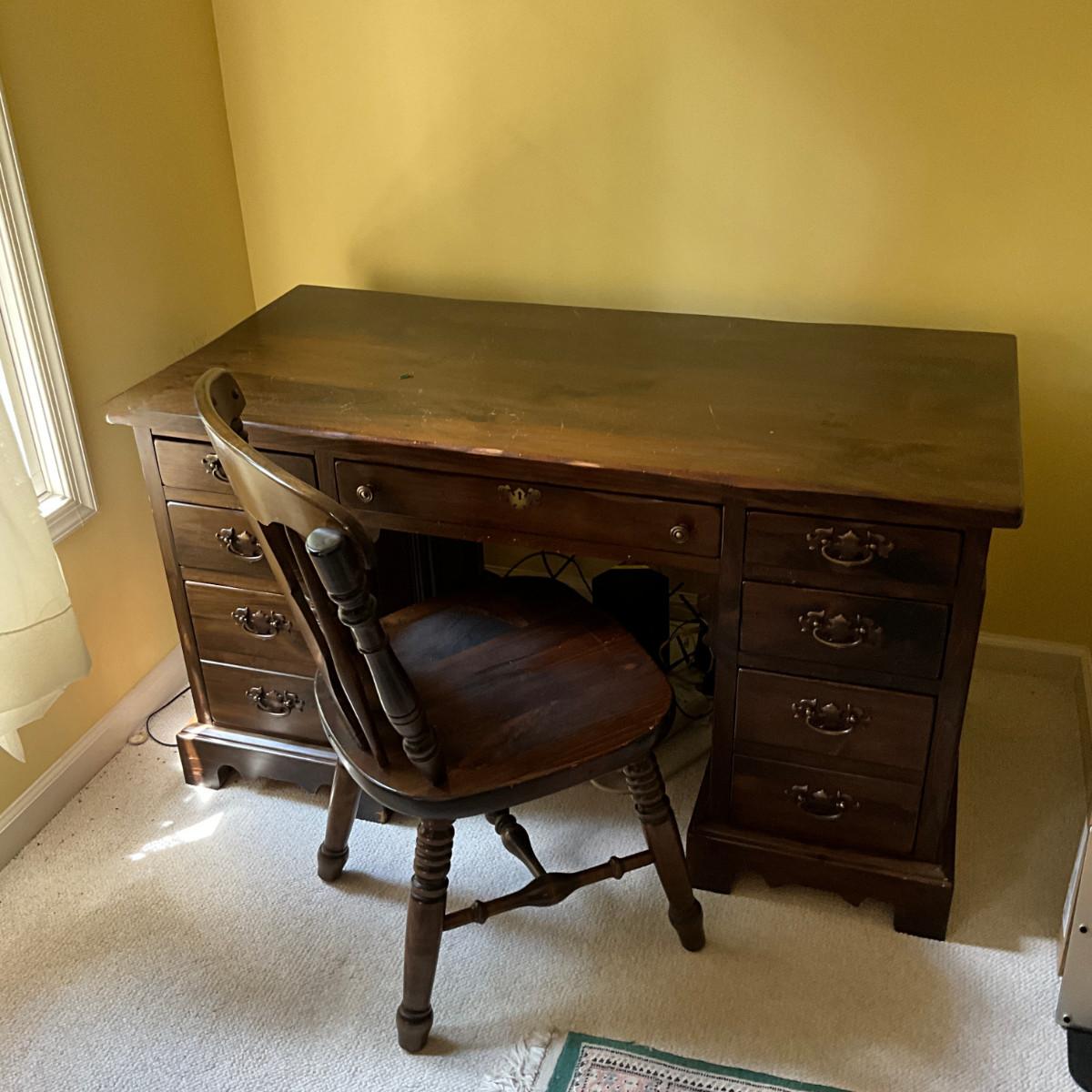 C780 Vintage Bennington Pine Colonial Style Knee Hole Desk With Matching Chair