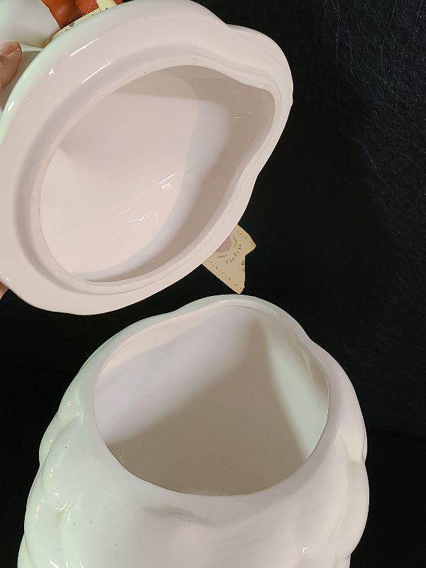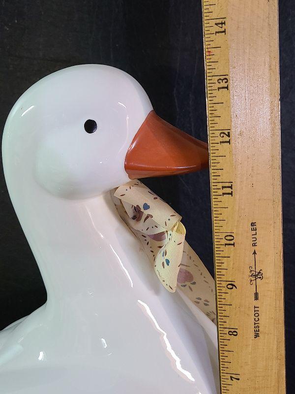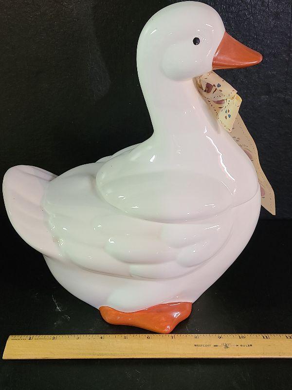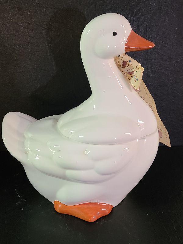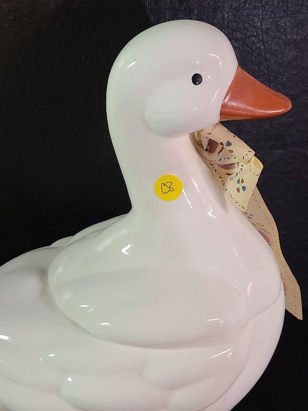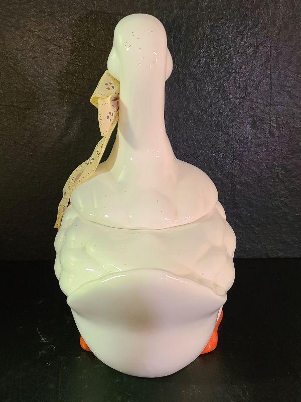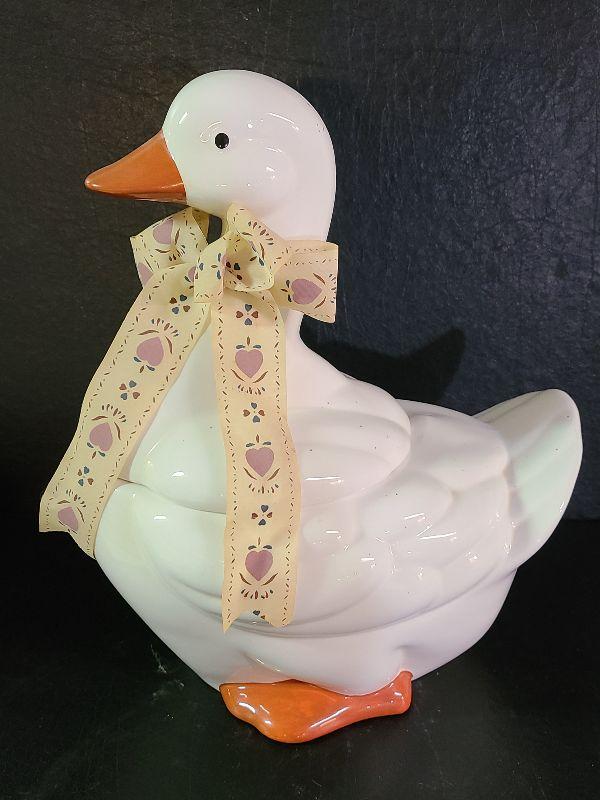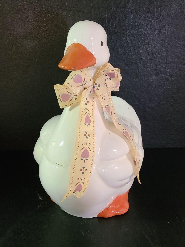 This is a nice duck cookie jar! Please see pics for condition and sizing. The bow is glued on, but can be removed and replaced seasonally for fun!