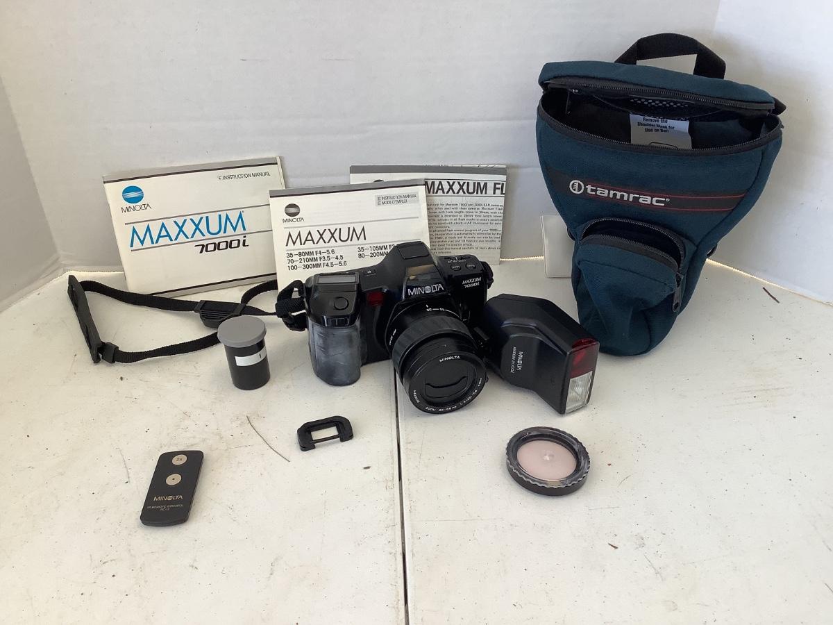 - A Maxxum 7000i Camera which comes with 3 different manuals, a film cartridge for camera, a timer remote control. Optic Lens cleaning cloth, and the TAMRAC carry case.