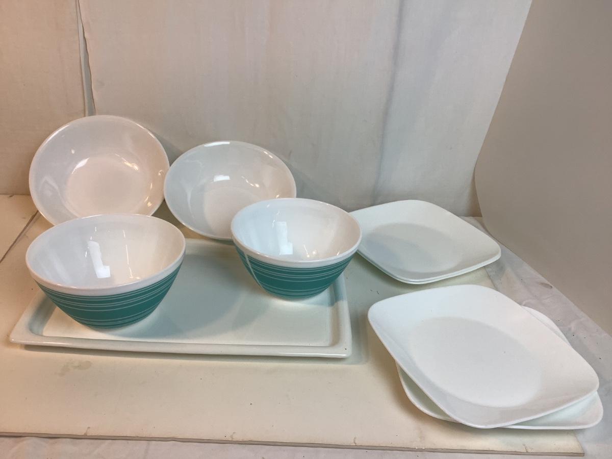 This lot comes included with one large baking tray, to aqua blue cereal bowls, two wide soup bowls, and four square rounded dinner plates