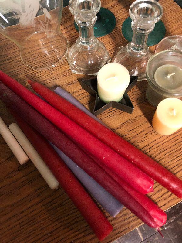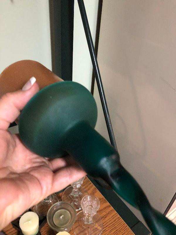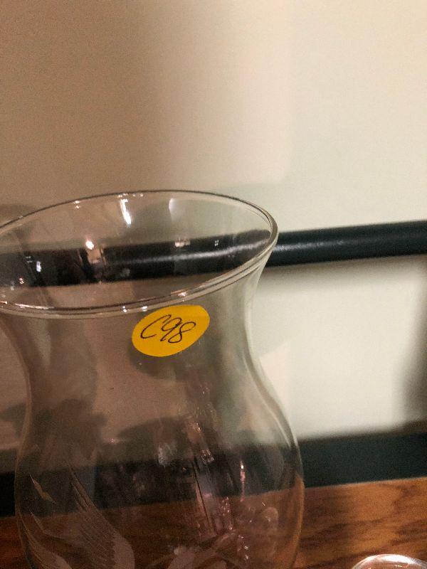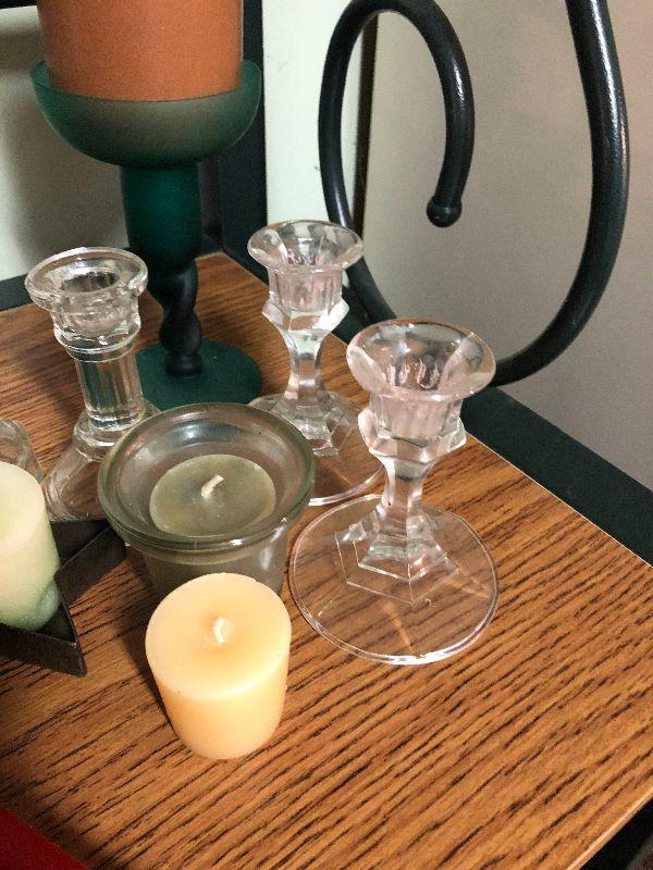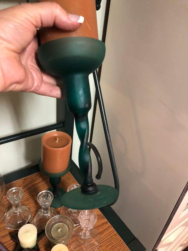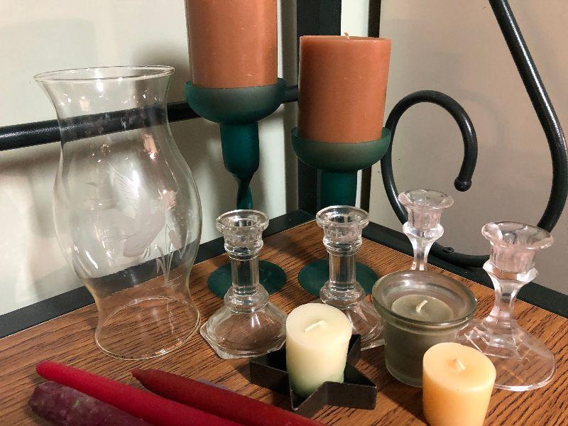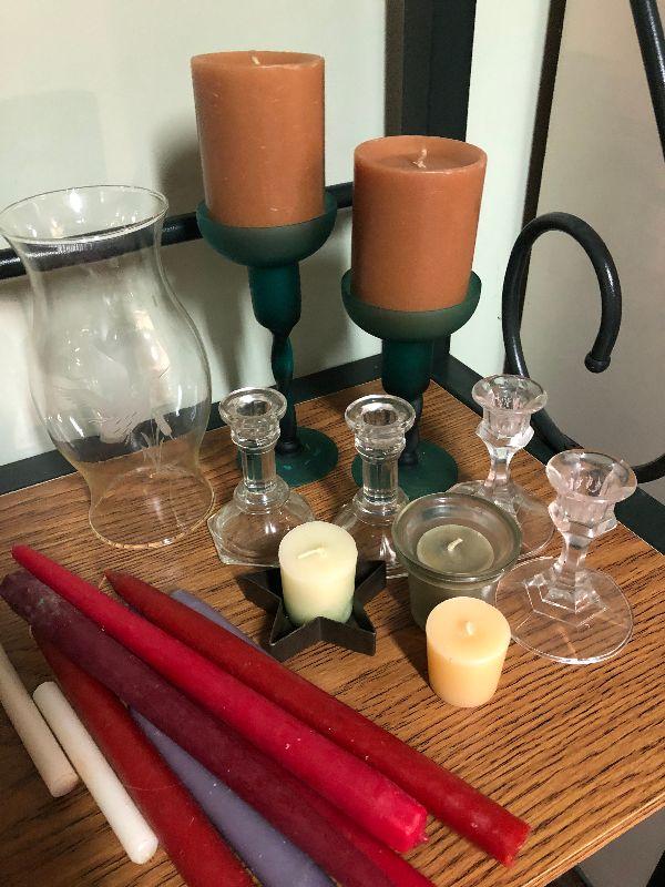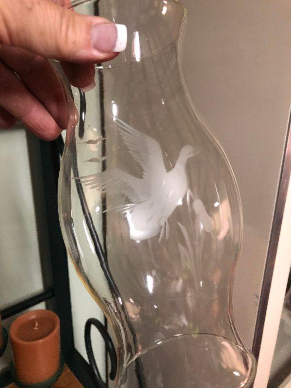 Glass chimney with duck, stemware candle holders, glass candle sticks, and candles. Bring container to move.