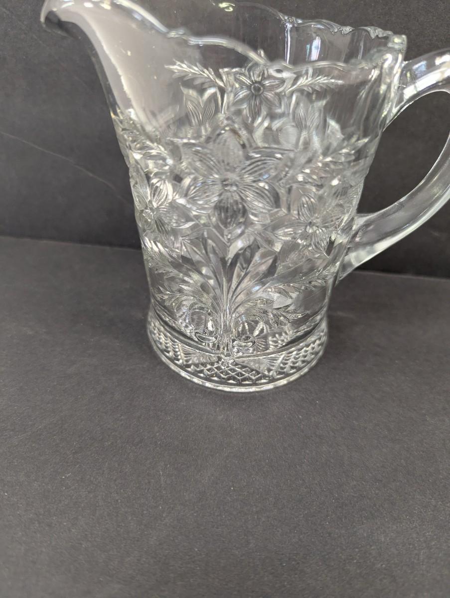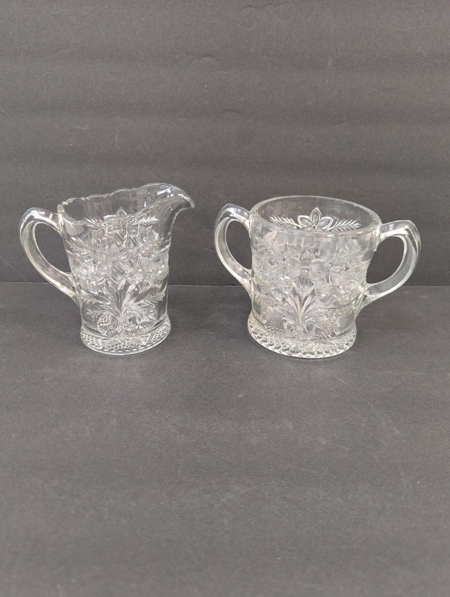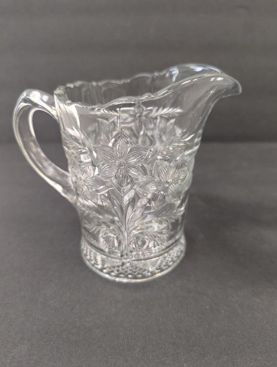CA. 1918 EAPG Indiana Glass Bouquet Narcissus Spray Handled Spooner & Small Pitcher