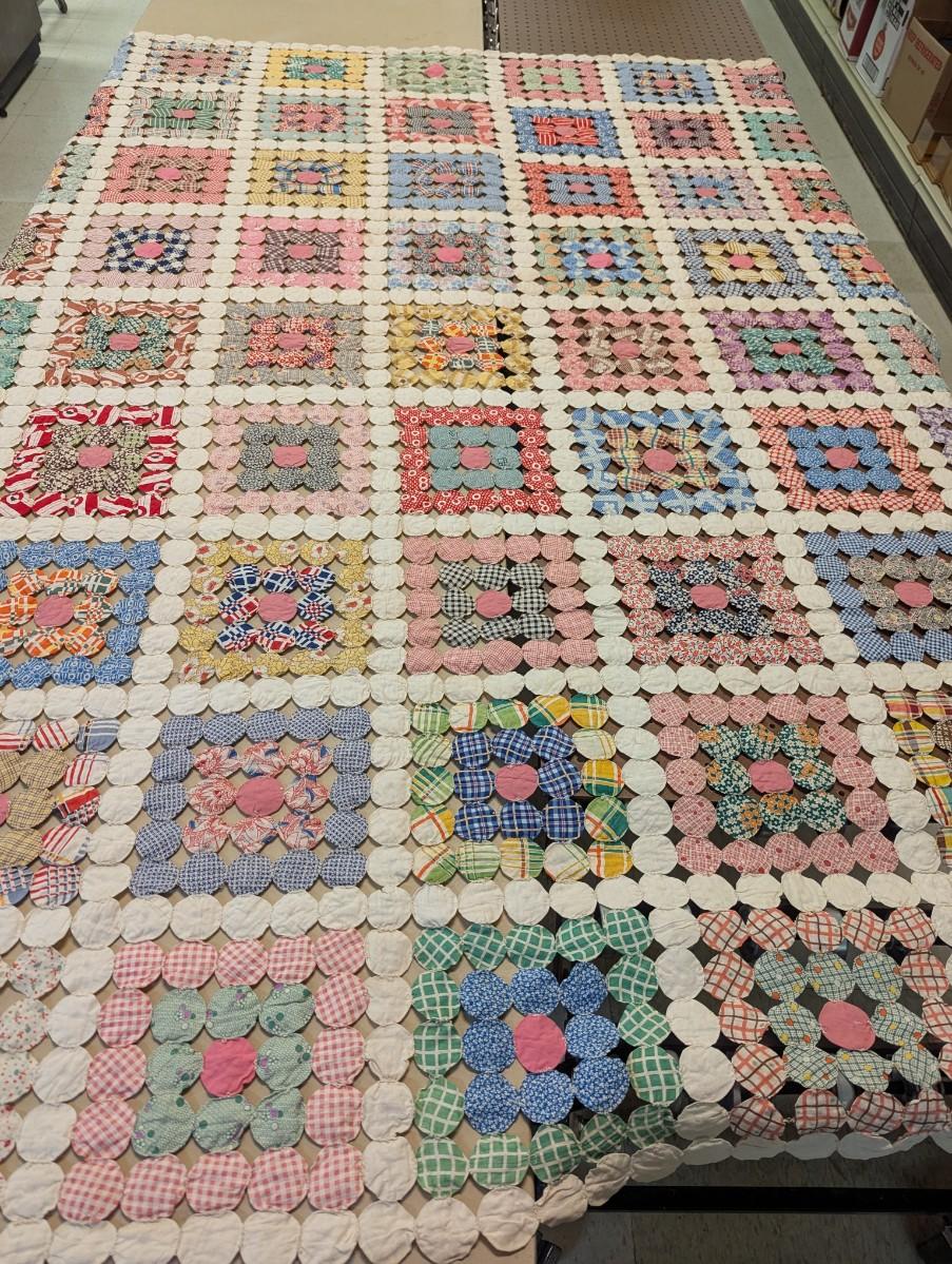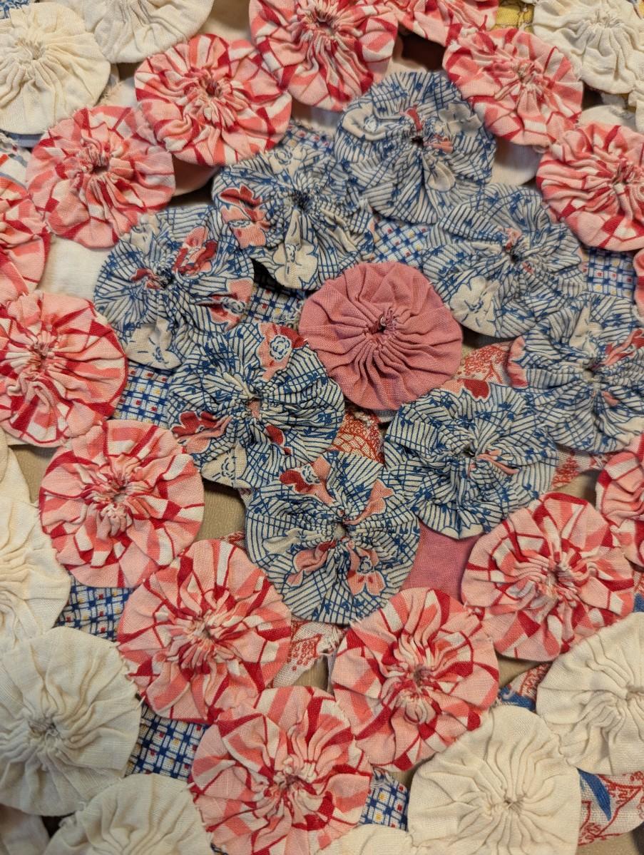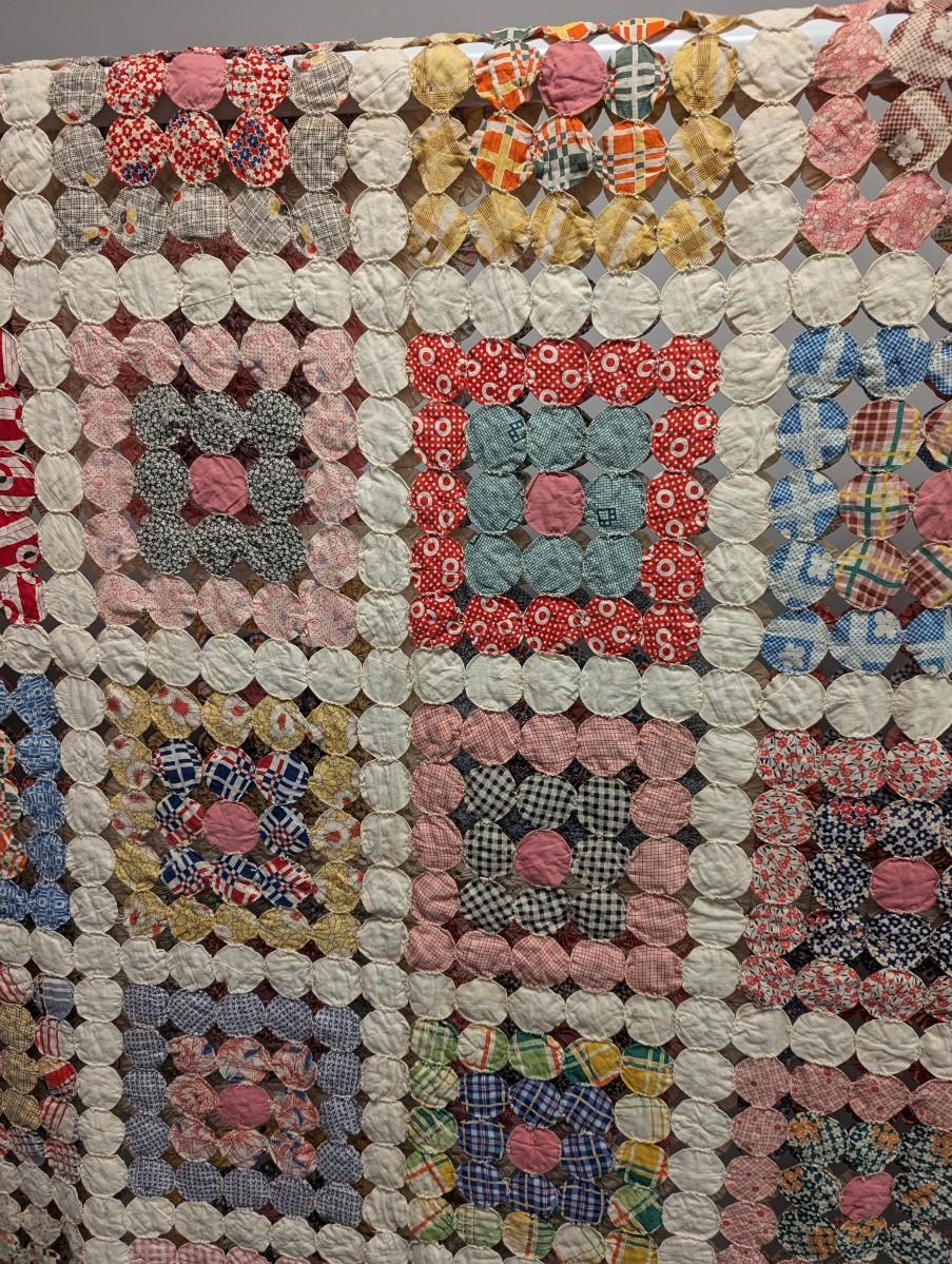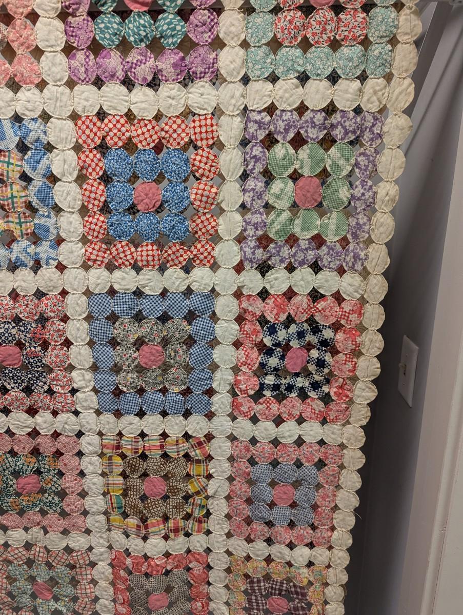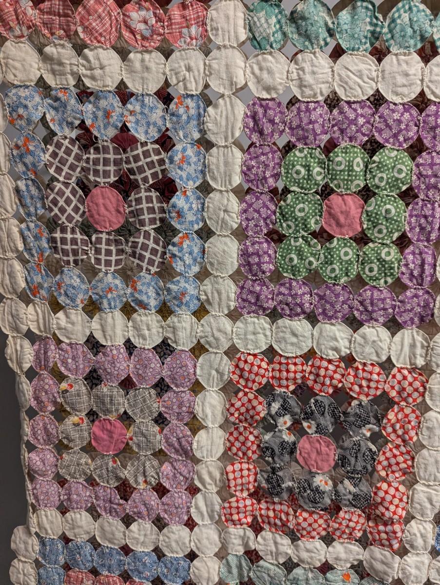 Gathered circles formed from multi-color calicos and joined to make a rectangle