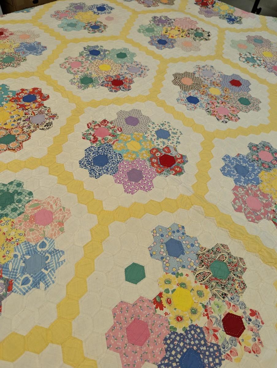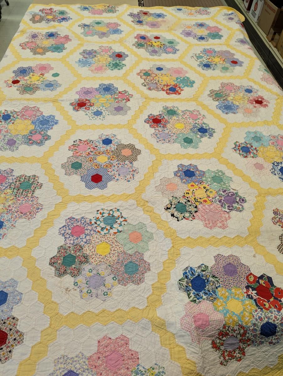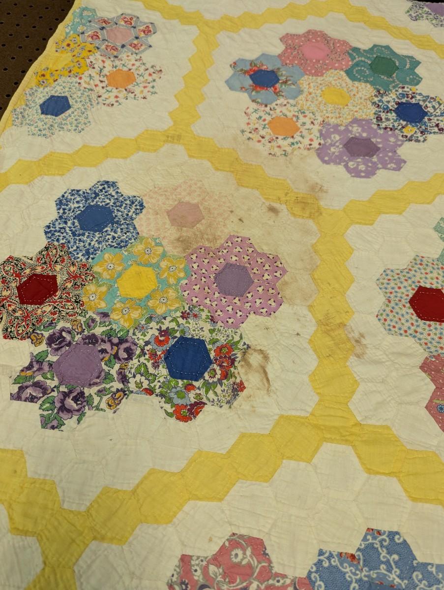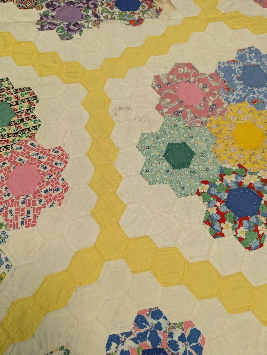 Ca. 1930 Grandmother's Flower Garden Quilt With Yellow Outline 92 x 82 Inches #32