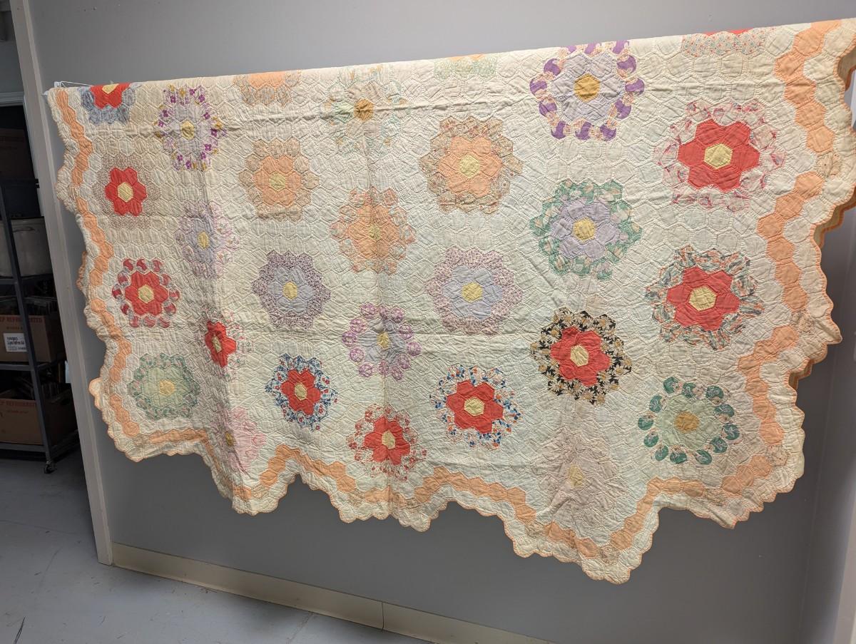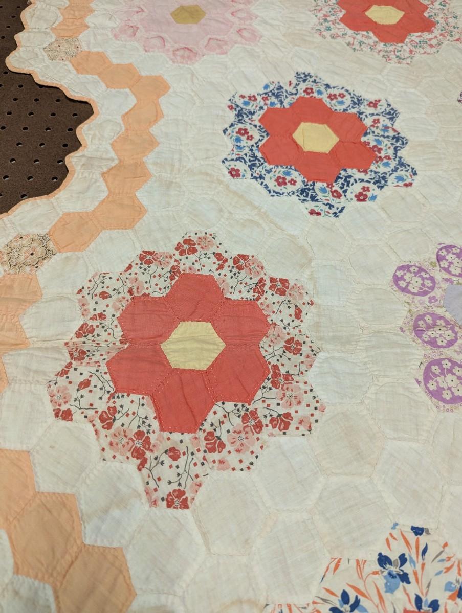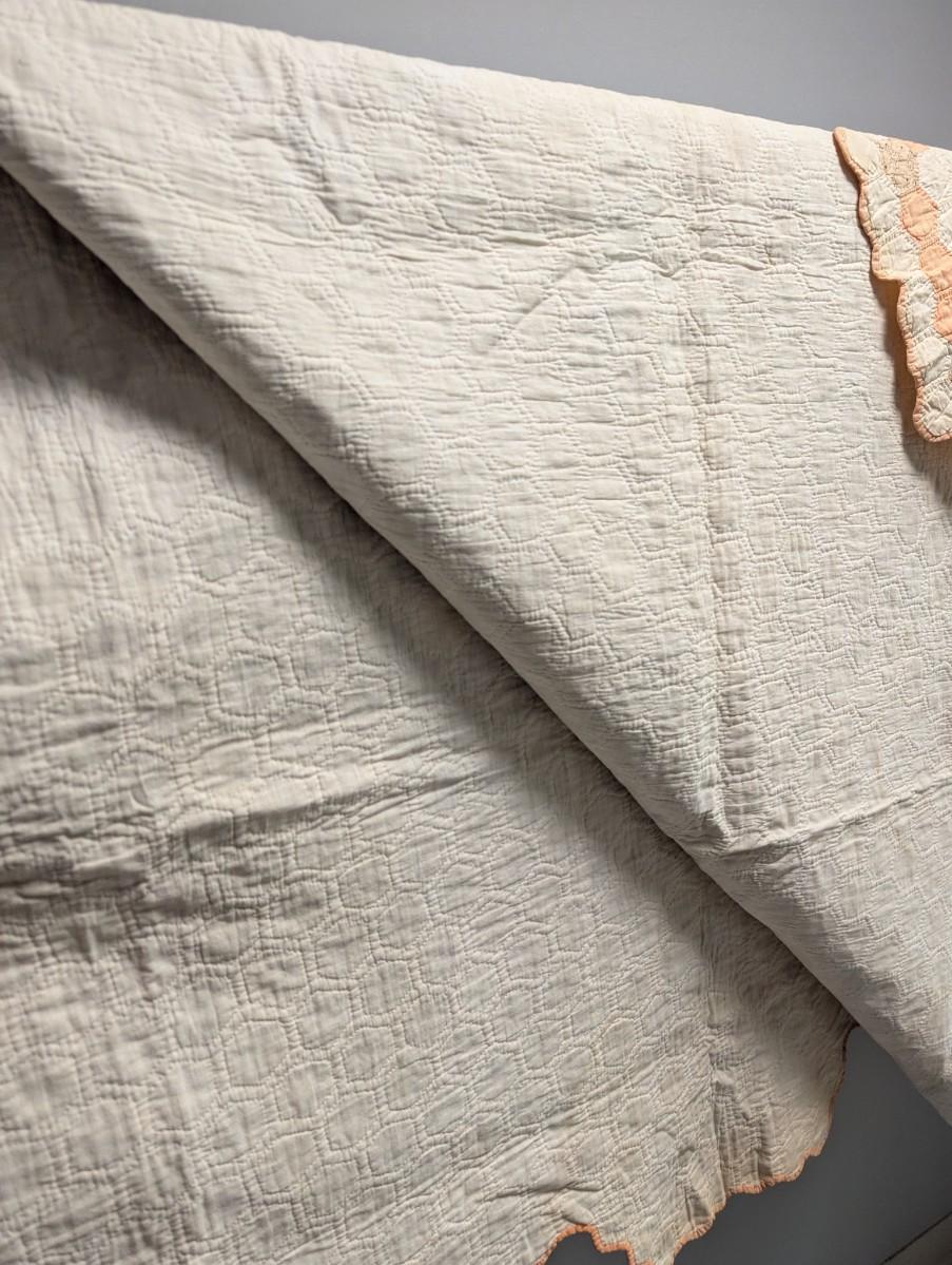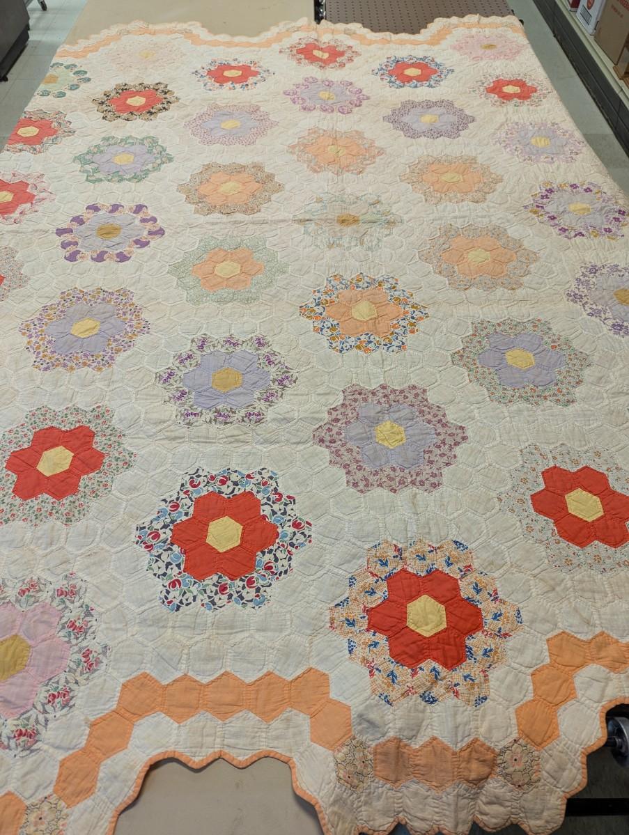 Multi-color, peach border and binding, scallop edges. Quilting and condition good