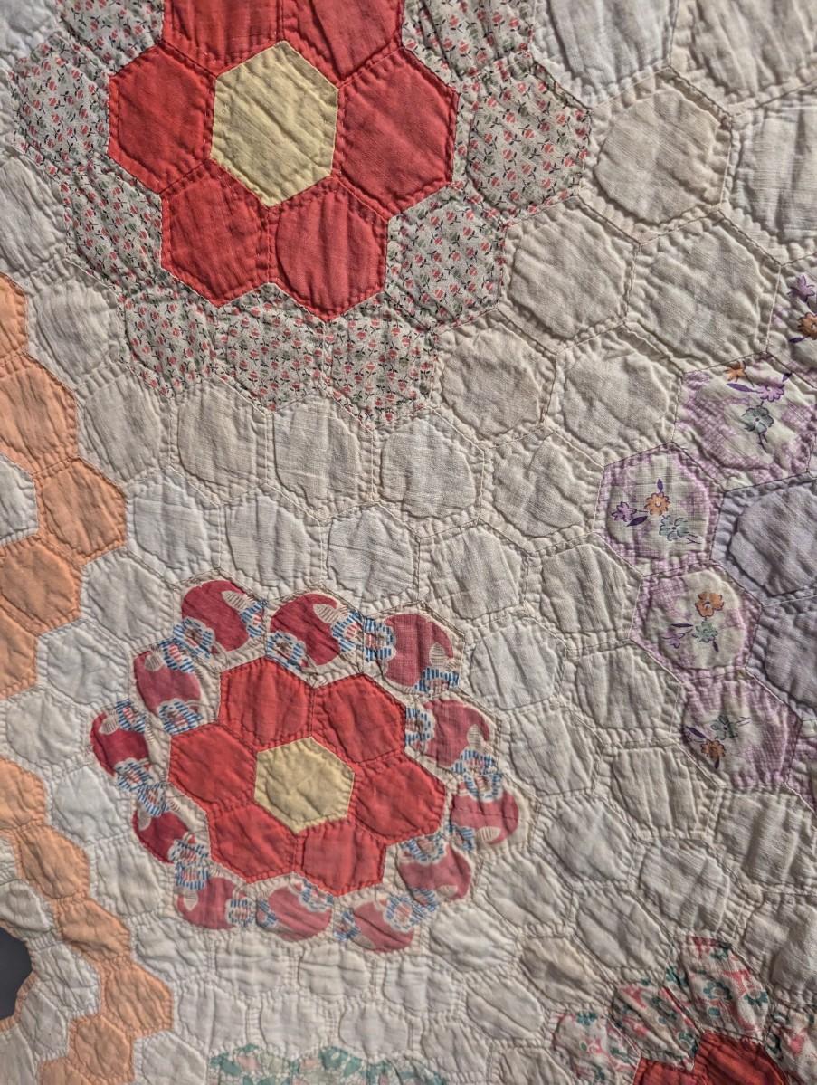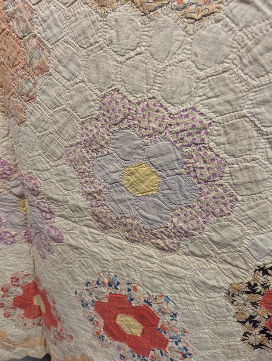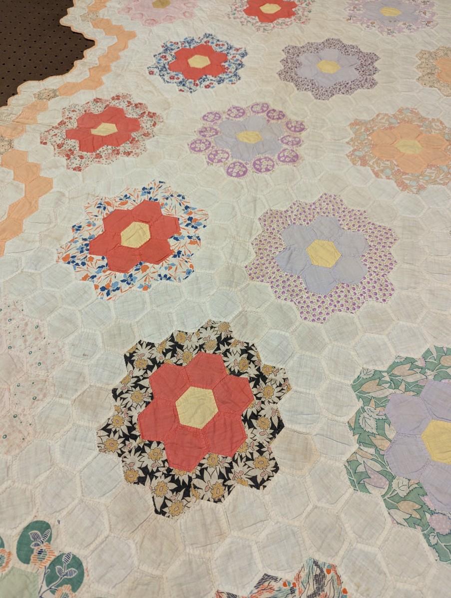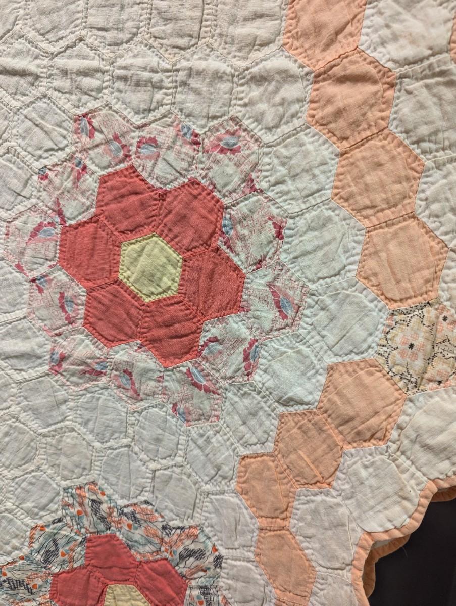 Multi-color, peach border and binding, scallop edges. Quilting and condition good