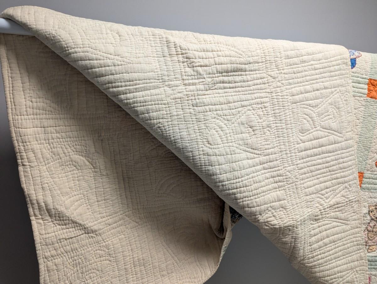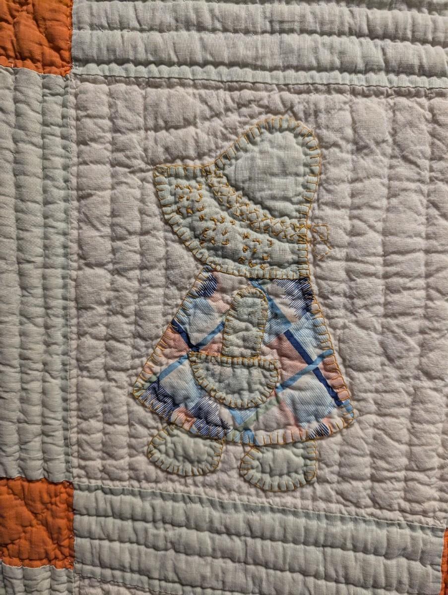 Dress, bonnet, and shoes attached with embroidery floss in button-hole stitch, quilted close to vertical lines; reverse white. Good condition