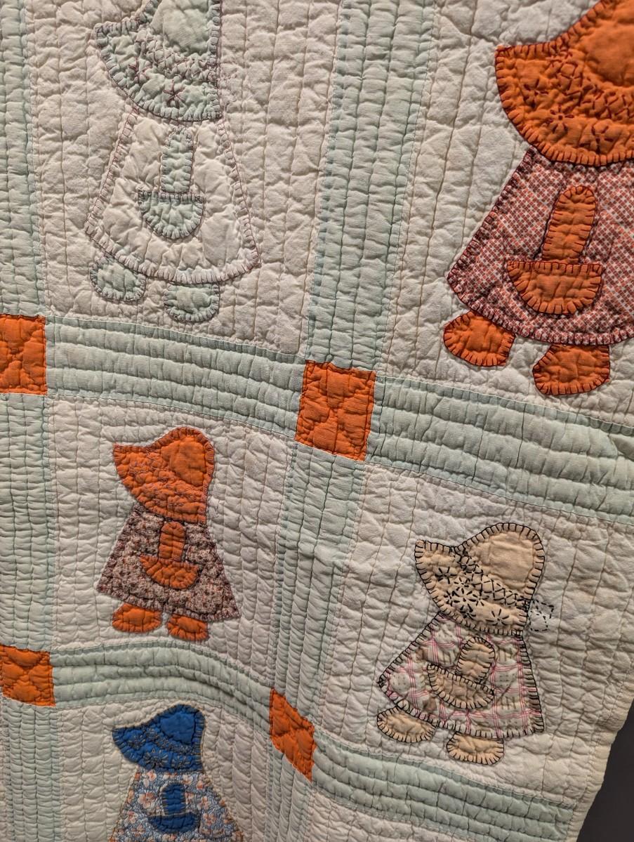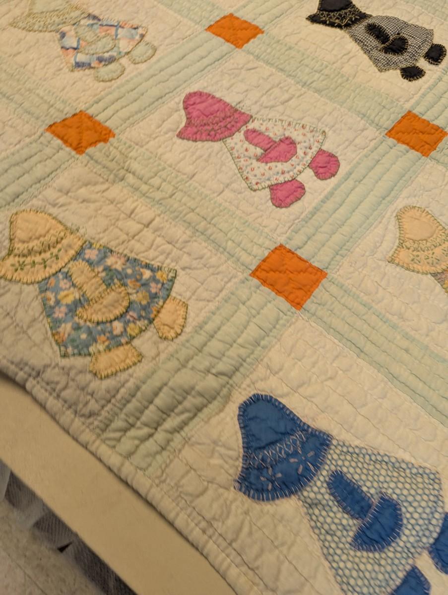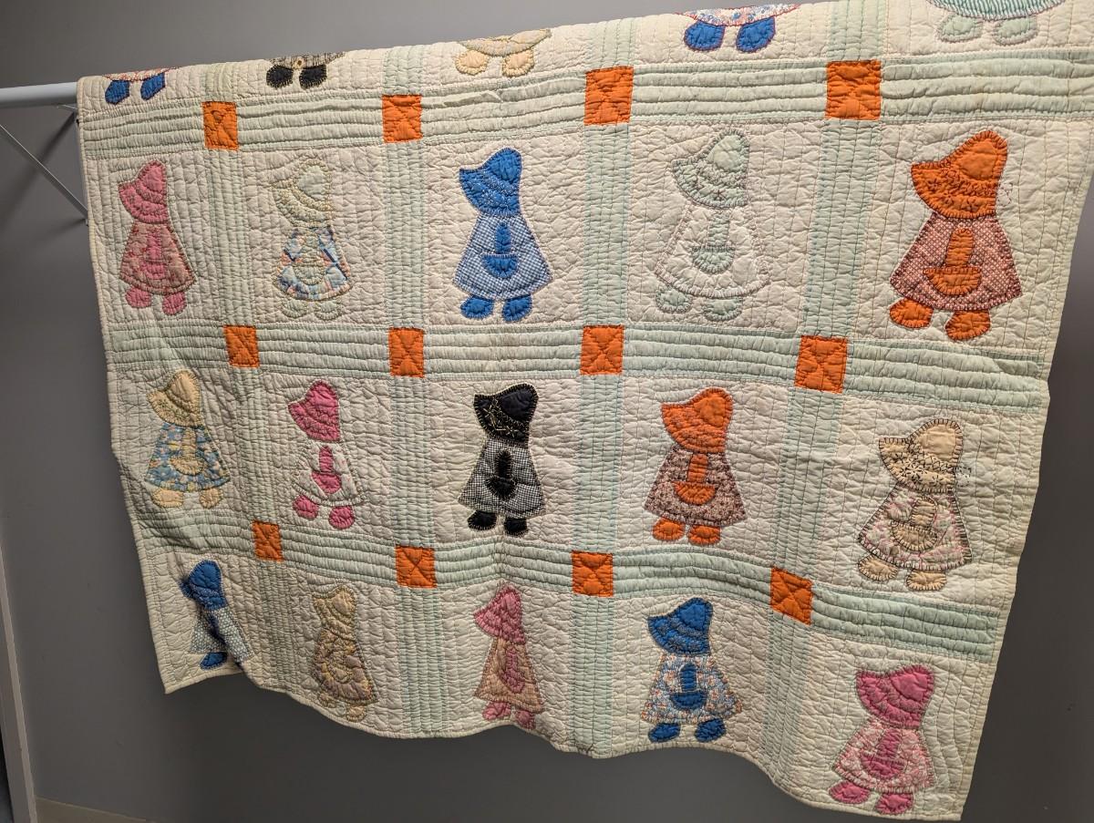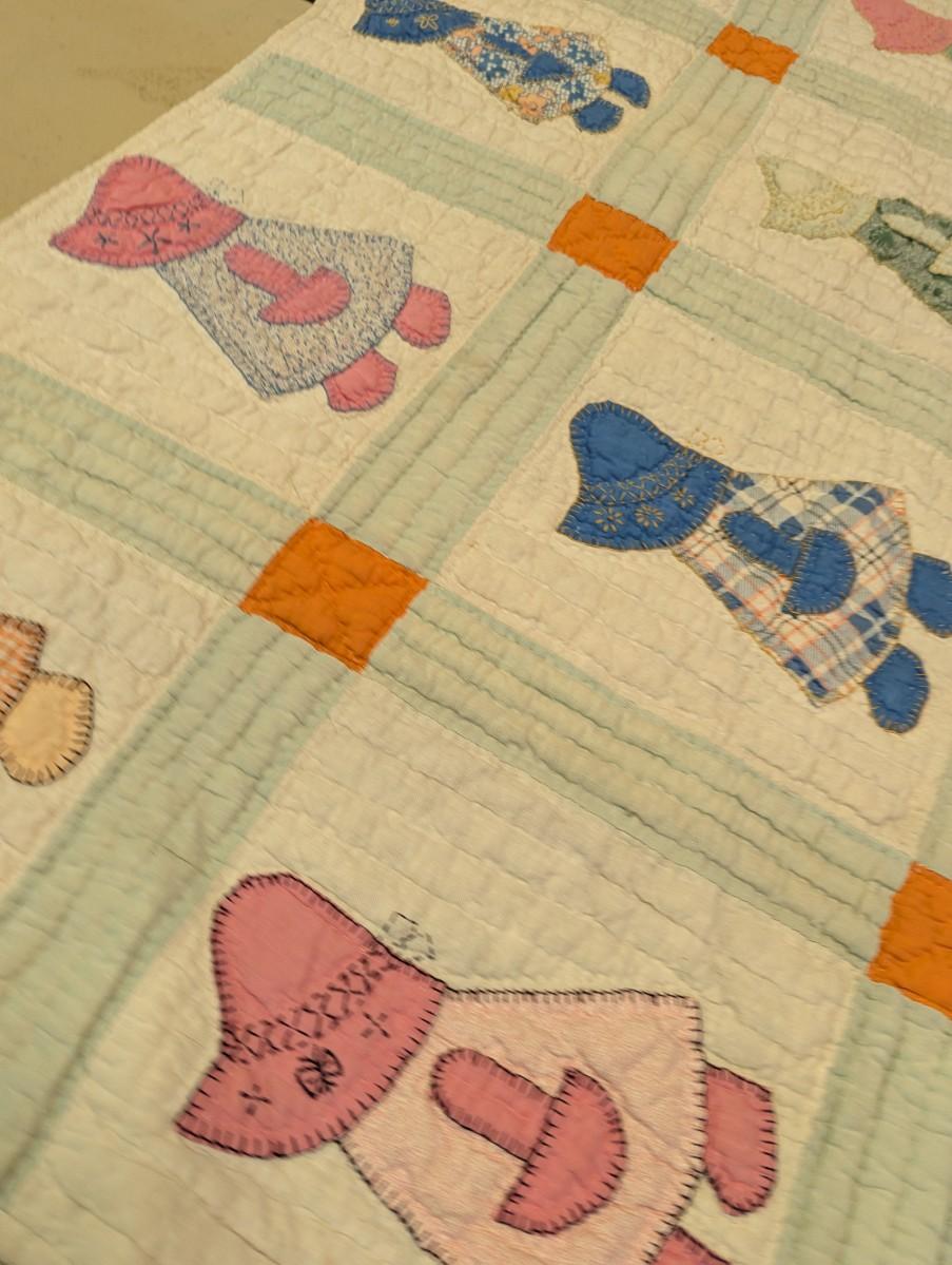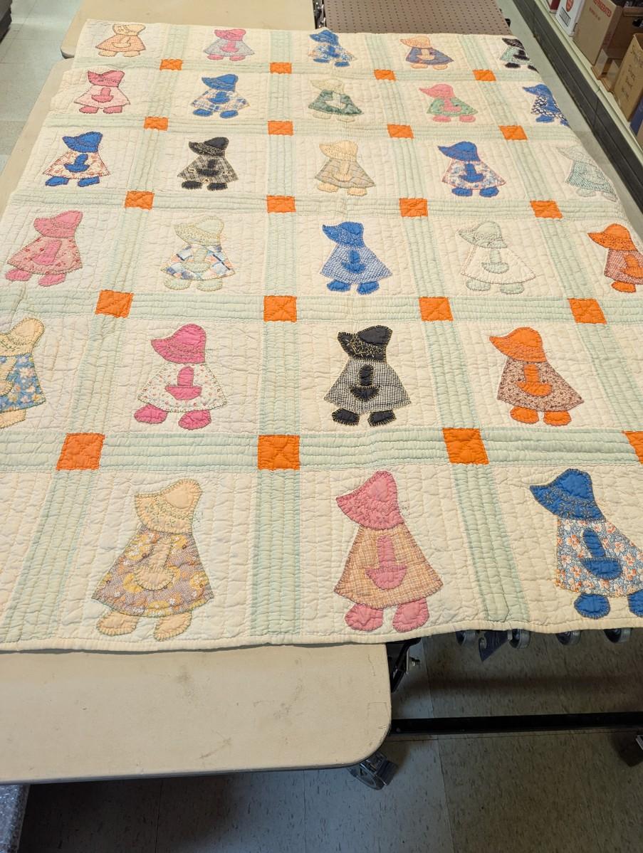 Ca. Early 1930's Applique Quilt With "Sun Bonnet Sue" Pattern Decorated With Embroidered Flowers 75 x 57 Inches #31