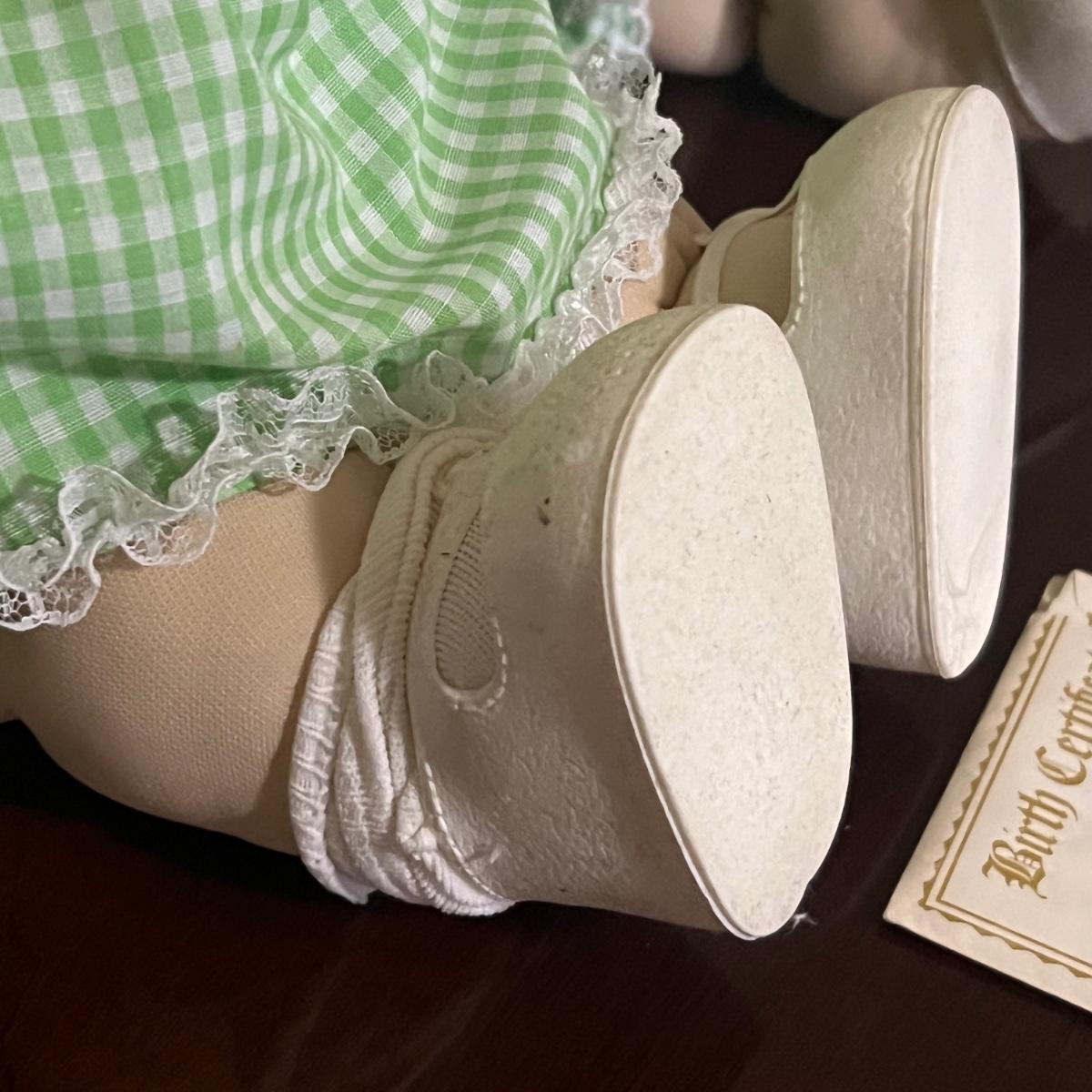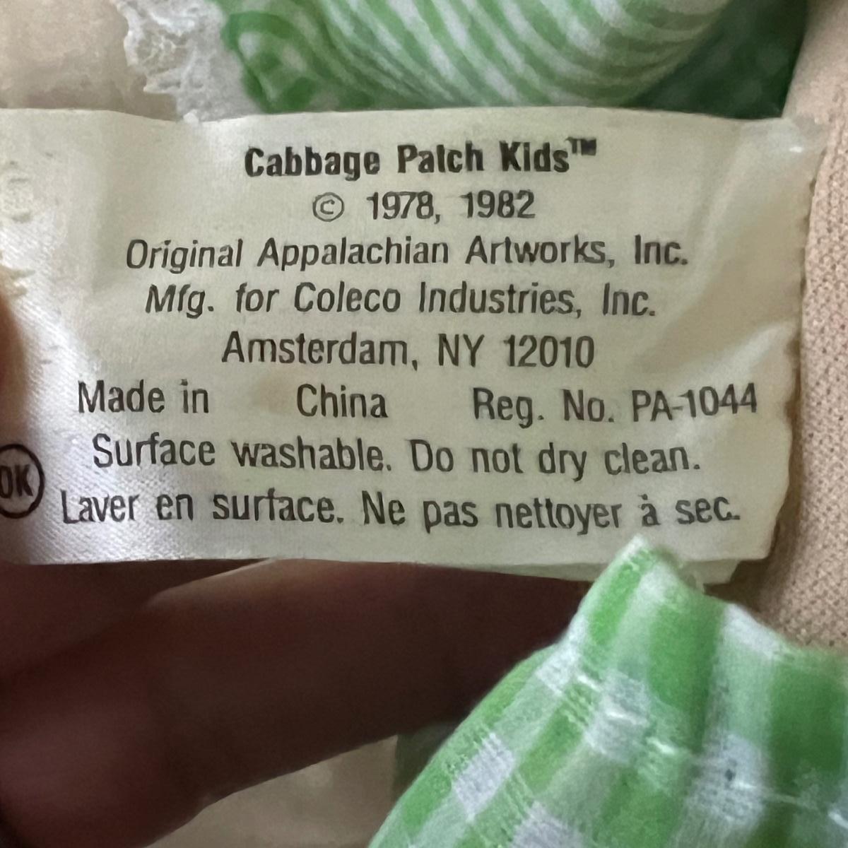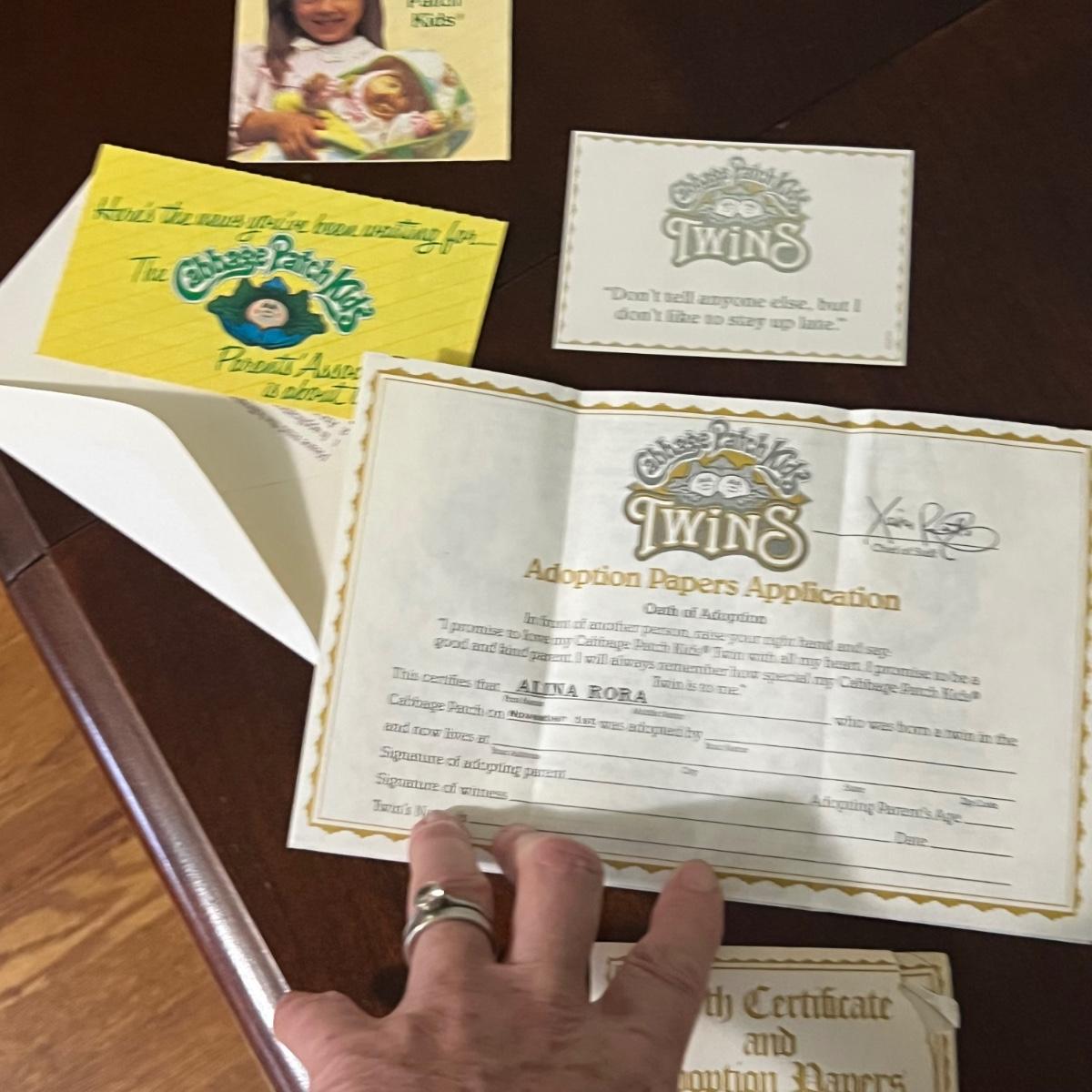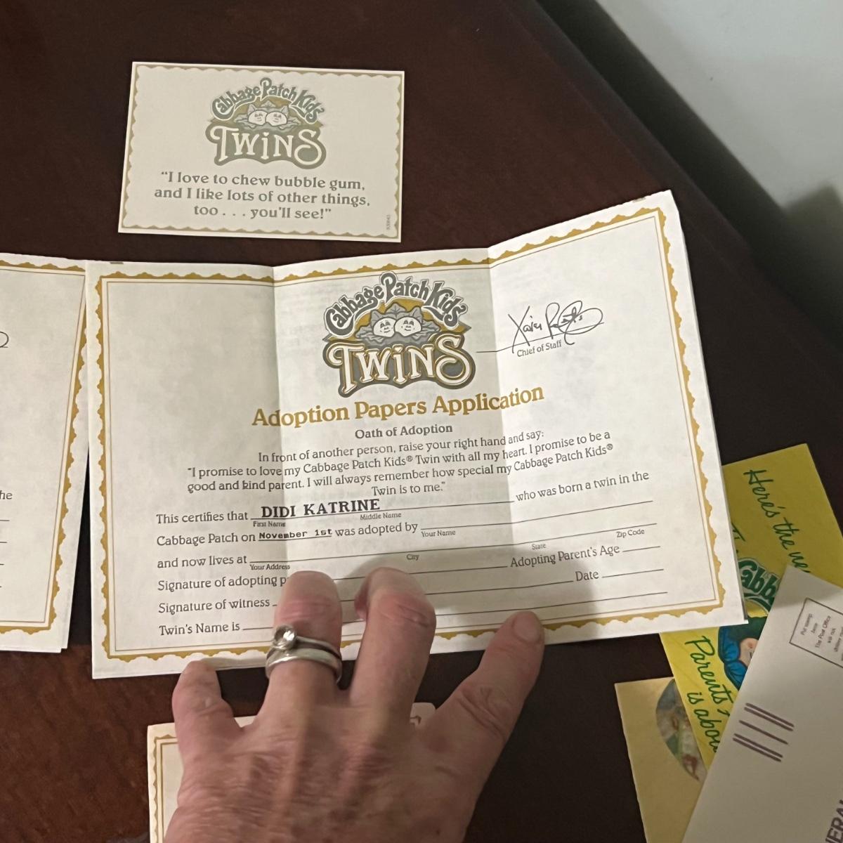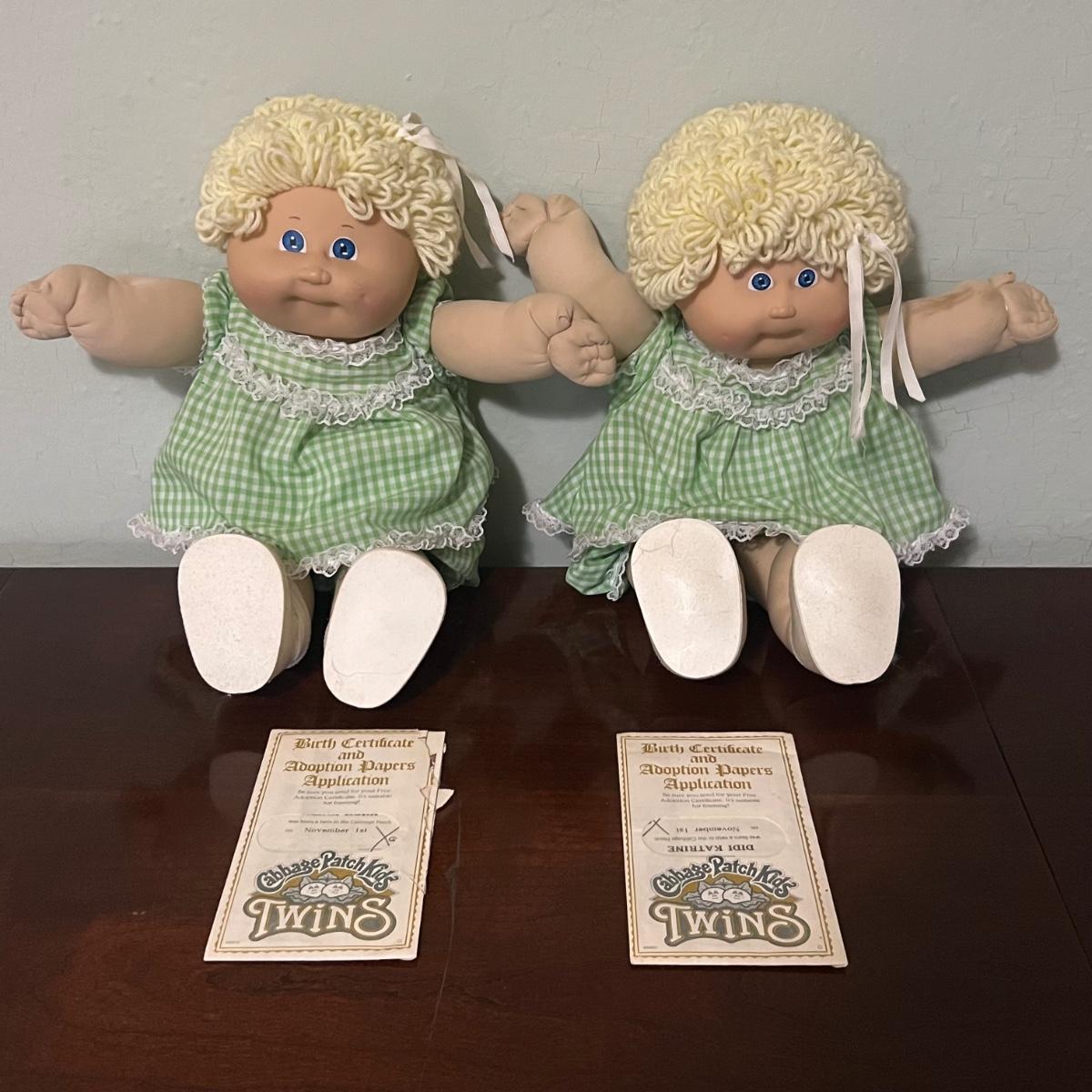 Pair of Cabbage Patch doll twins ‘Didi Kathrine’ and ‘Alina Rora’. Note that the dress on one doll has a stain.
