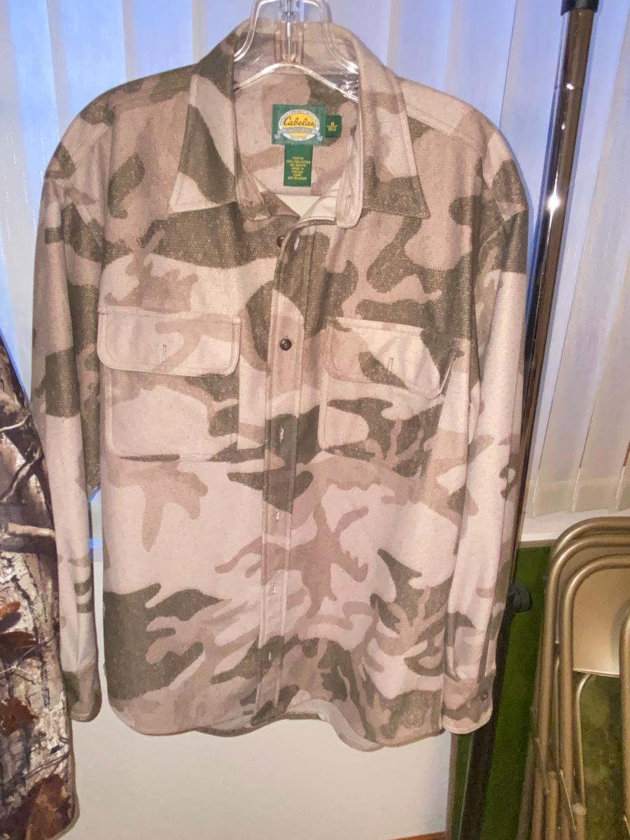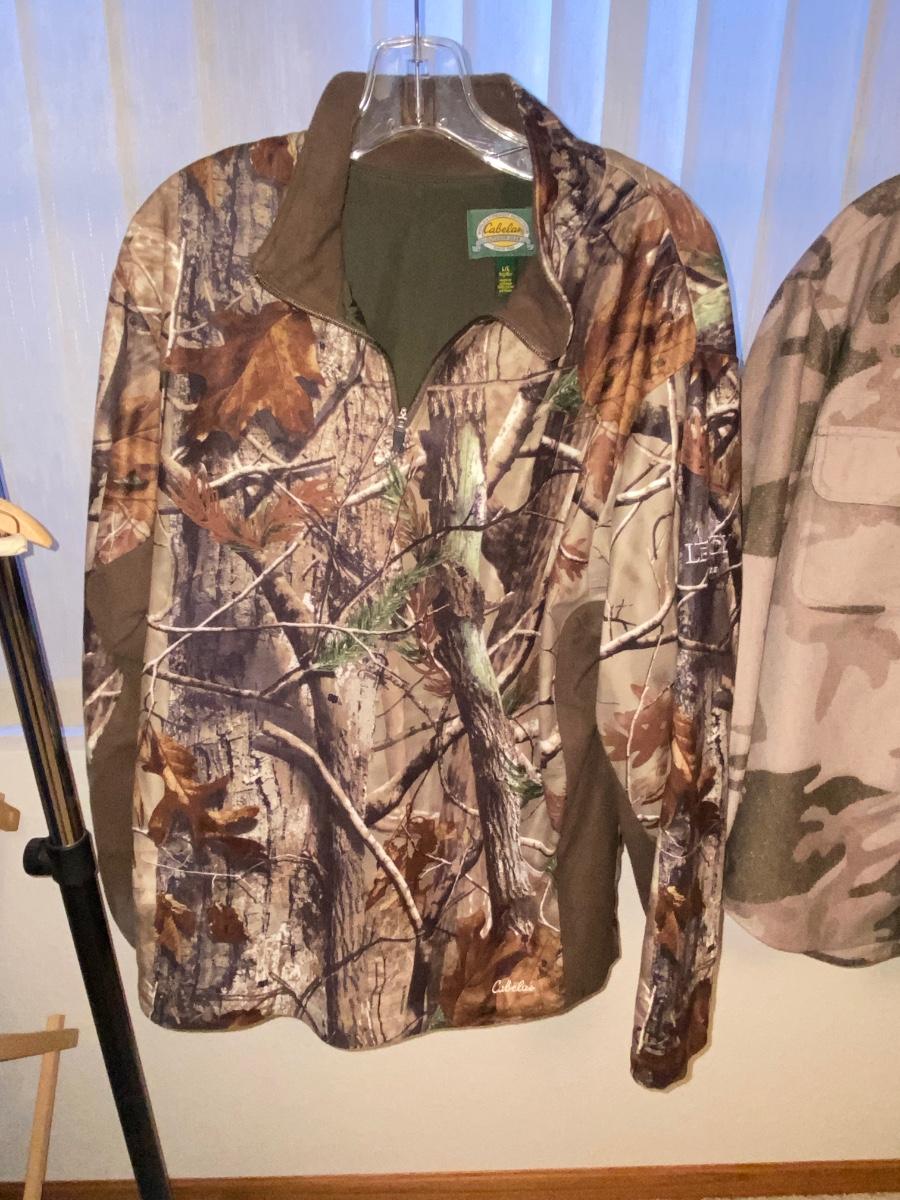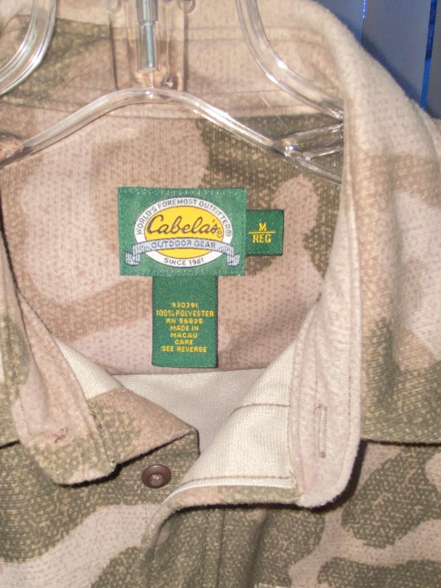 CABELA’S CAMO BUTTON DOWN FLANNEL SHIRT AND SOFT FLEECE PULLOVER .