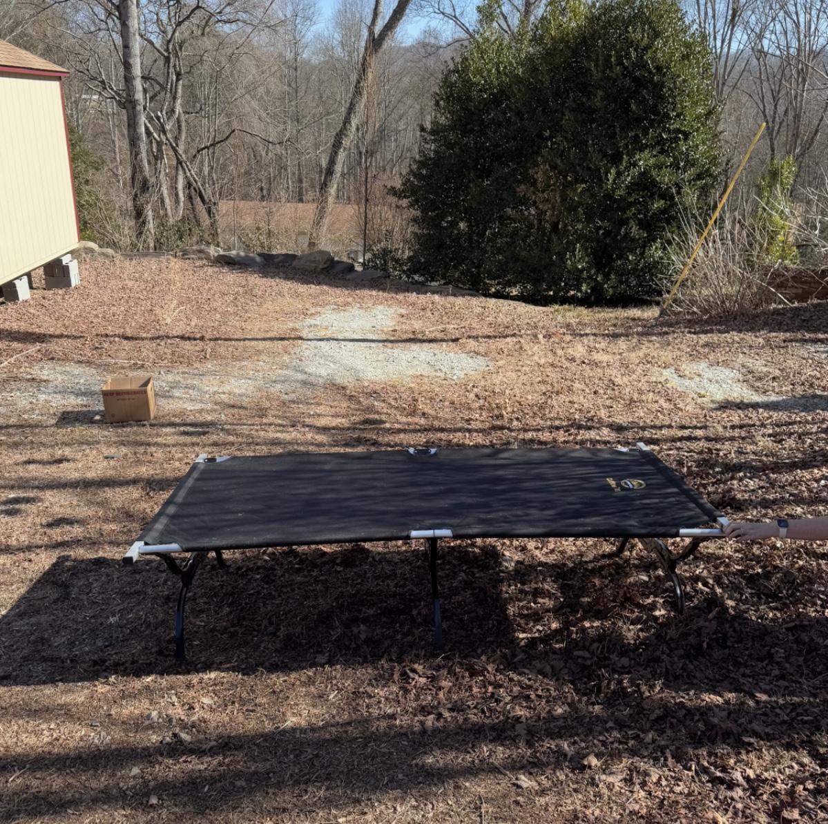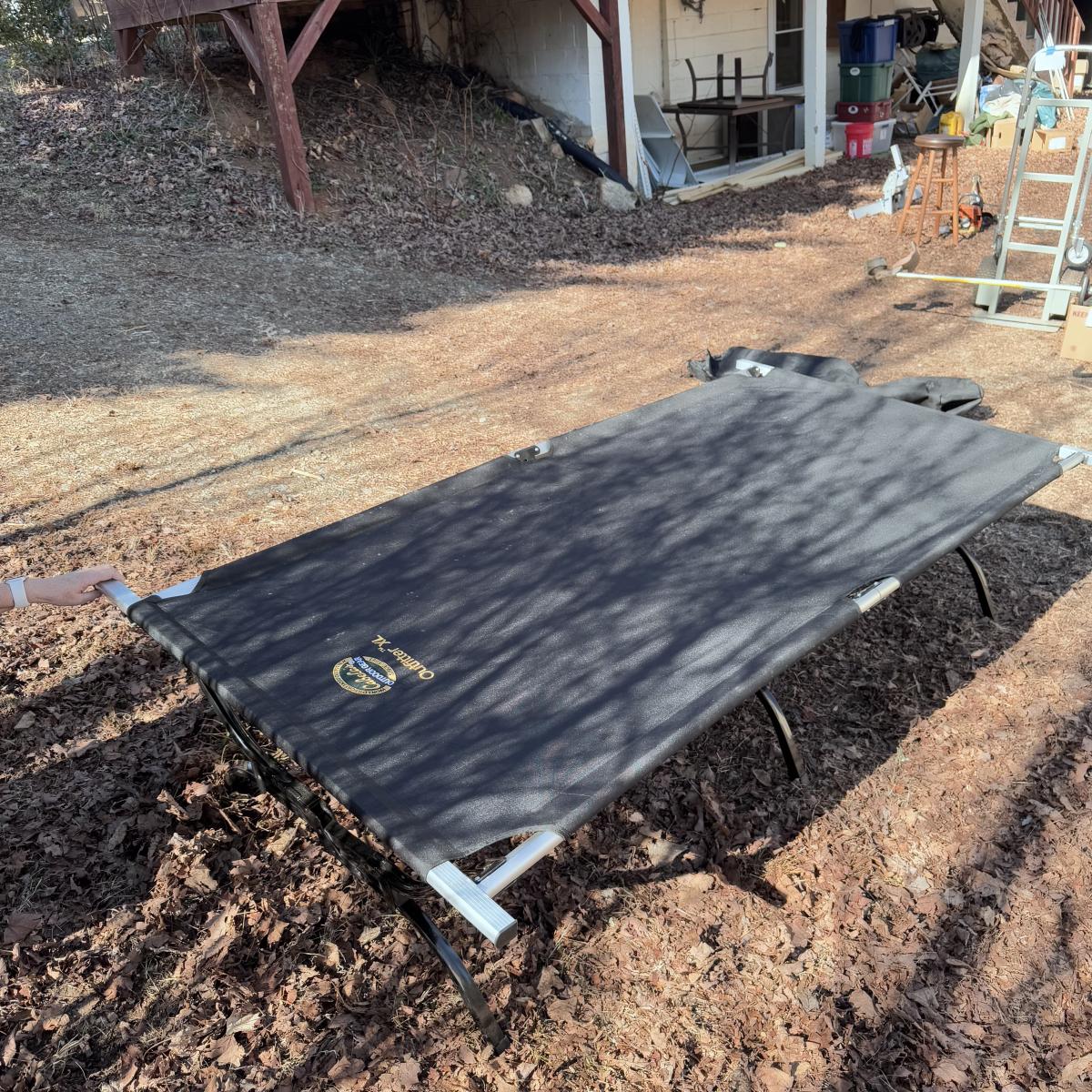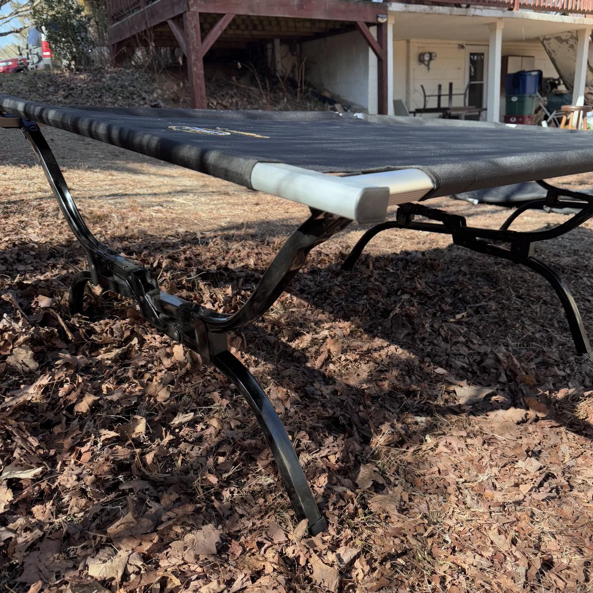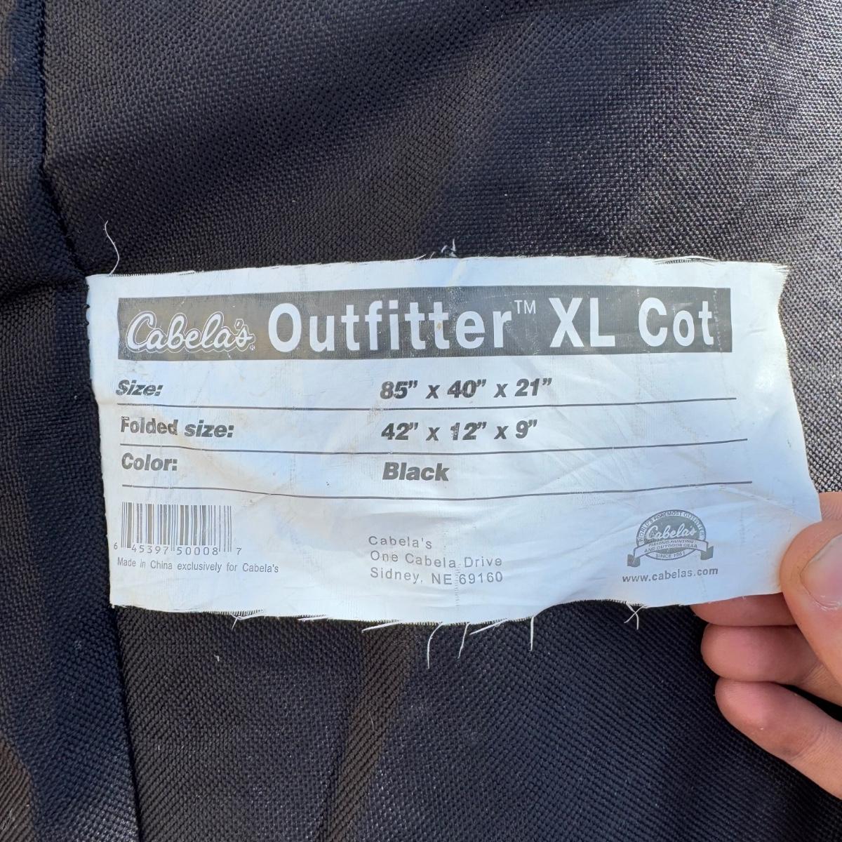 This lot includes one Cabela’s Outfitter XL cot. When fully opened, the cot measures 85” x 40” x 21”H. When closed it measures 42” x 12” x 9”H. The two silver pieces pictured go on the ends of the cot for extra support. Local pickup only.