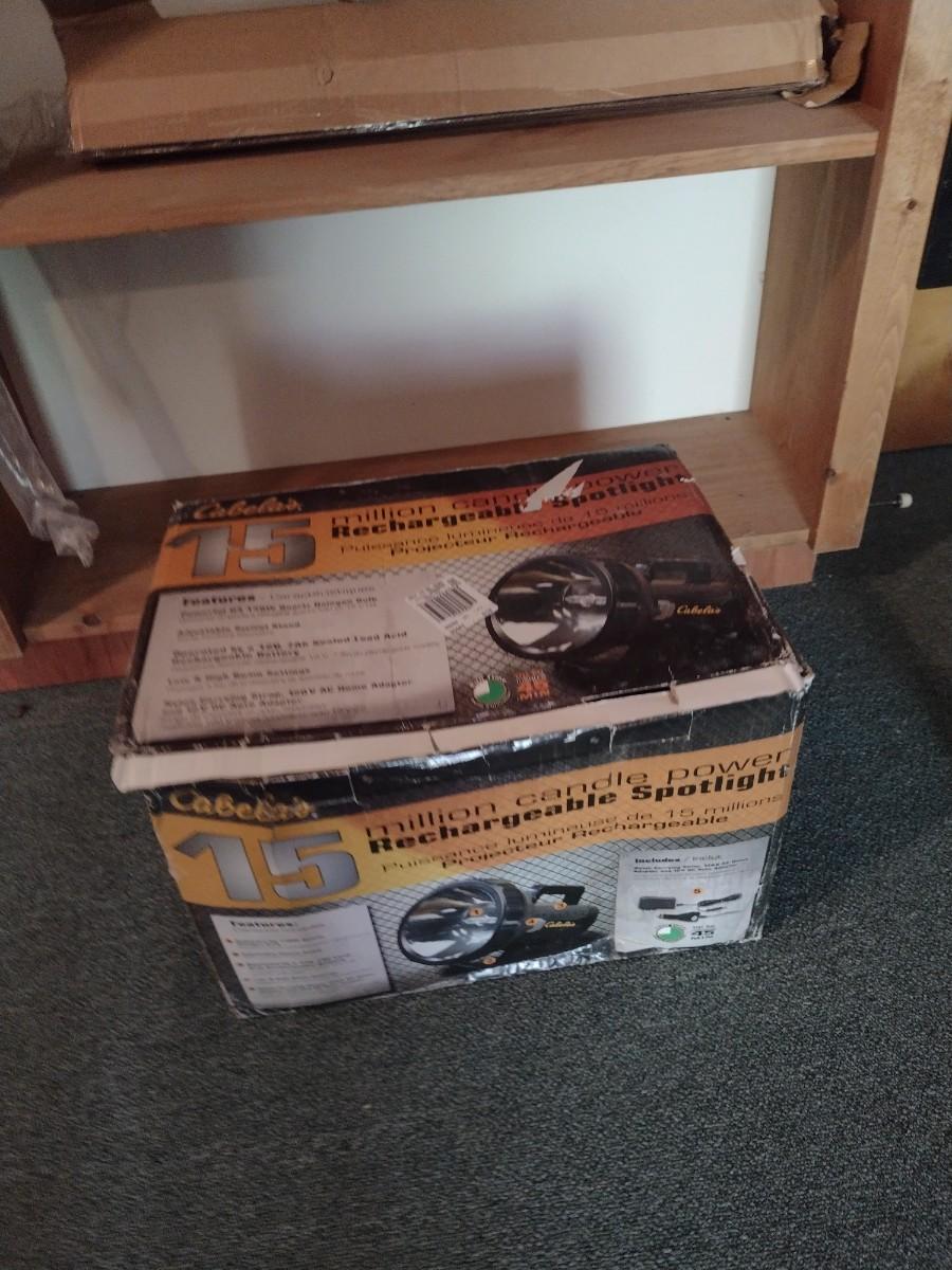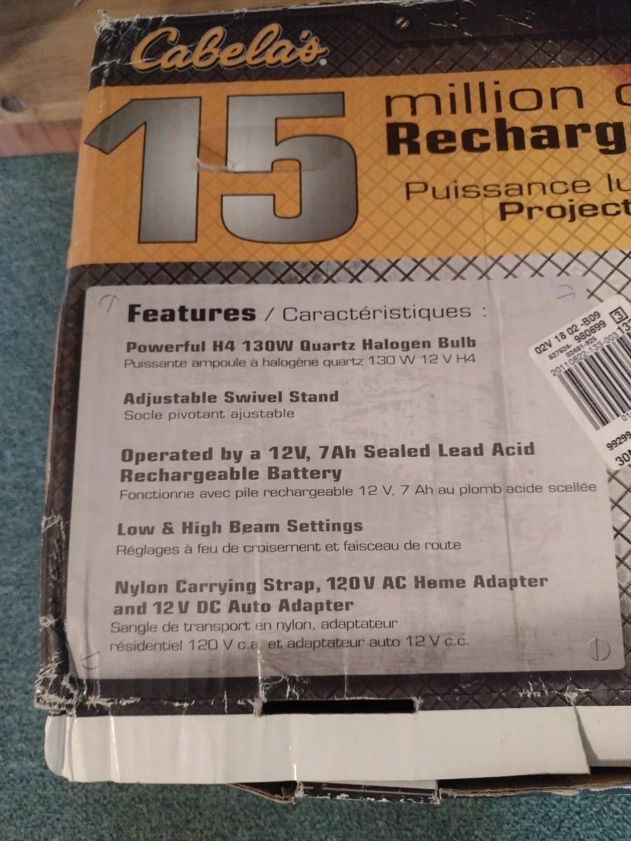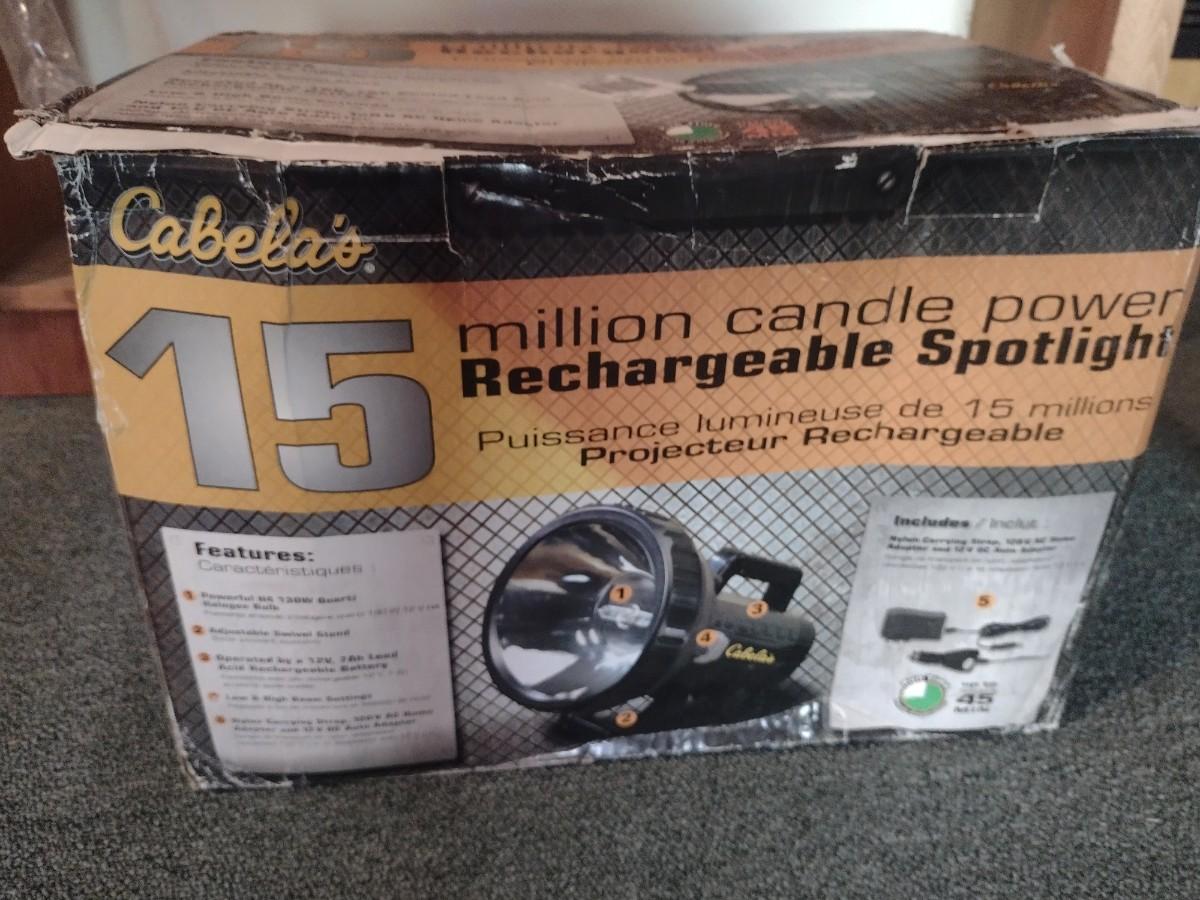 Cabela's Rechargeable Spotlight. Untested, but appears to be unused. PLEASE NOTE:. Due to no internet connection or wireless service, all invoices must be prepaid via PayPal, Stripe, or Zelle prior to arrival at pick up. Exact change cash onsite is acceptable but absolutely no debit or credit cards at time of pick up.