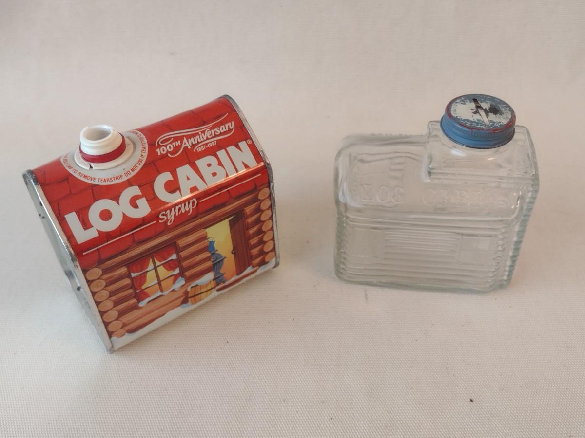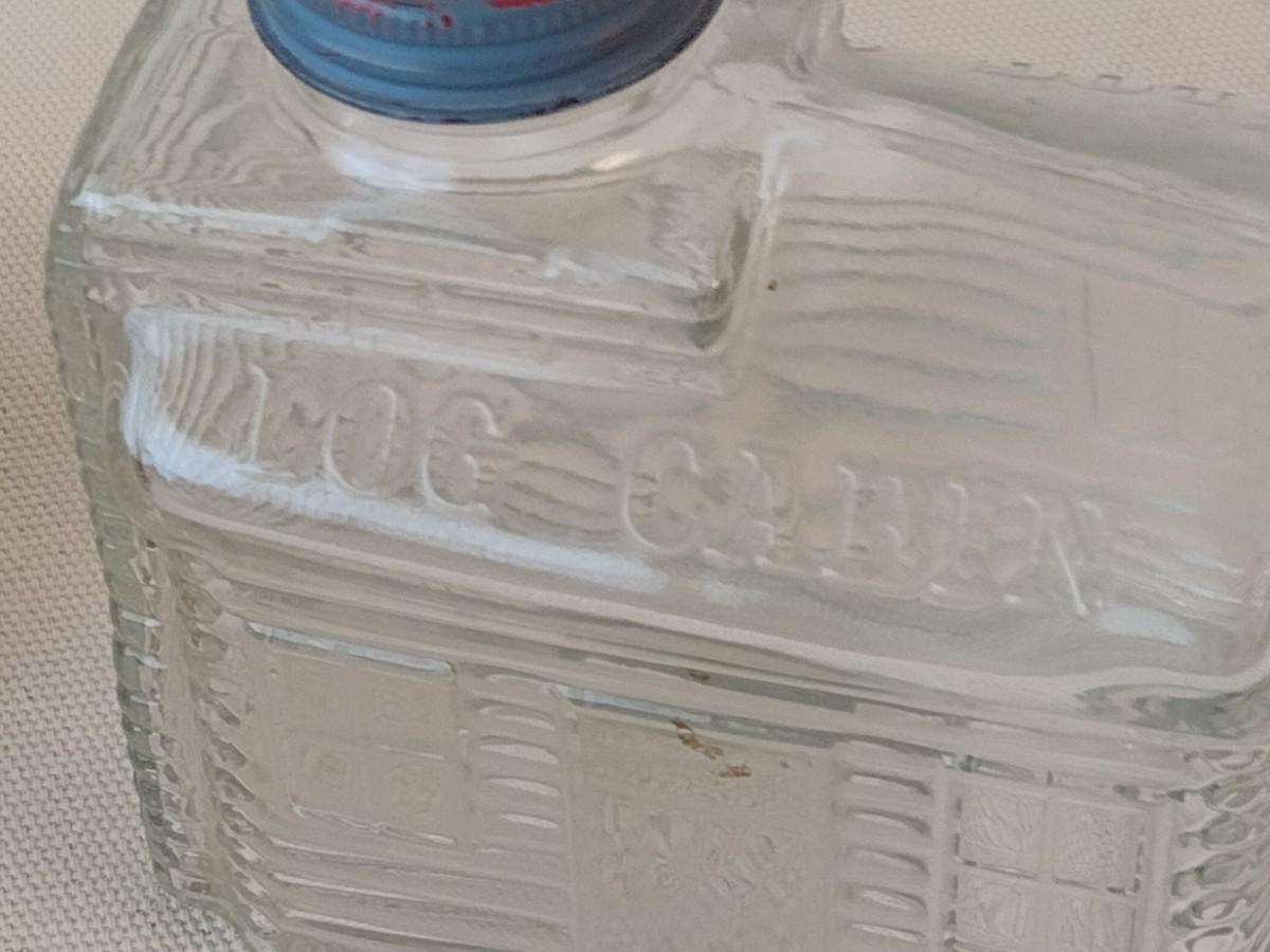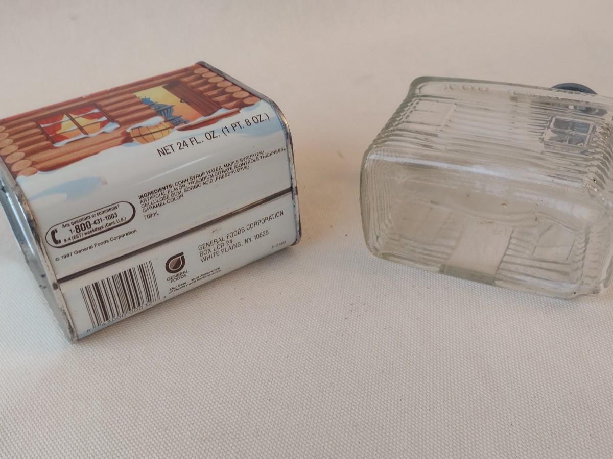 Vintage Log Cabin Glass Syrup Bottle with Coin Slot Lid includes Collector Tin
