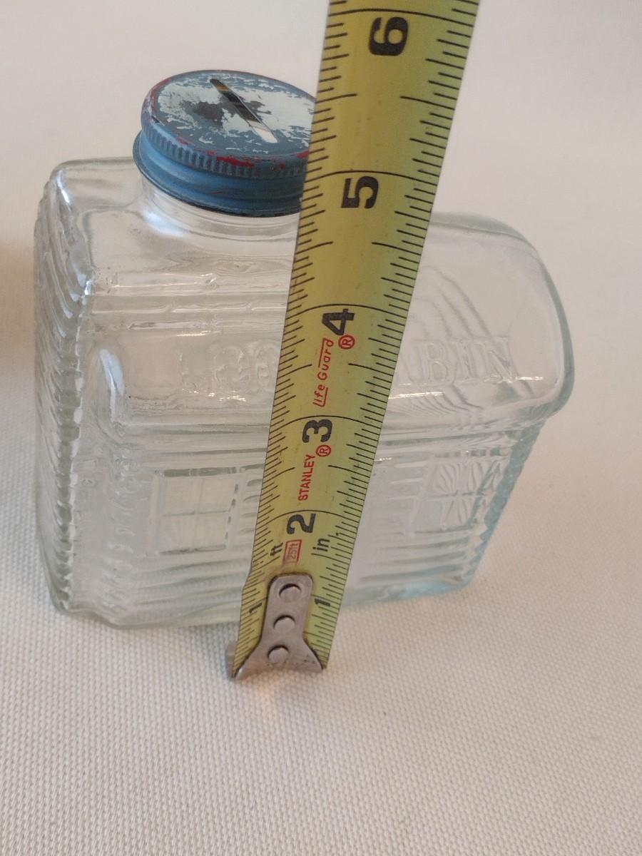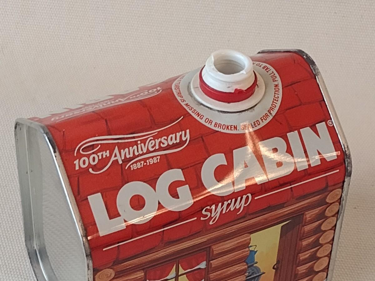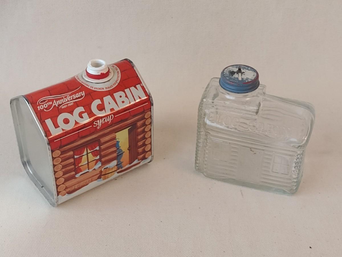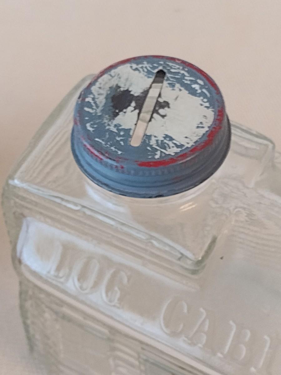 Vintage Log Cabin Glass Syrup Bottle with Coin Slot Lid includes Collector Tin