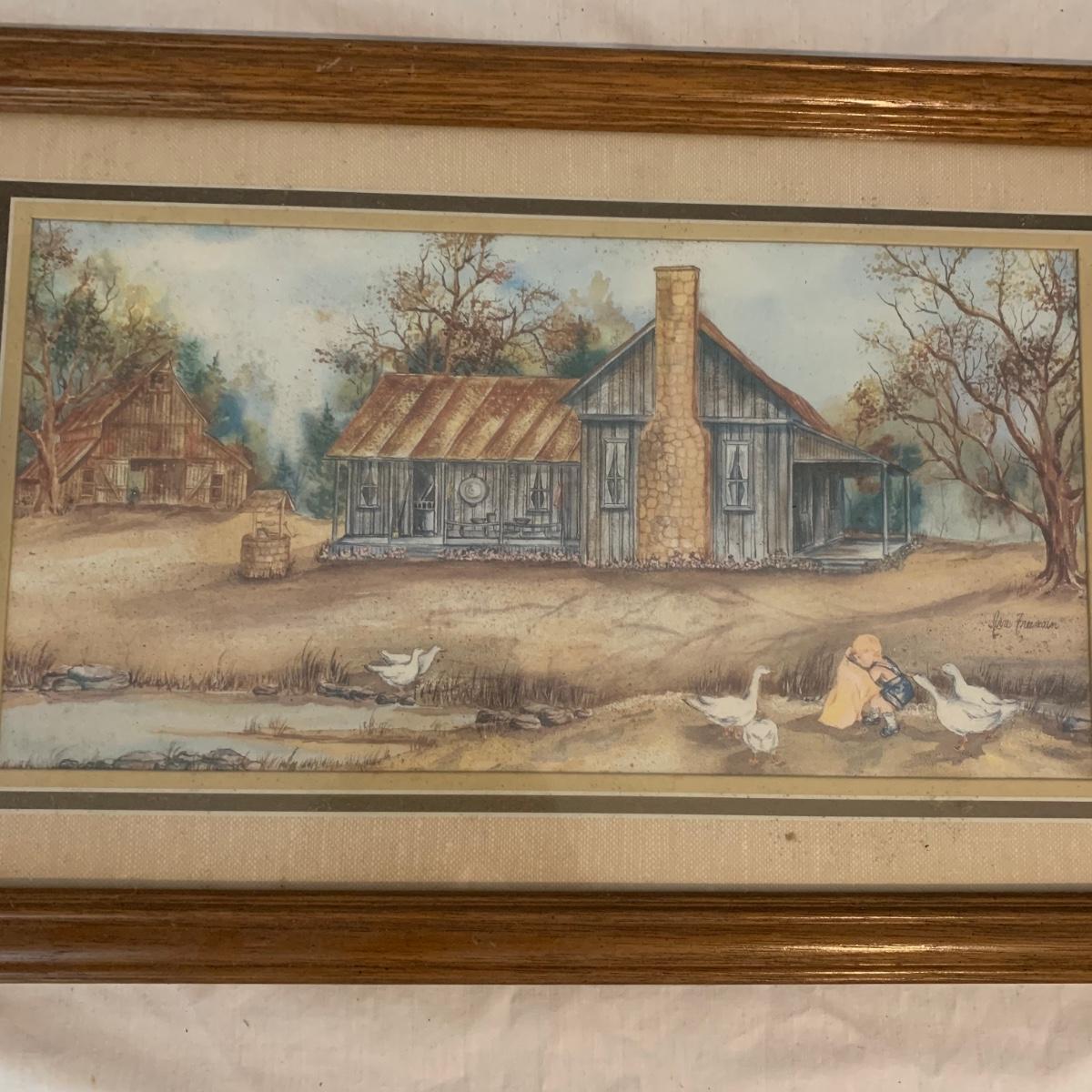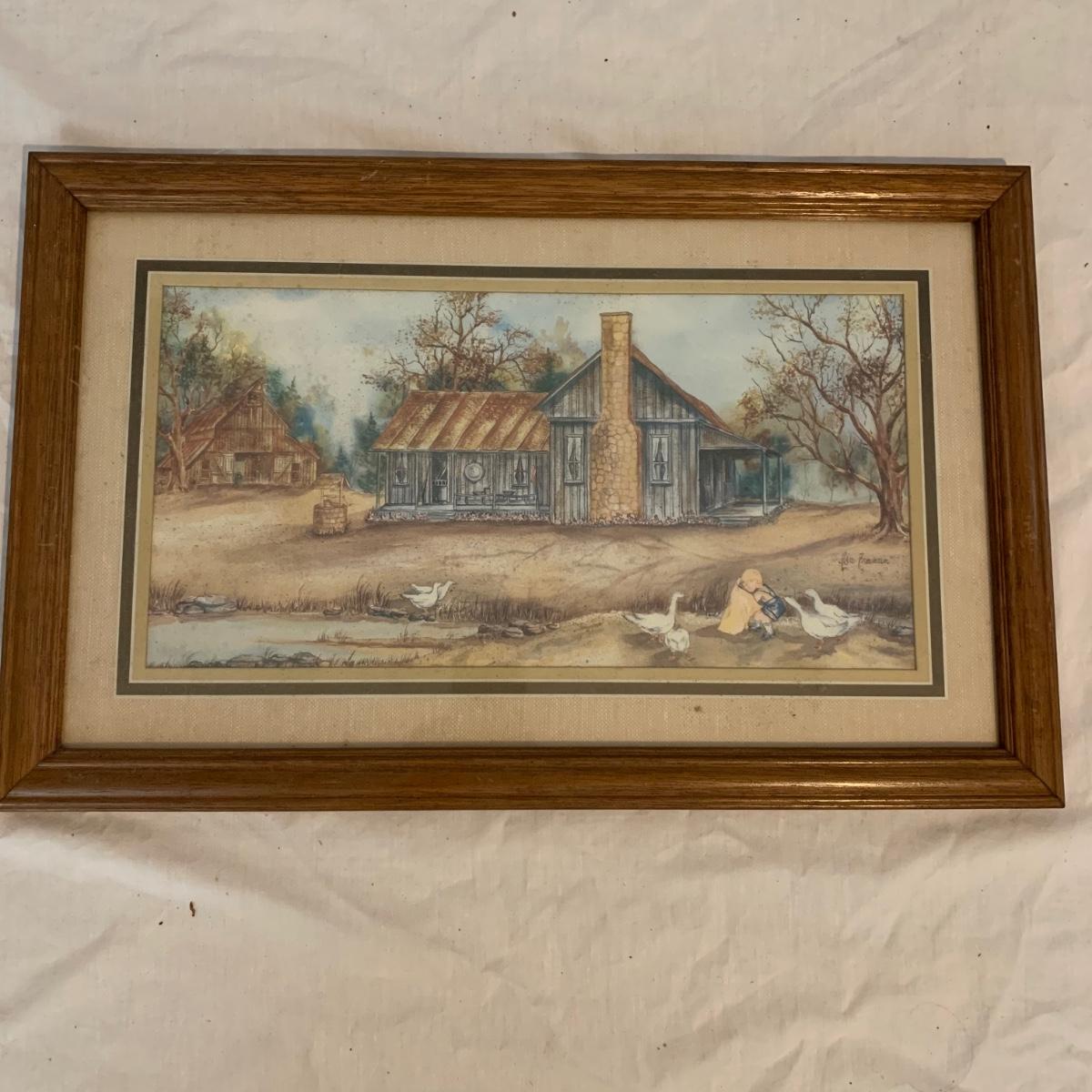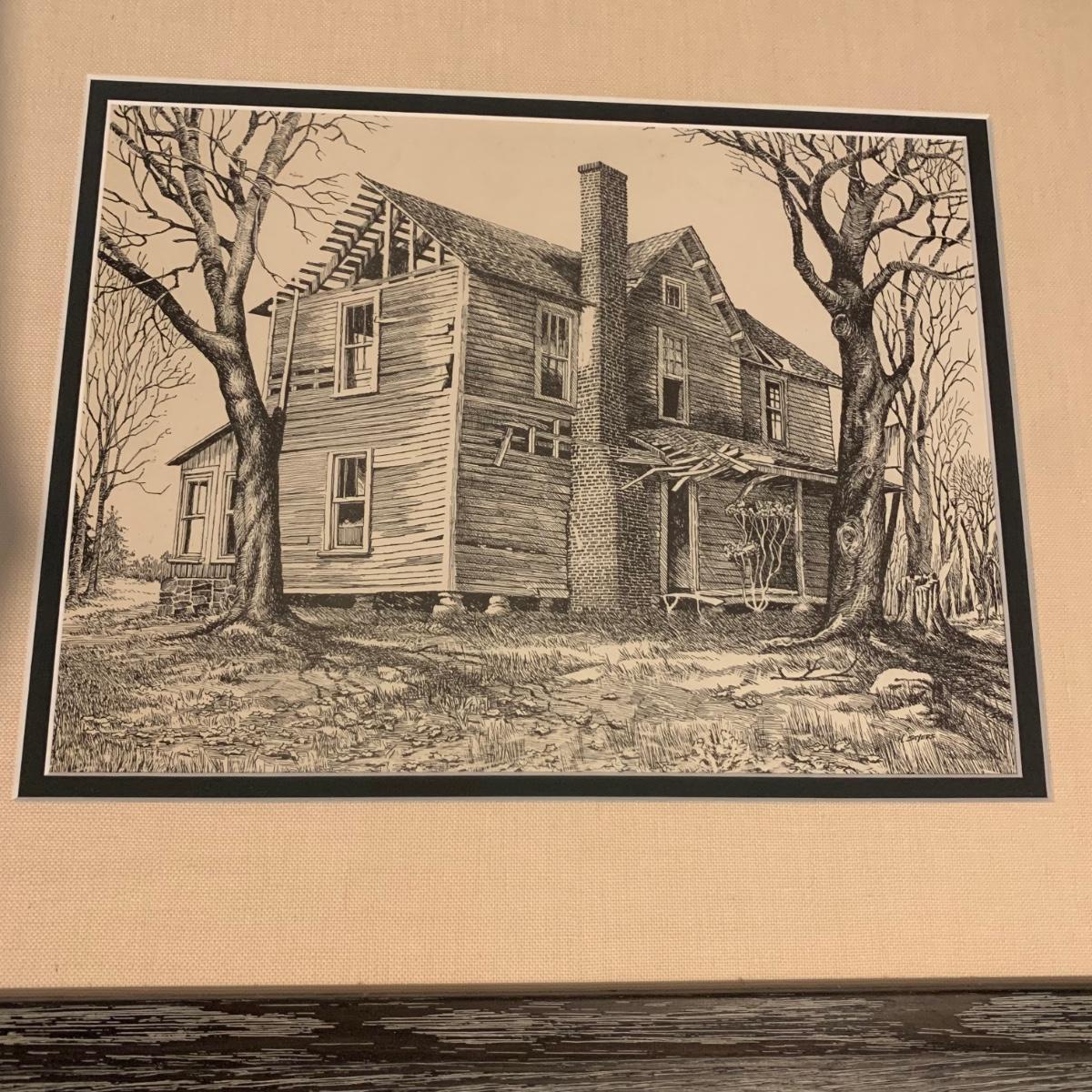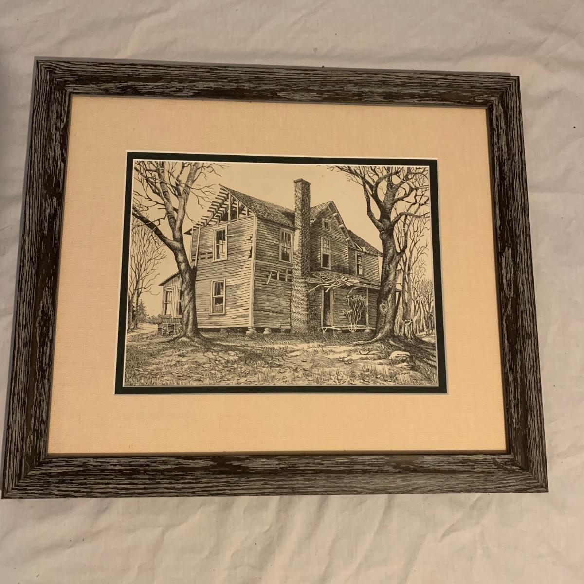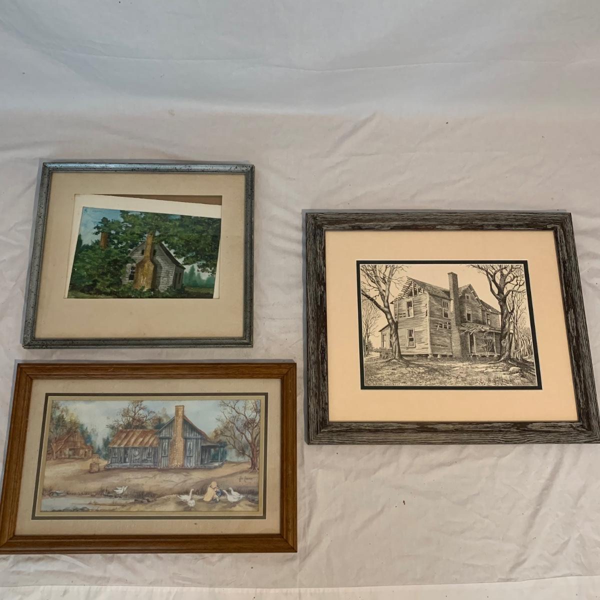 This lot includes three framed and matted art pieces. Included is one black and white print by H. Styers, one watercolor piece, and one warm colored print by Ana Freeman. The prints and frames are all in good condition. The watercolor will need to be readjusted in its frame. The largest frame measures about 23in x 19.5in. Shipping available. Shipping art can be costly. We suggest calling our local UPS with dimensions and getting an estimate before bidding. (828) 252-6930.