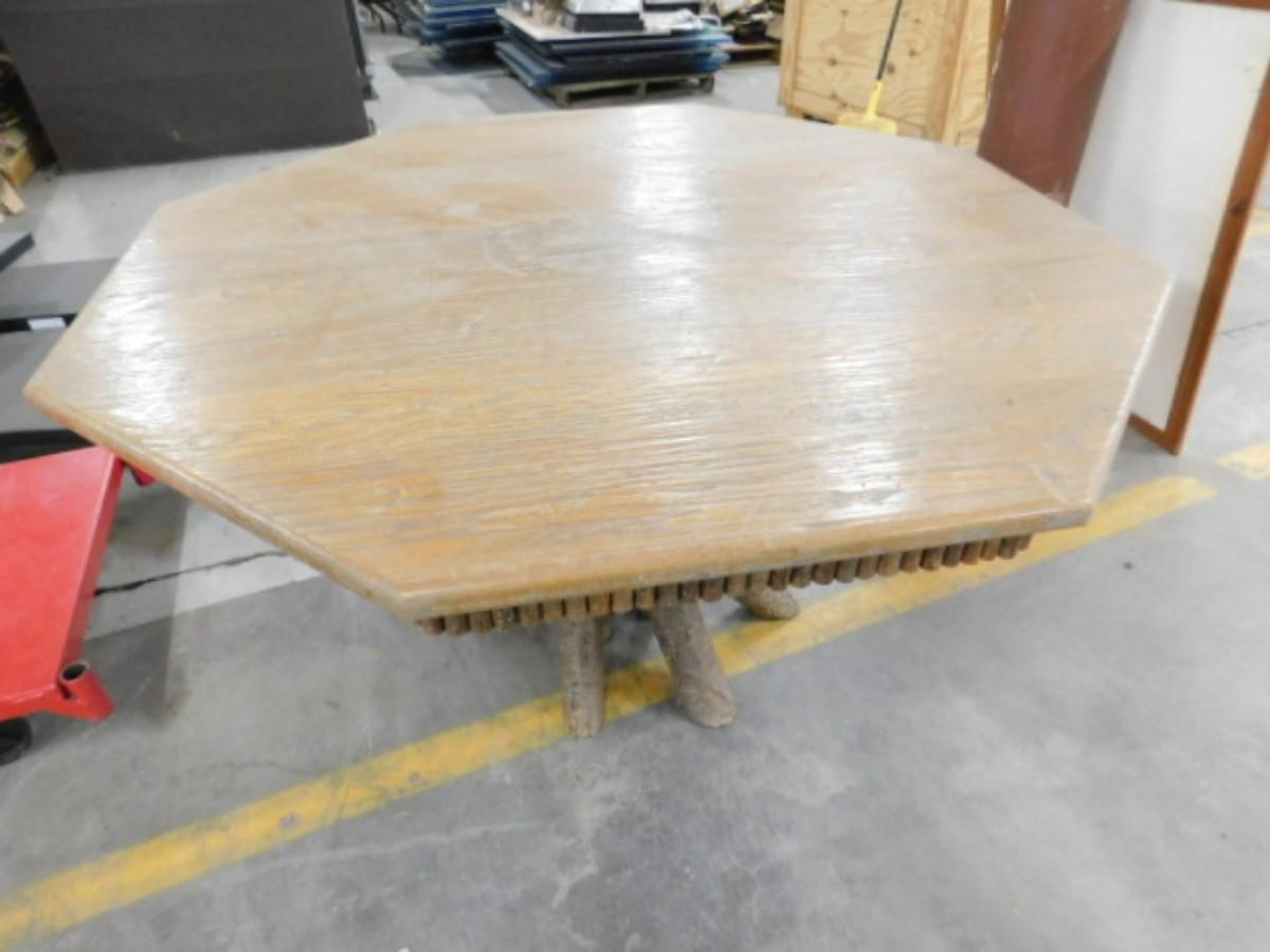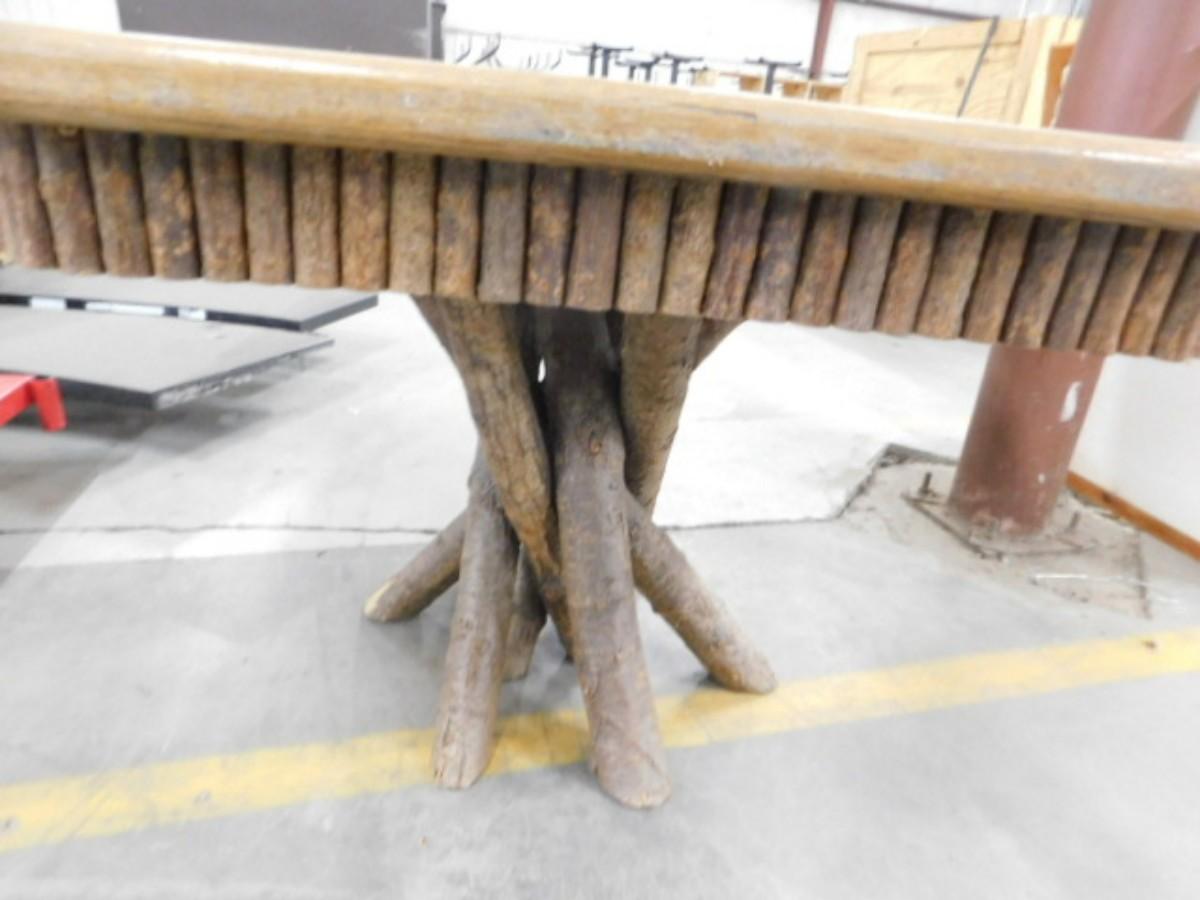 Cabin Style Wood Table with Tree Branch Pedestal has some wear to the finish as shown