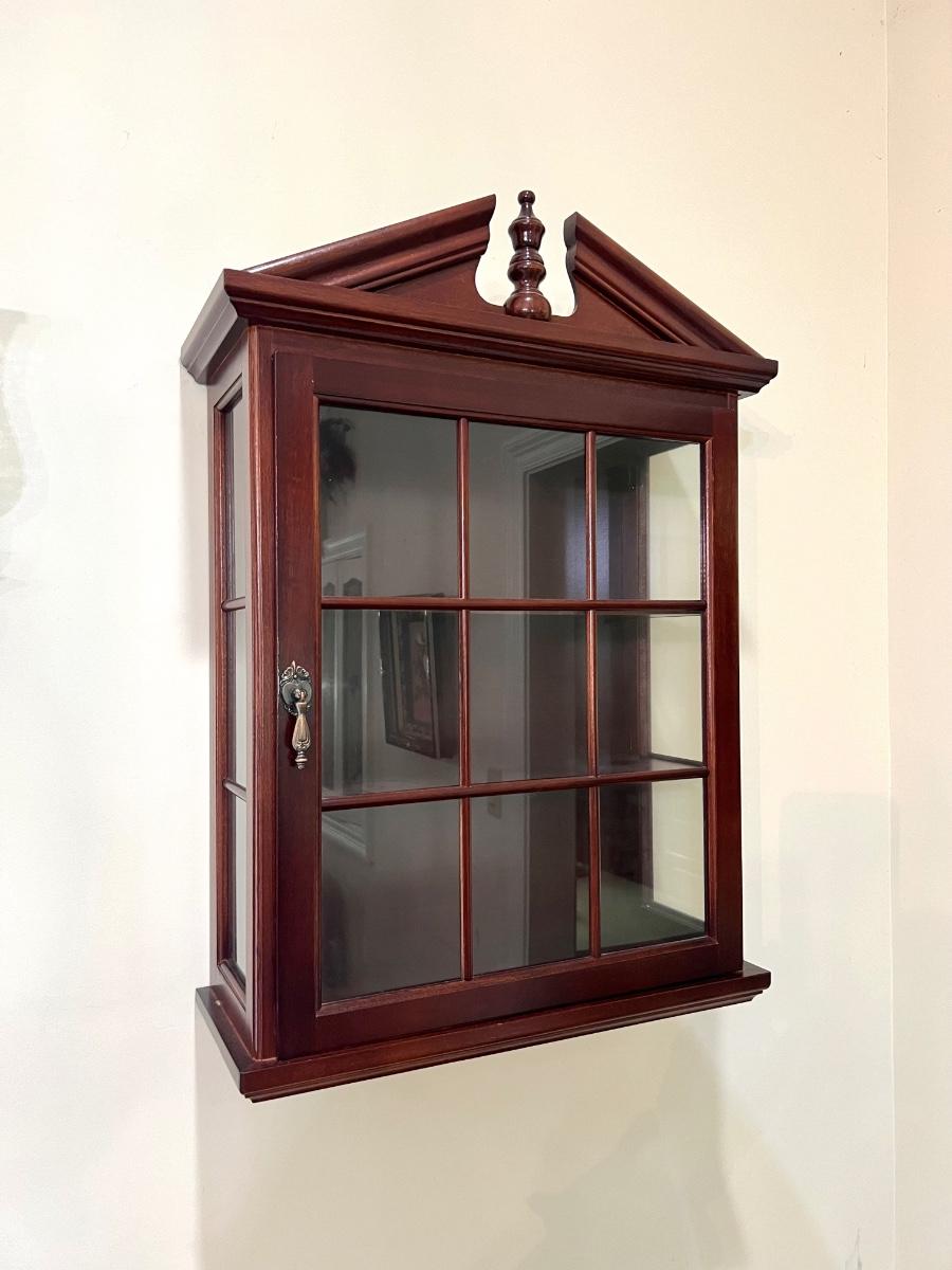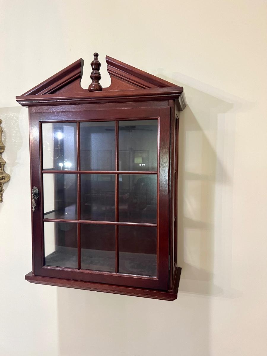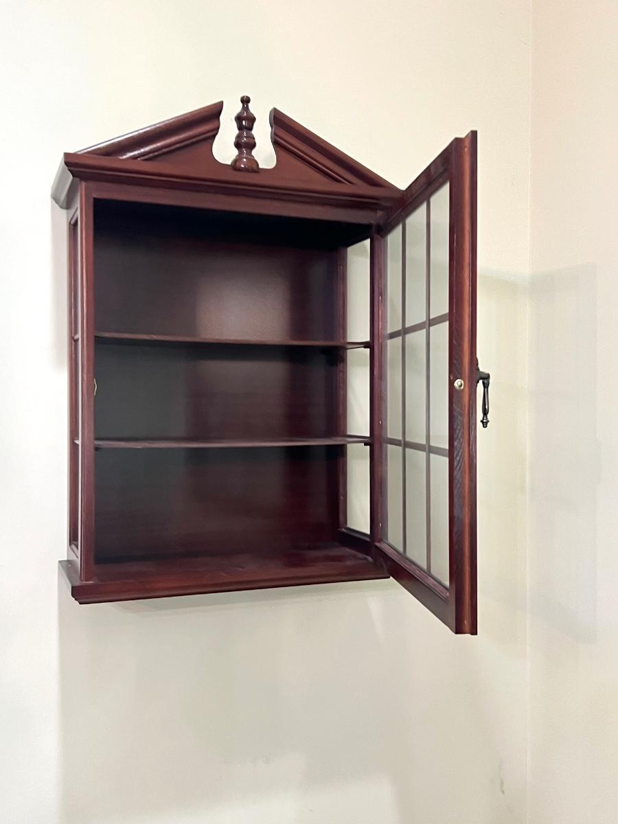 Cherrywood, wood Hanging Display Cabinet. Measures 28 inches tall, 19 inches wide and 7 1/2 inches deep.