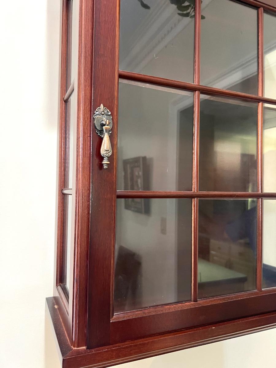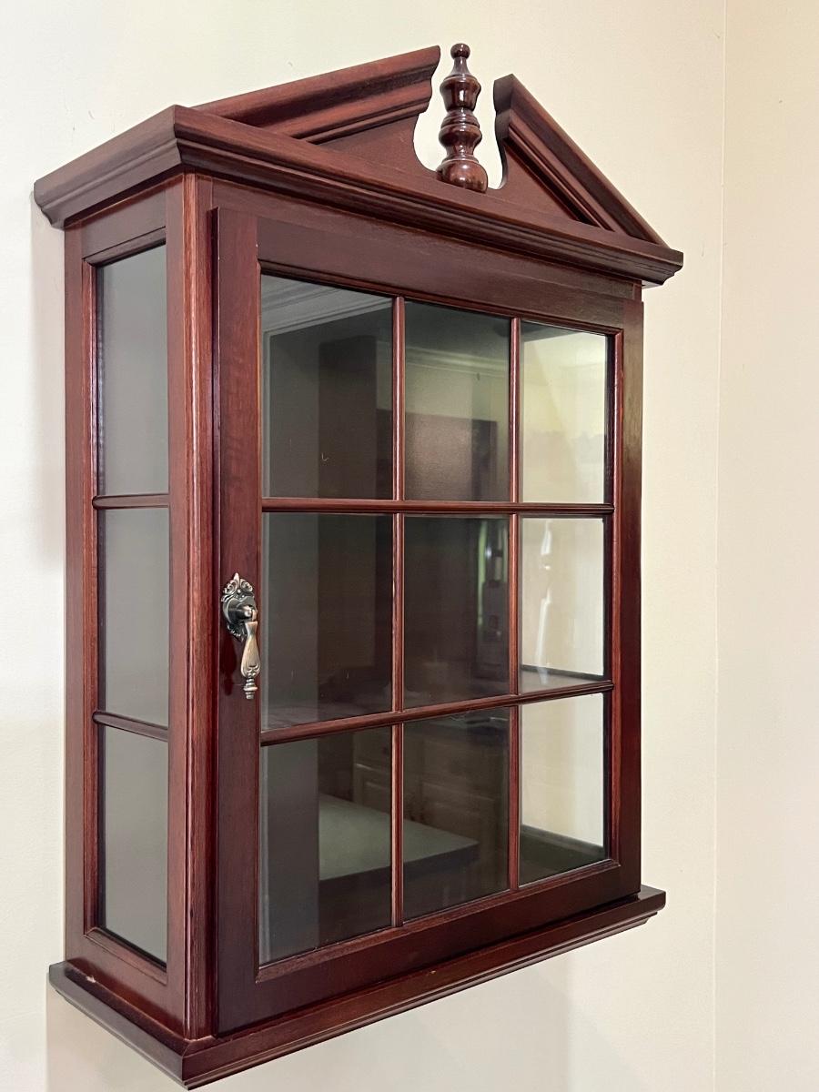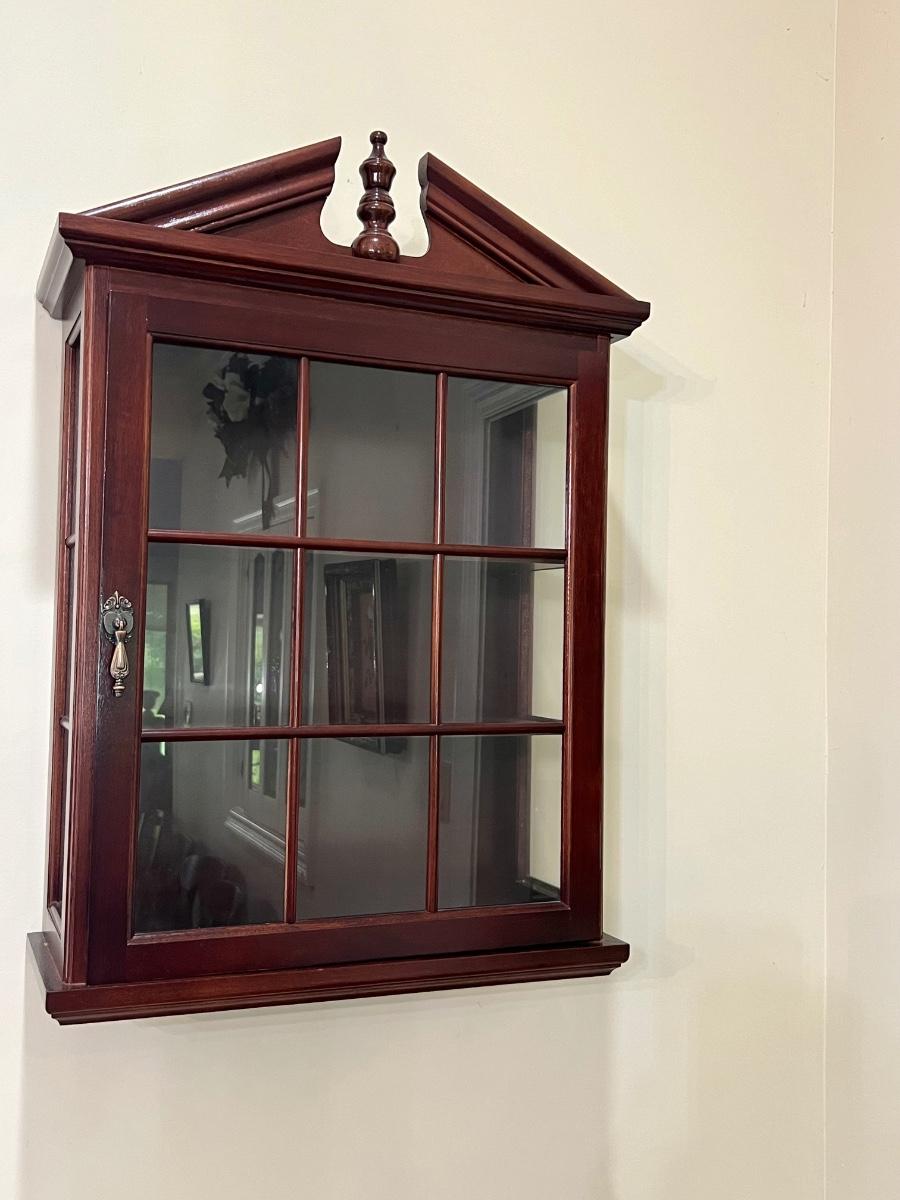 Cherrywood, wood Hanging Display Cabinet. Measures 28 inches tall, 19 inches wide and 7 1/2 inches deep.