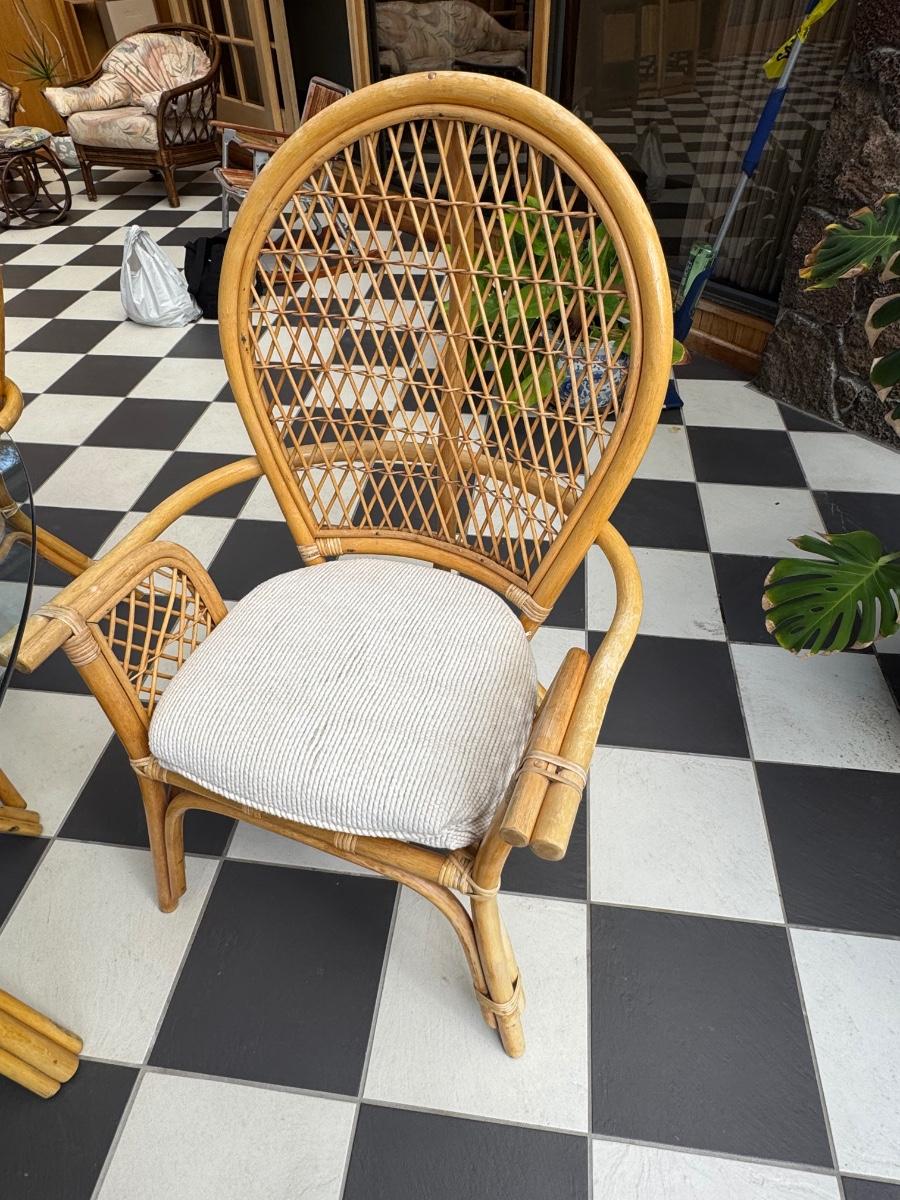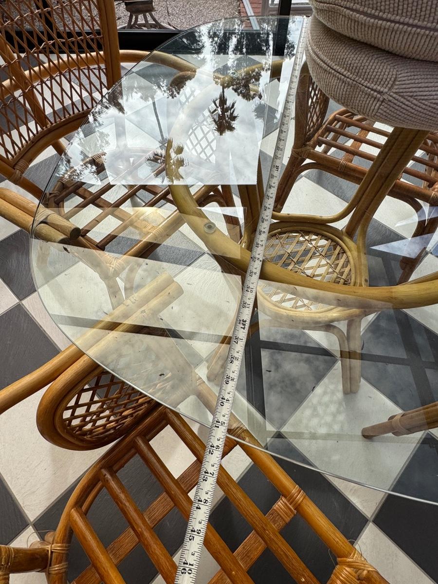 Used condition. The glass top has some scratches. Each chair needs some work. One chair has more visible damage on the back than the others. Sold AS IS. Please take a look at the pictures for condition and measurements.
